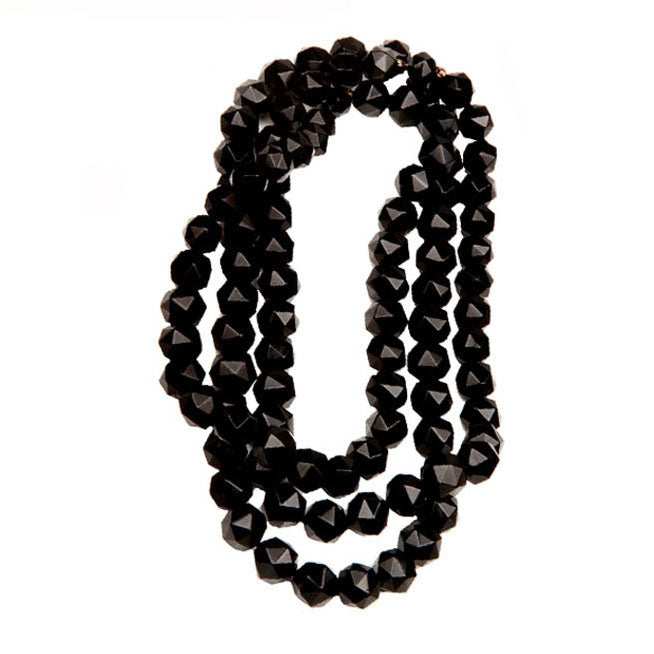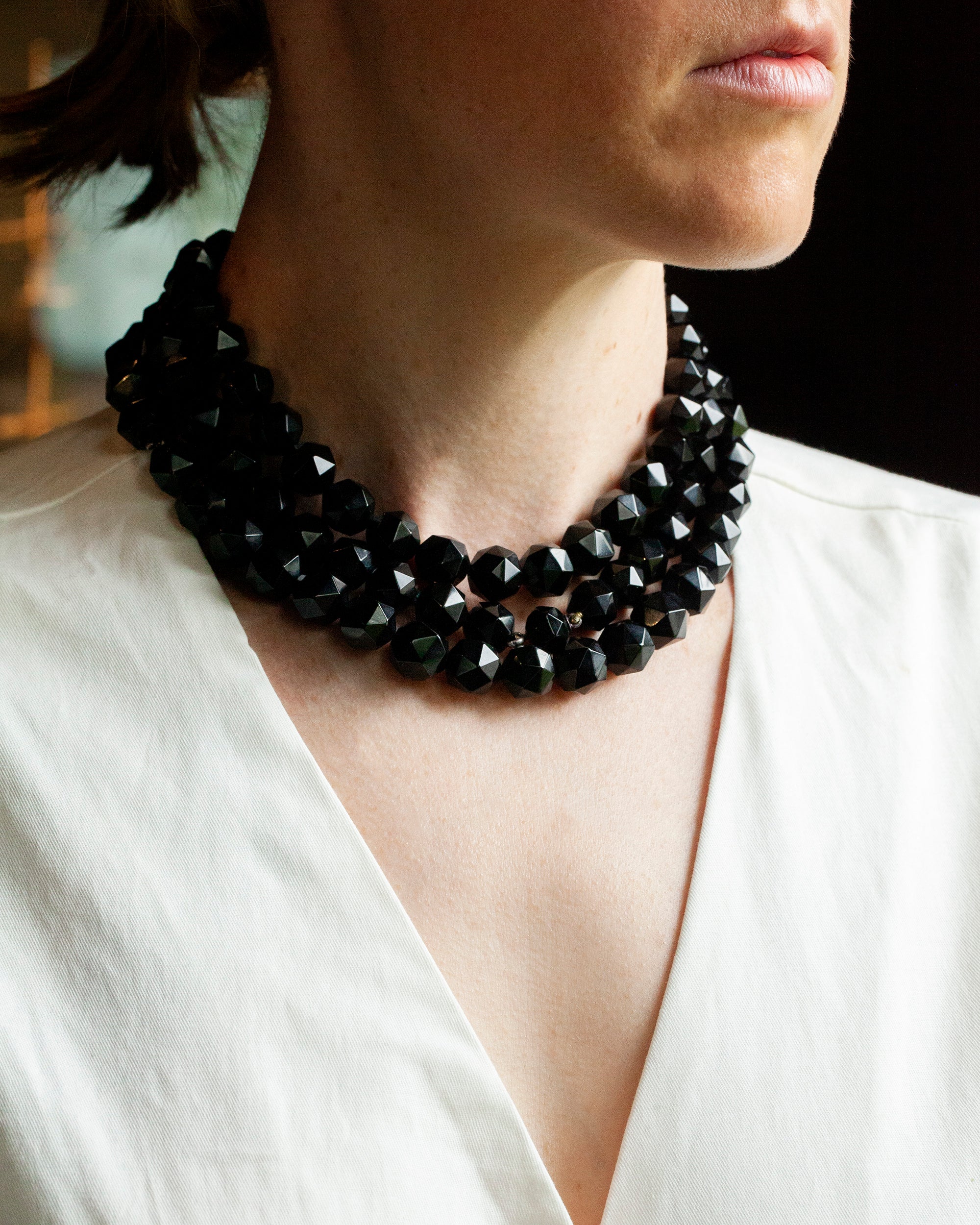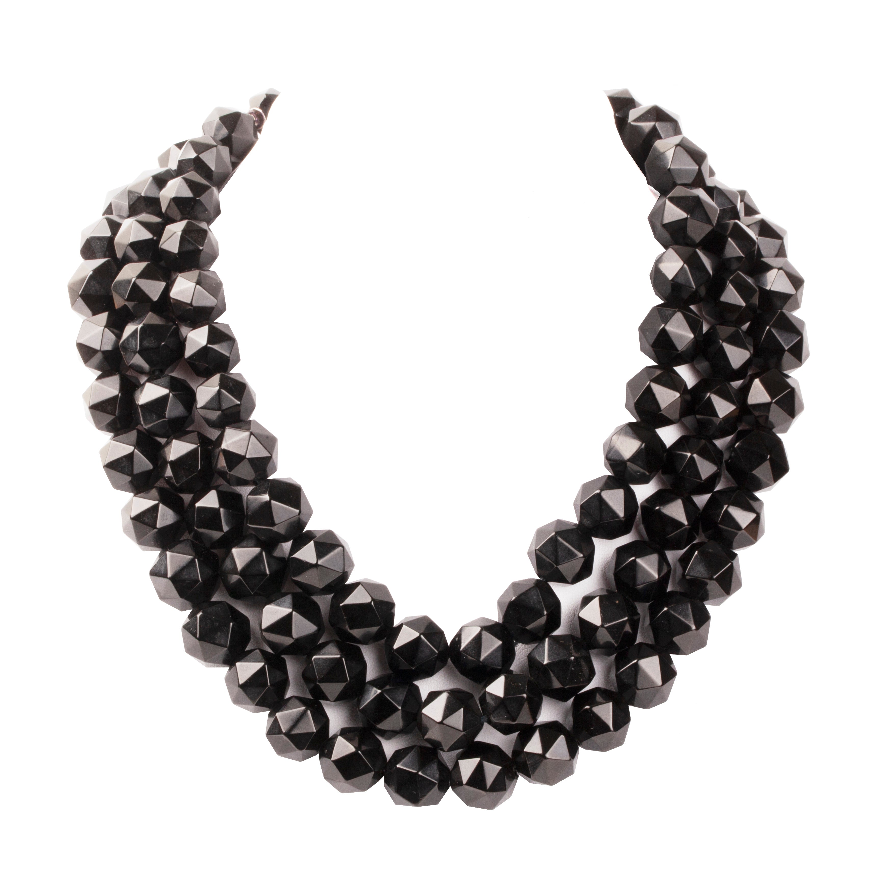 Victorian era Whitby Jet necklace set. Three strands stack together to form a collar necklace. Each necklace can be worn separately. The clasps are cleverly hidden within carved beads. The two shorter strands can be worn together to form a 32" strand. English in Origin. Circa 1860.