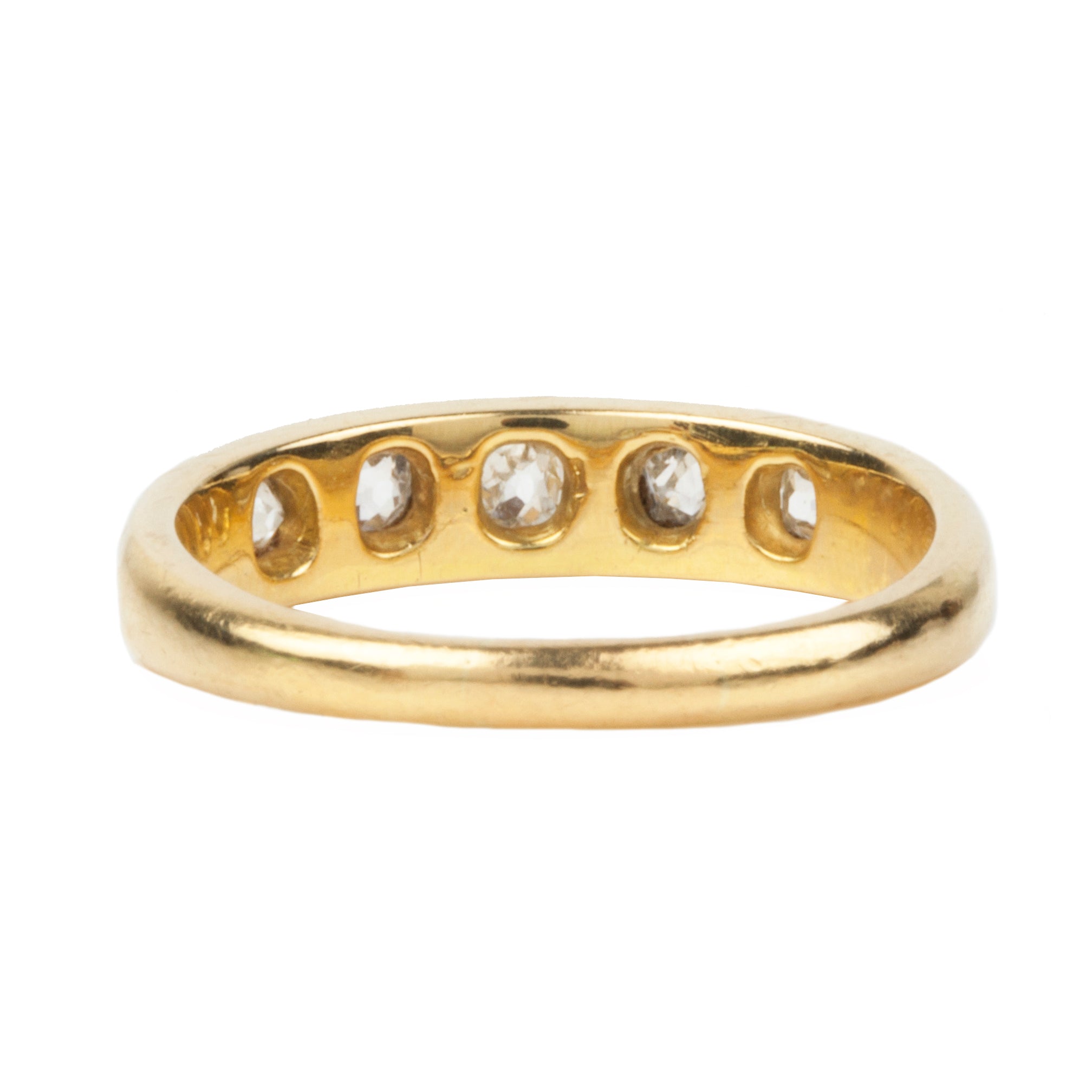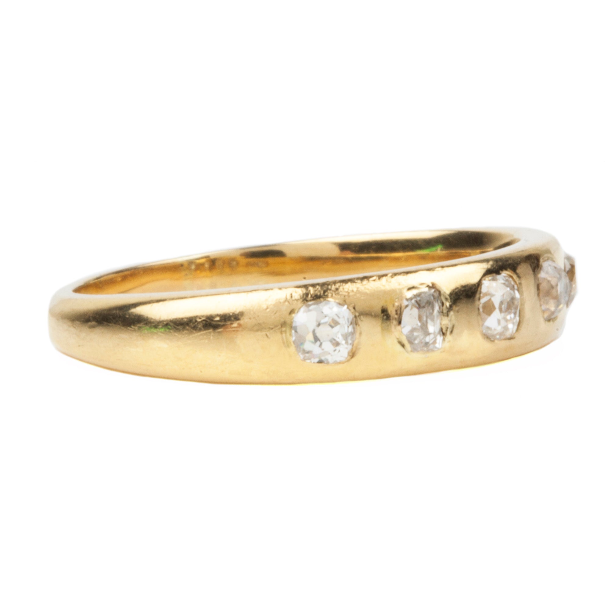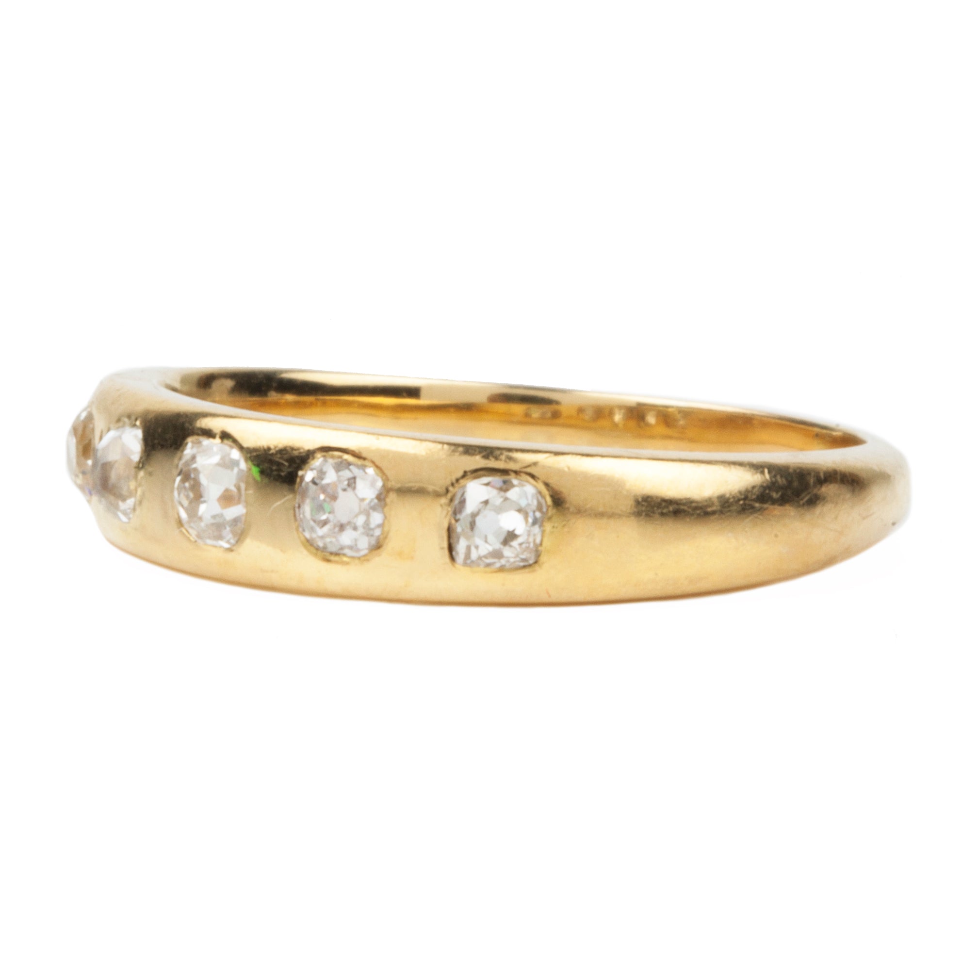 Victorian era Old Mine cut diamond ring, in 18k gold. Five diamonds set in gypsy style setting. Enligsh in origin. Circa 1890.