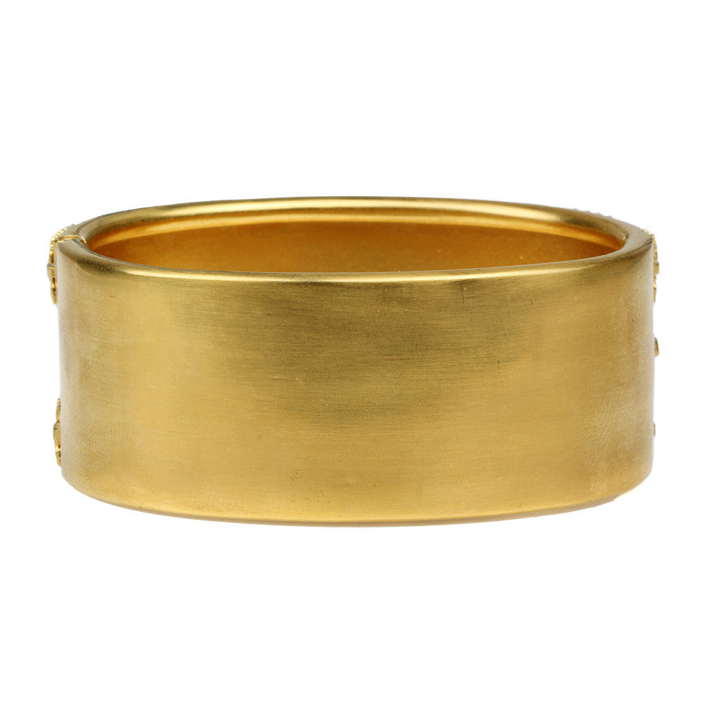 Hinged at the side with push button closure. The inner circumference measures approximately 7". Bracelet is 1" wide.
