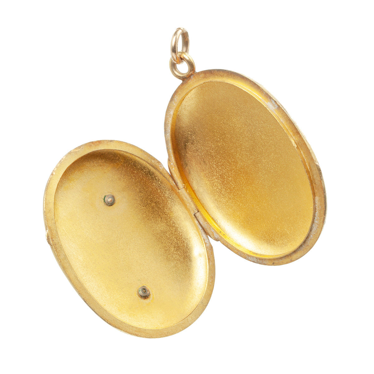 Locket measures 1.75" in drop length and 1.25" wide. Missing original frame and glass but photos can still be placed inside.