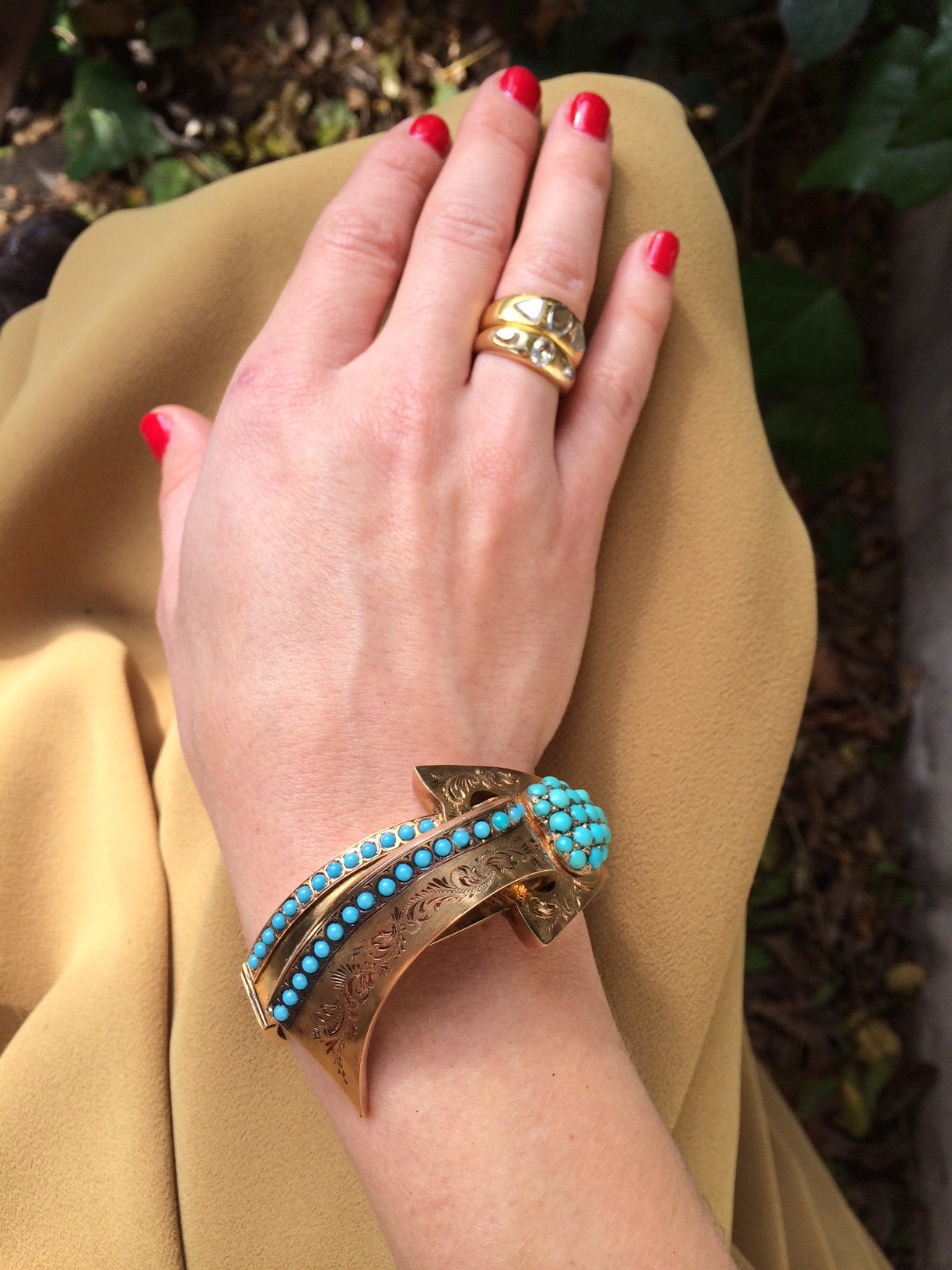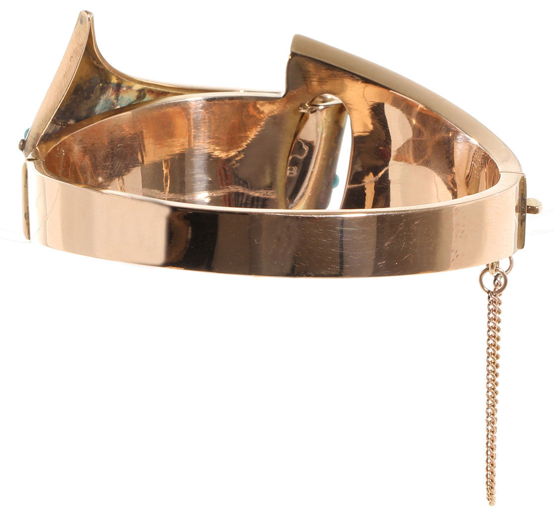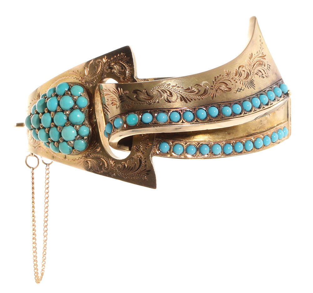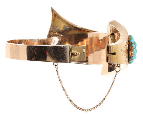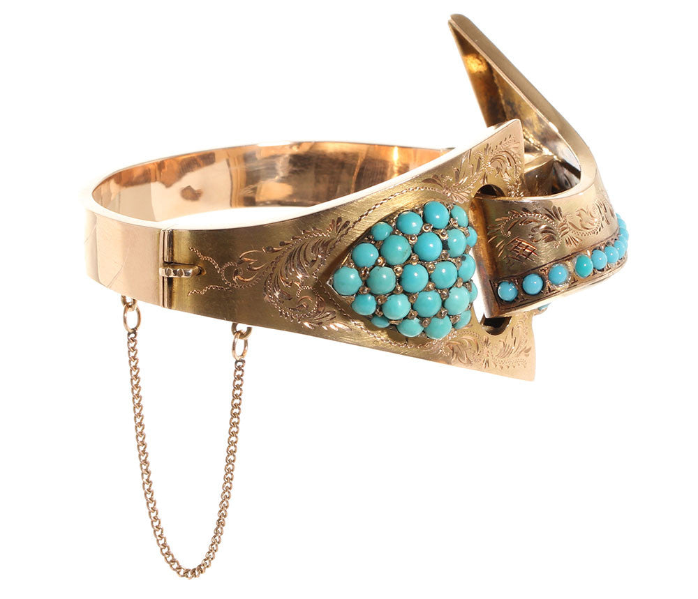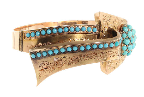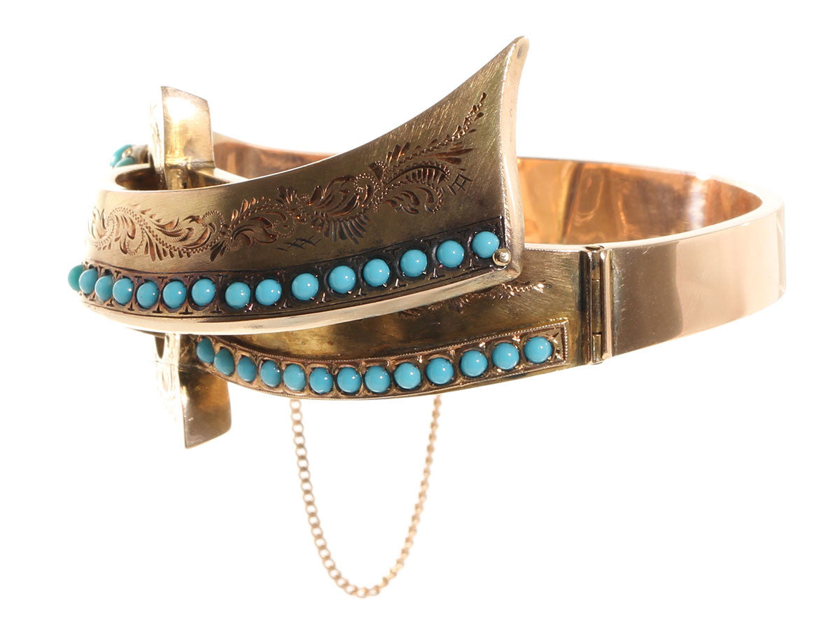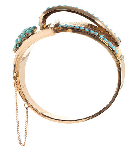 Victorian era bangle bracelet. Figural ribbon design with pavé set turquoise stones. Turquoise was often used in sentimental jewelry as a love stone.