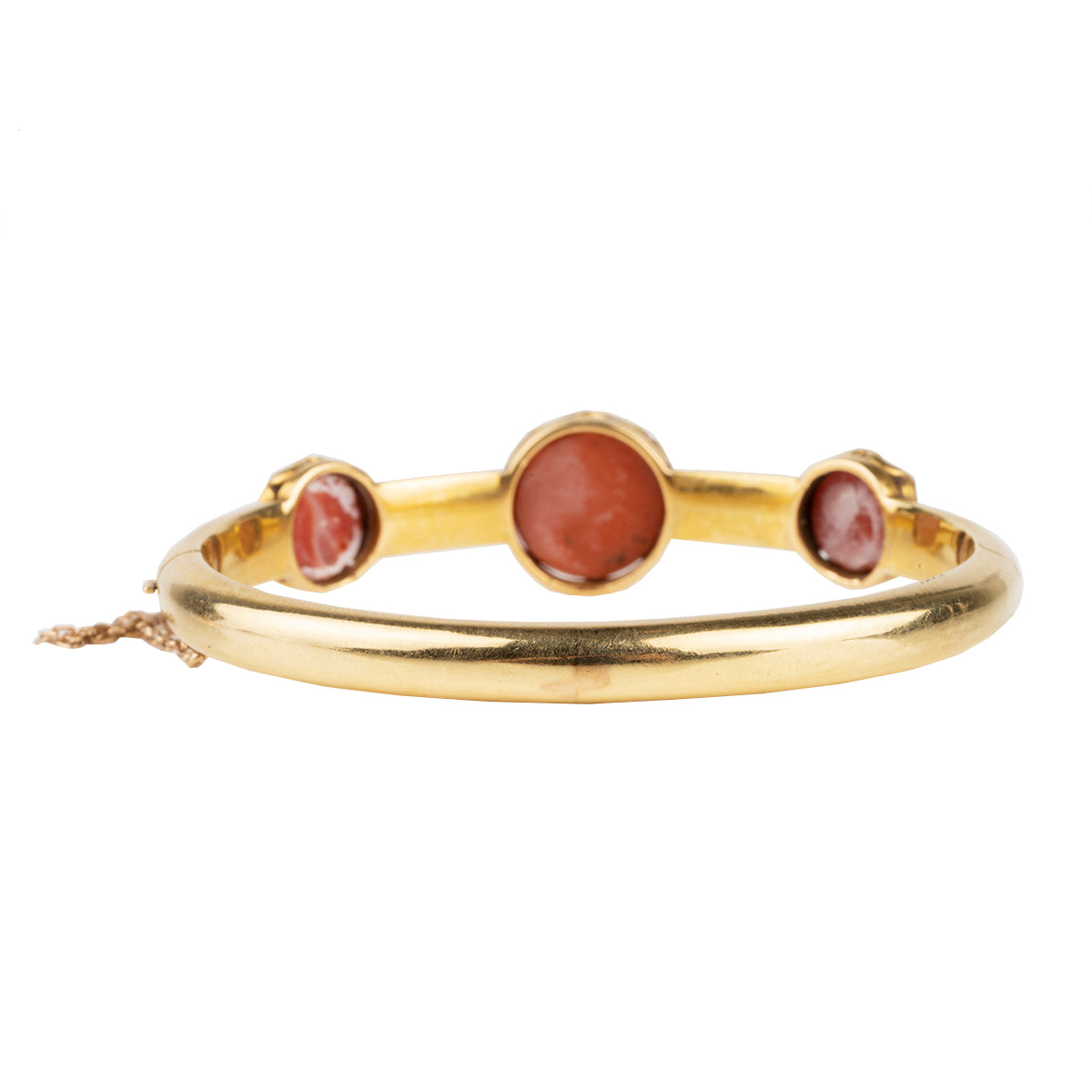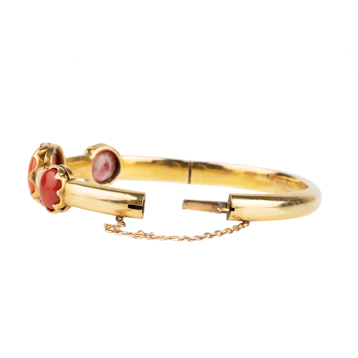 Bright orange coral cabochons set in 18k gold. English in origin. Circa 1880.