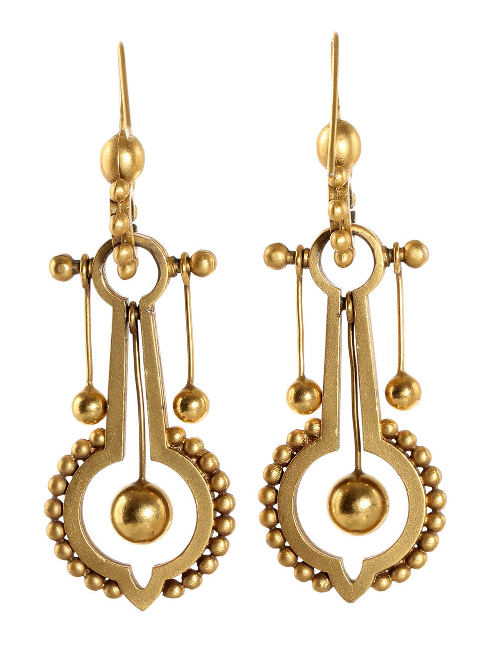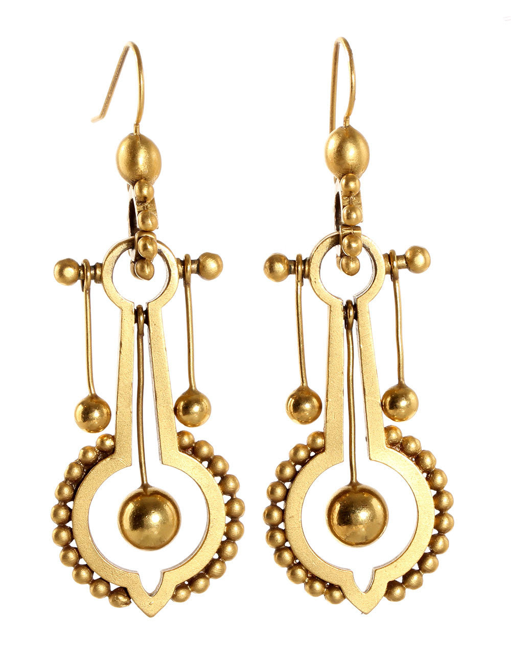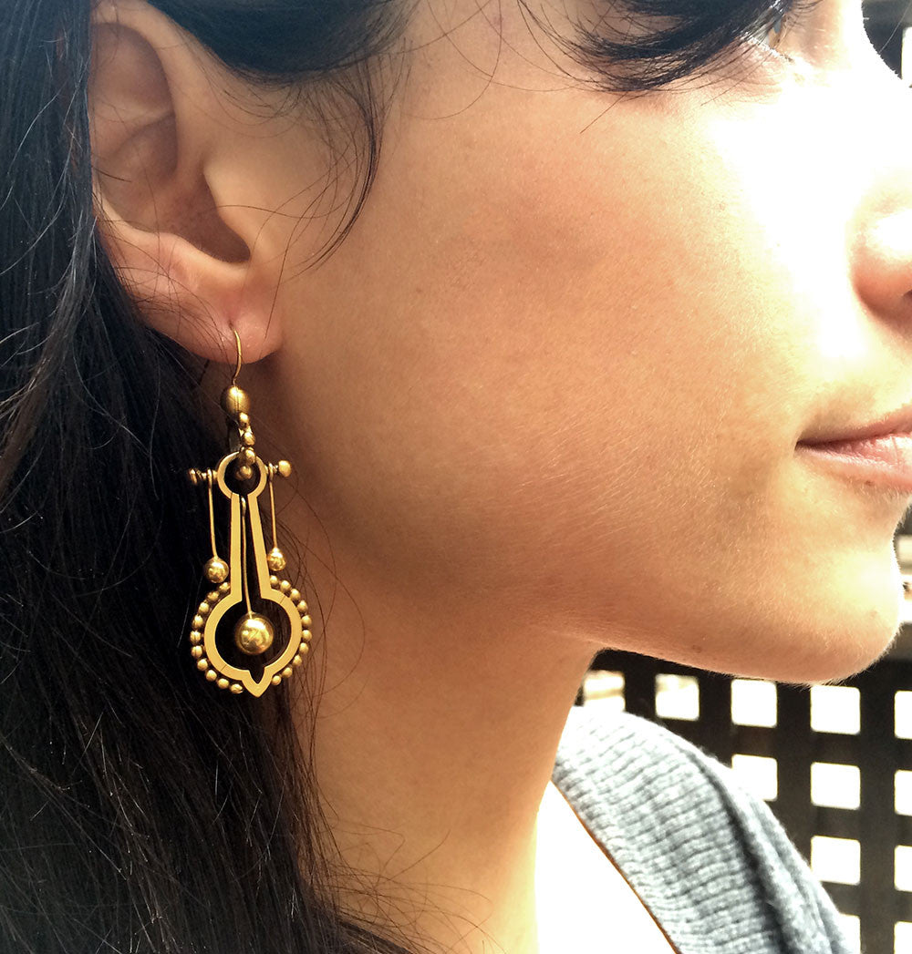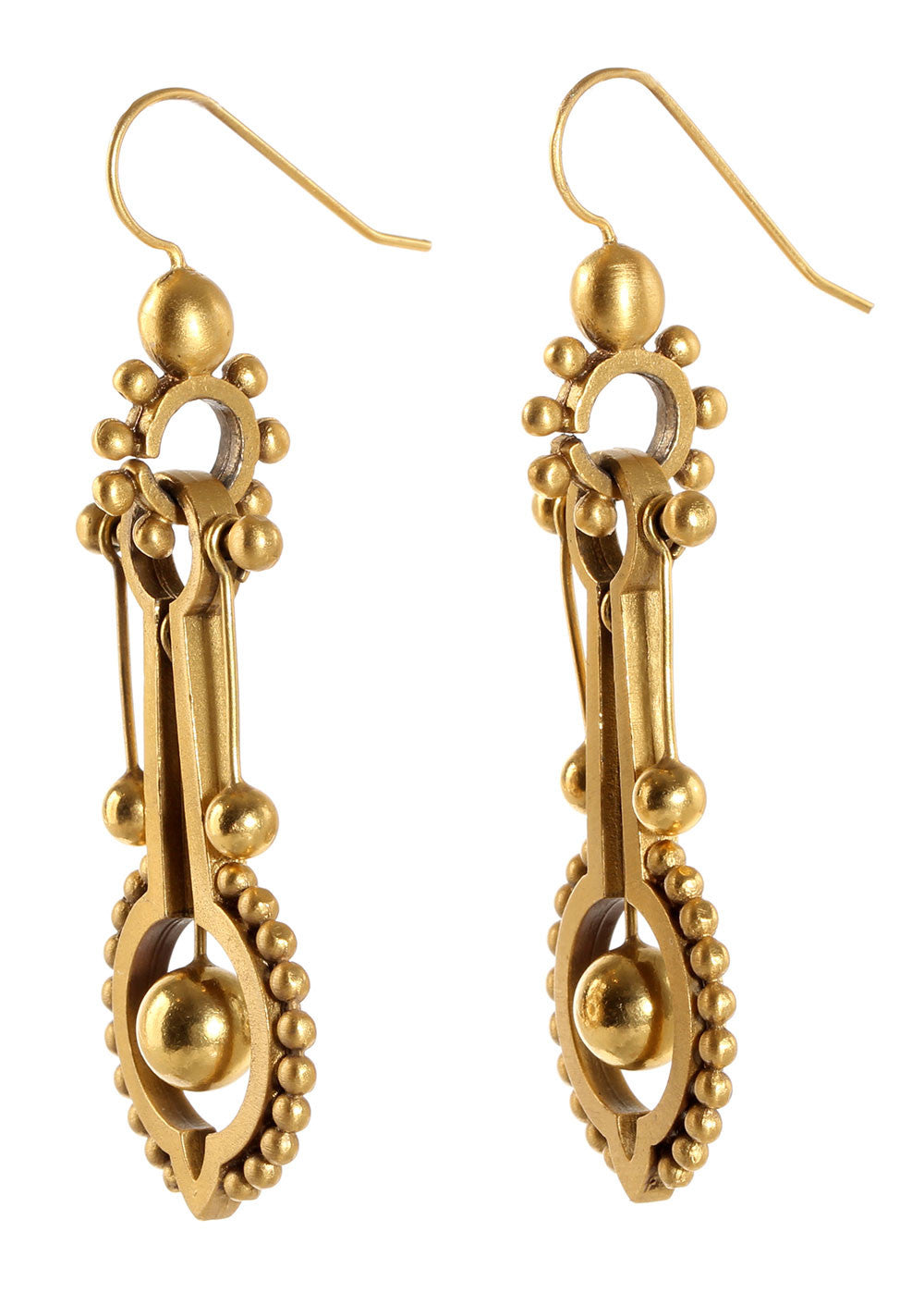 Late 19th century gold metal earrings. Long elaborate earrings such as these were popular in the 1870's. All the elements move independently of each other, giving great movement when worn. English in origin. Circa 1870.
