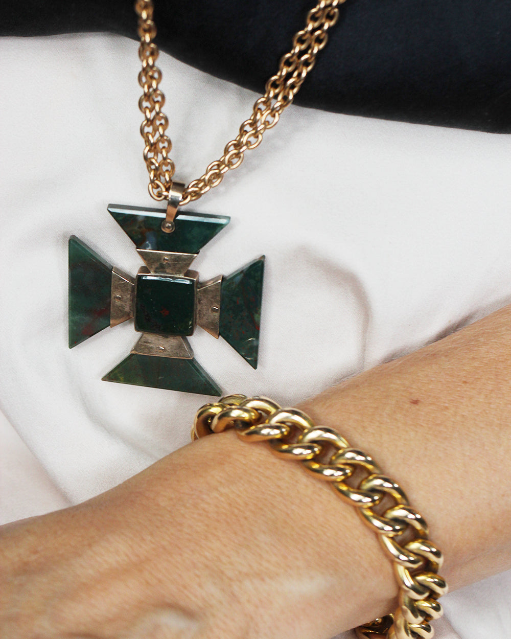 7.25" in length and .5" wide. Push clasp with safety chain.