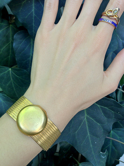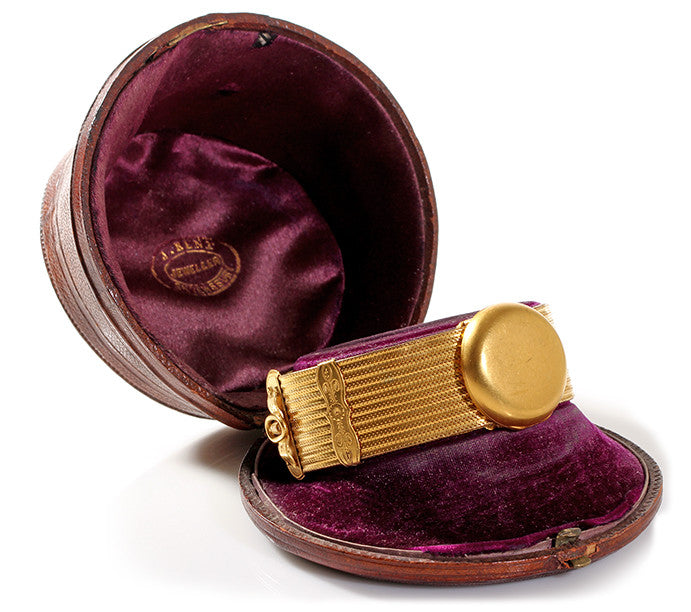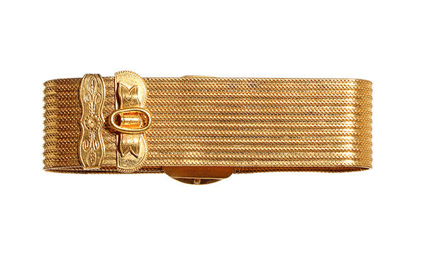 Victorian gold locket bracelet. English in origin in 15k carat gold with bright bloomed finish. Slide mechanism adjusts for a varied fit. Complete with its original fitted box J. Kent Jeweller Shrewsbury. Circa 1860-80