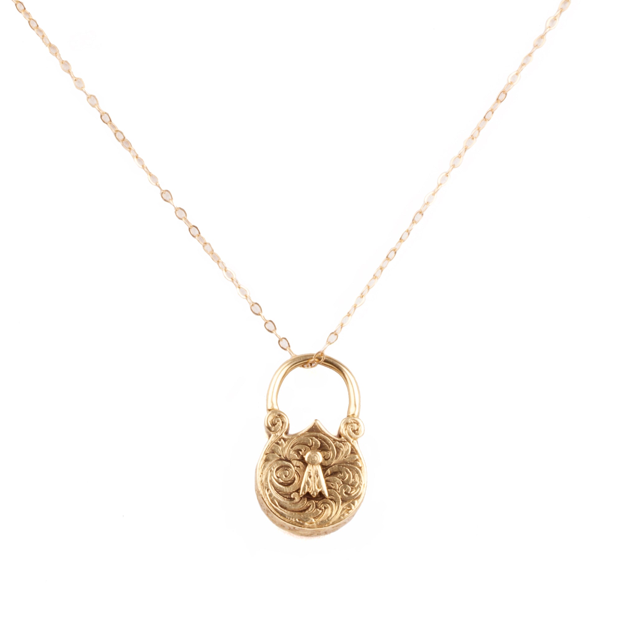 Victorian Era gold lock pendant necklace. Beautiful hand engraved details with forget-me-not flower details in 15ct gold. This is a functioning 'lock' and it would have originally been the clasp for a linked bracelet. Engraved on both sides of the pendant. English in origin. Circa 1860.