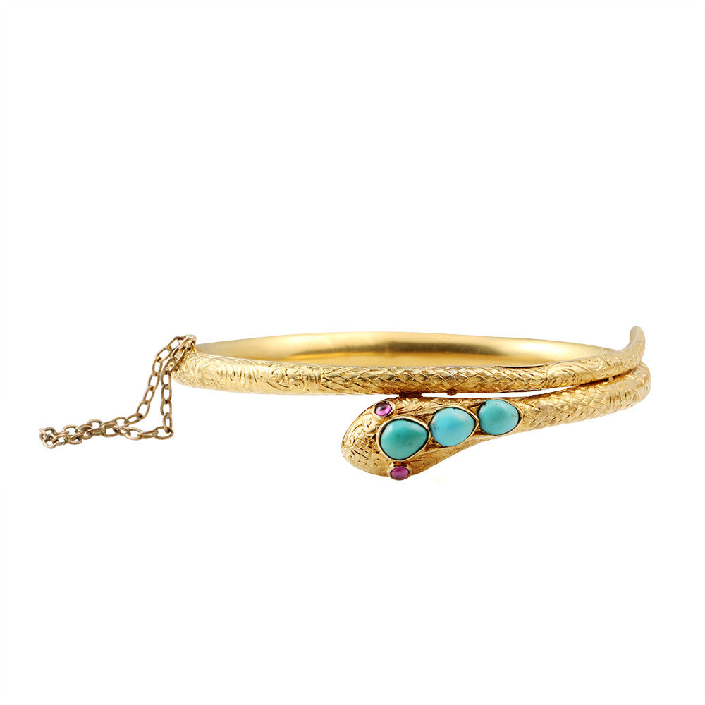 Victorian Gold Snake Bangle with Turquoise & Rubies