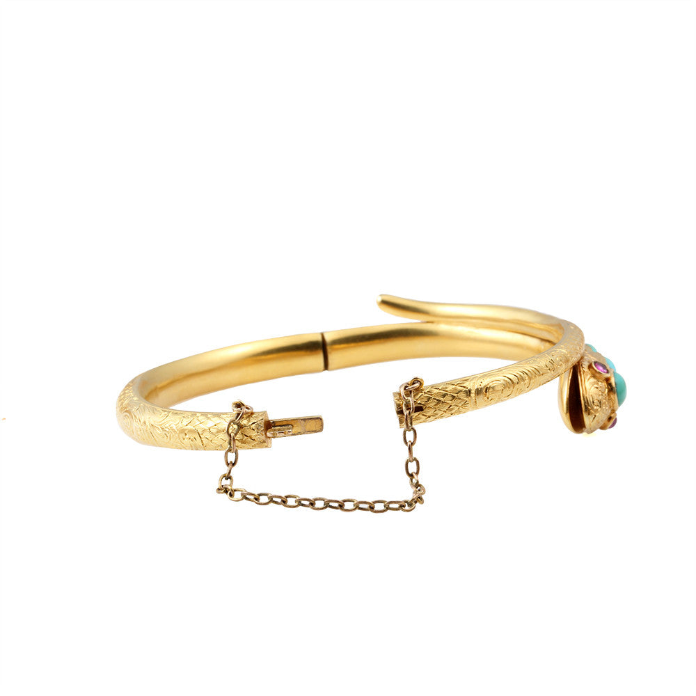 Victorian Gold Snake Bangle Bracelet with Turquoise stones and Ruby Eyes, 15k Gold. English in Origin, Circa 1860. Hinged at side with safety chain and push-button closure.