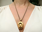 There is a handsome gentleman inside this English 18k gold locket. On the front is a bold horseshoe for luck and notice there are a lucky number of nails! Hanging on antique 15k gold chain.