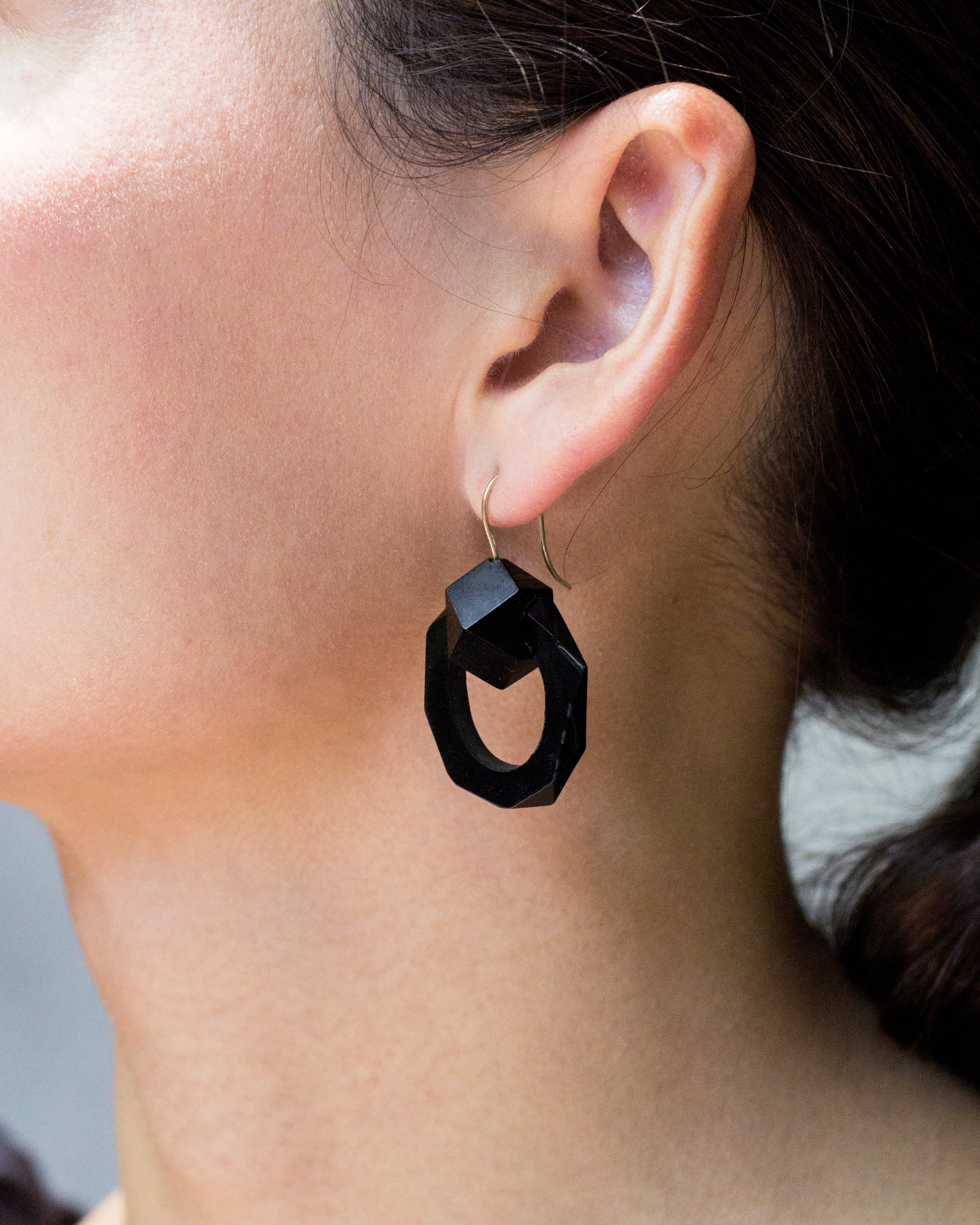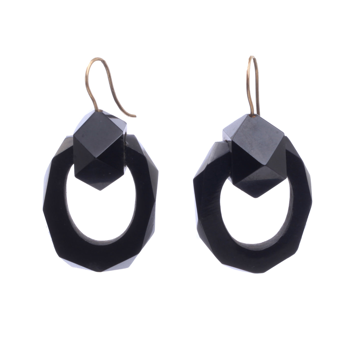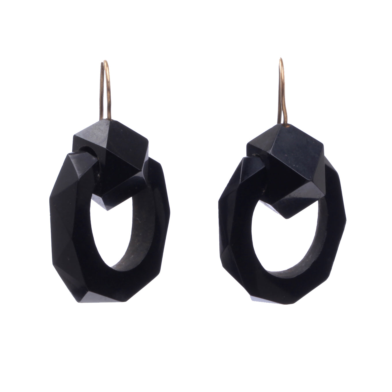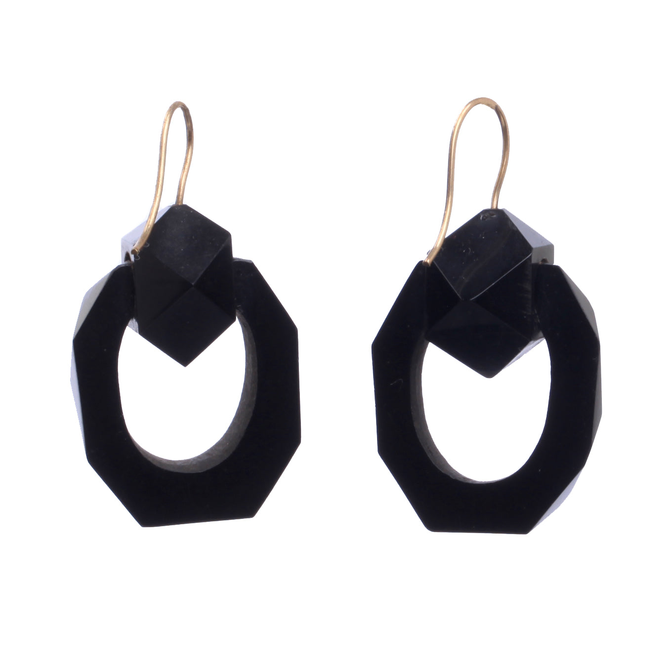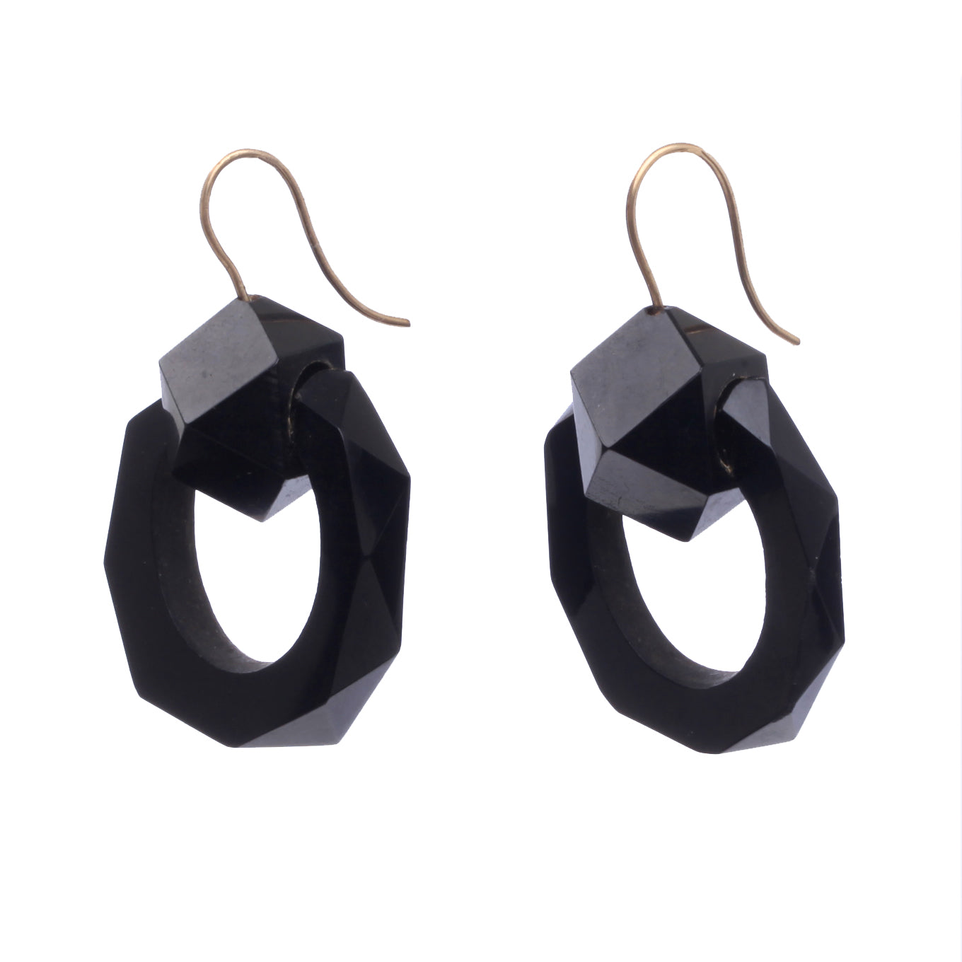 Victorian Era jet earrings with facetted carved jet hoop. Light weight and perfect for everyday wear. English in origin. Circa 1860.