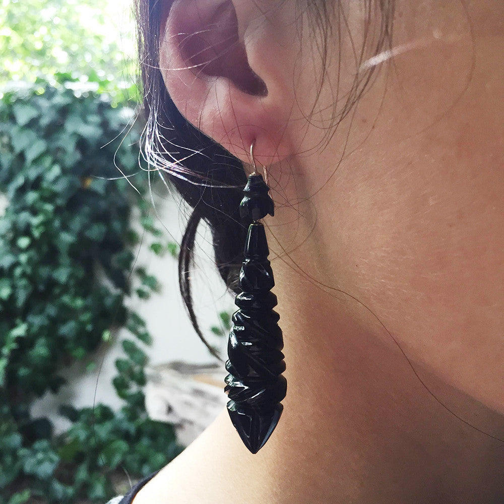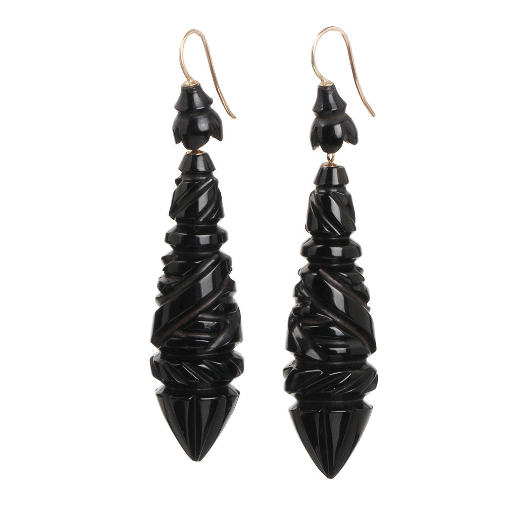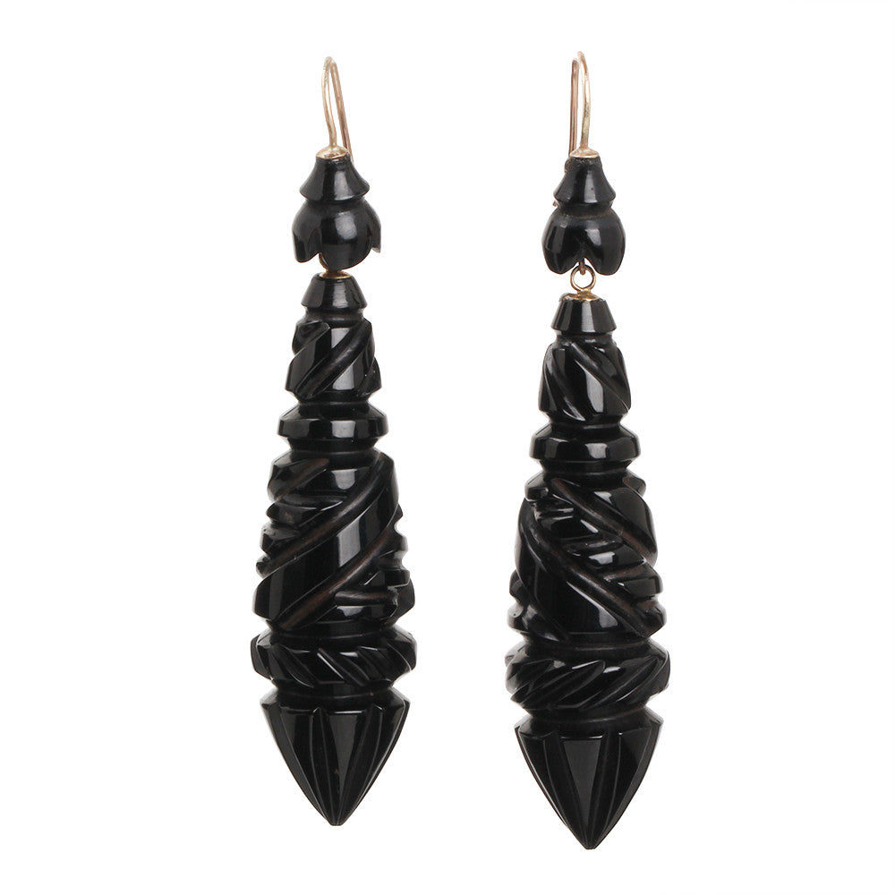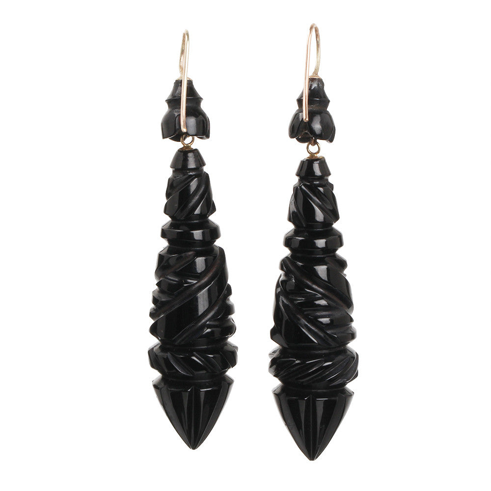 Victorian era Jet earrings. Hand carved in Jet. Circa 1870. English in origin. Very light in weight and easily worn. Gold french hook earring wires.