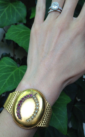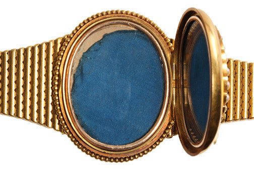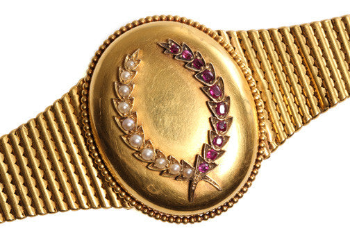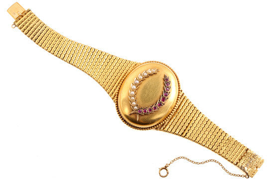 Rare Victorian locket bracelet. 18k gold with ruby and pearls in the form of an olive branch wreath. Hidden Locket compartment for two photographs or mementos. Circa 1850-1870