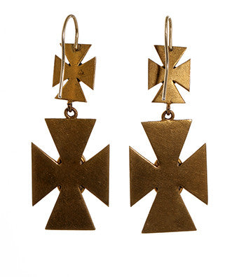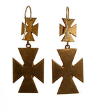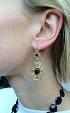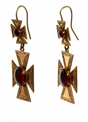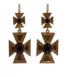 Circa 1860-1880 English gilded brass maltese cross earrings with garnet paste.