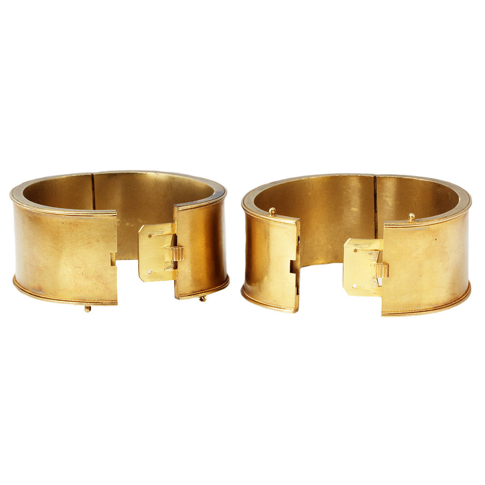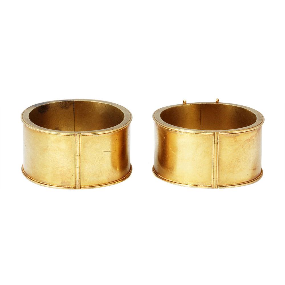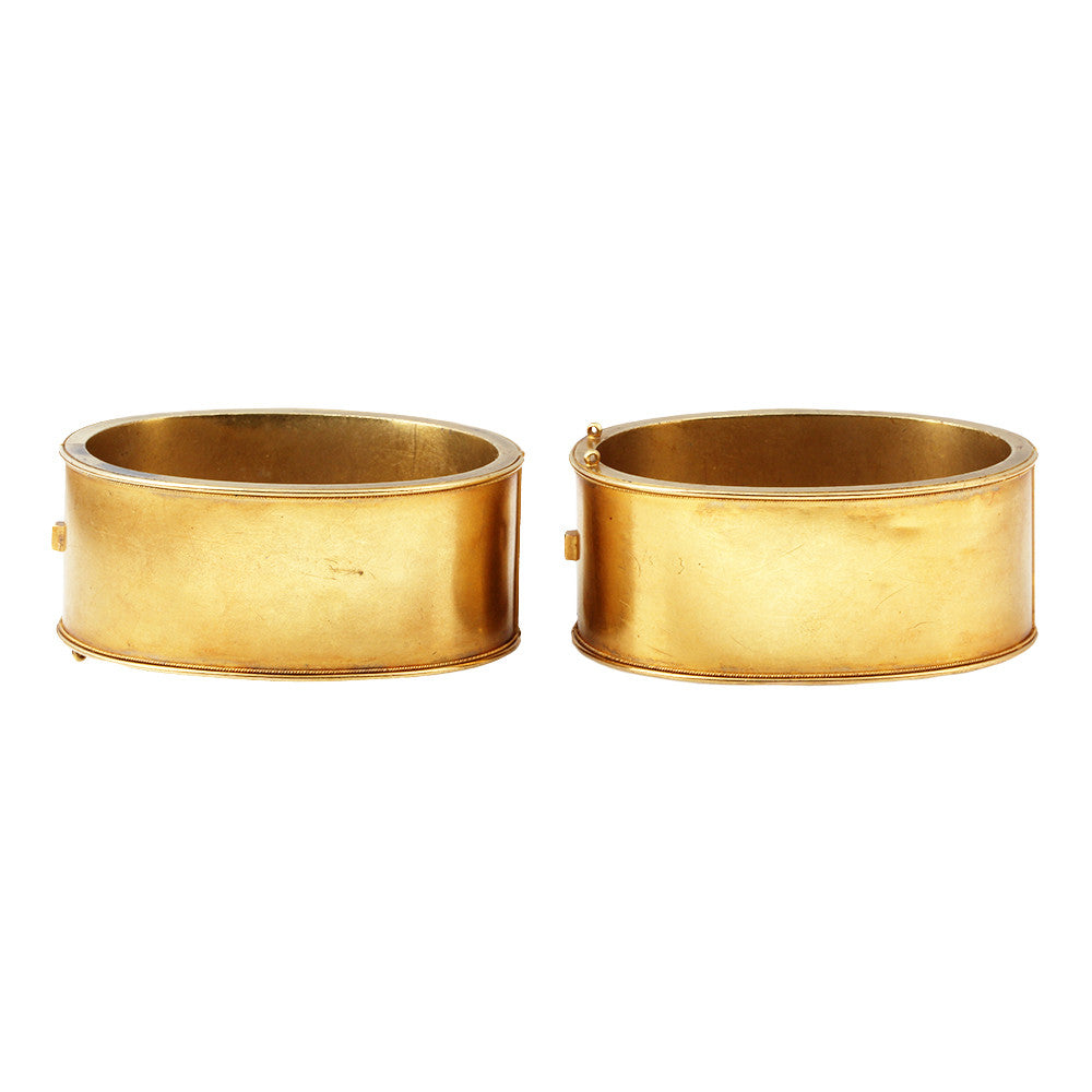 Hinged at side with push button closure, with safety latch. Inner circumference measures approximately 6.25". Bracelets are each 1.5" wide.