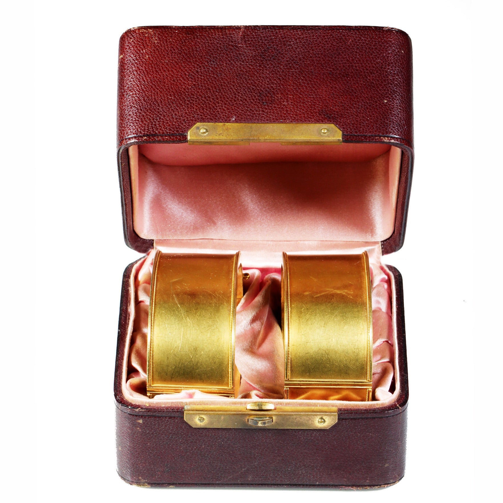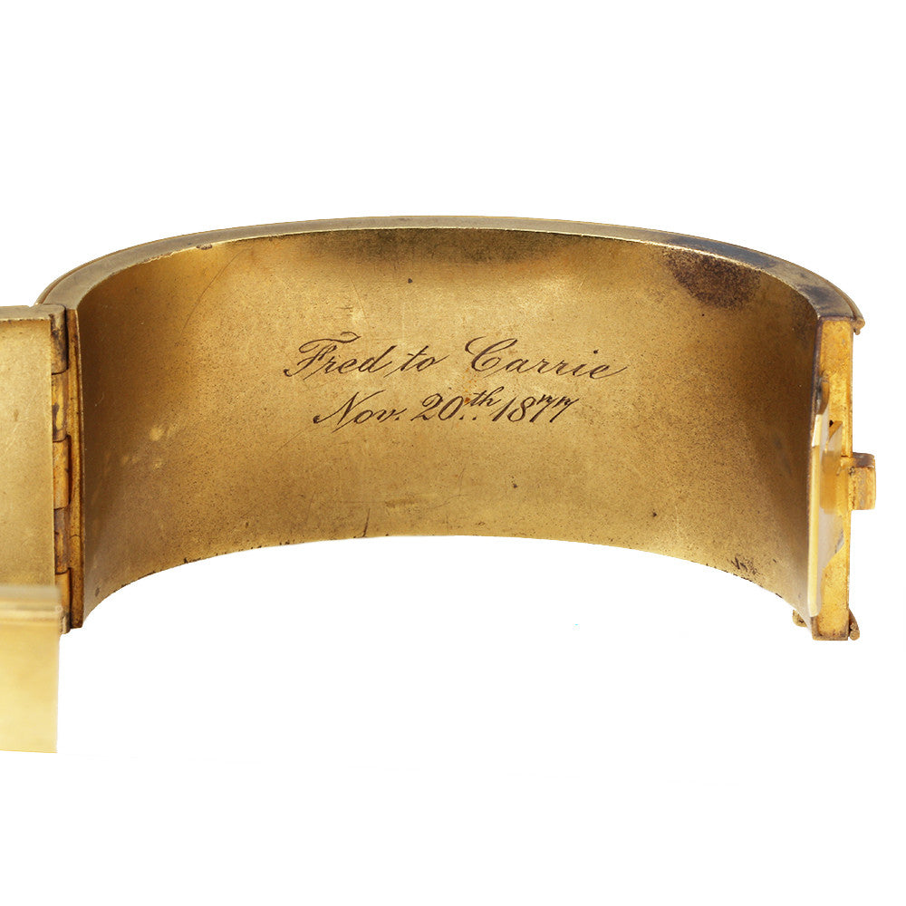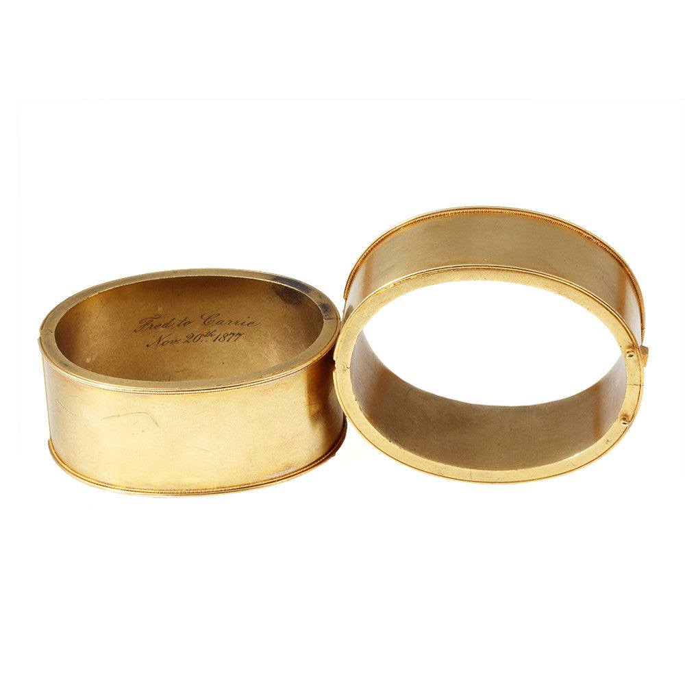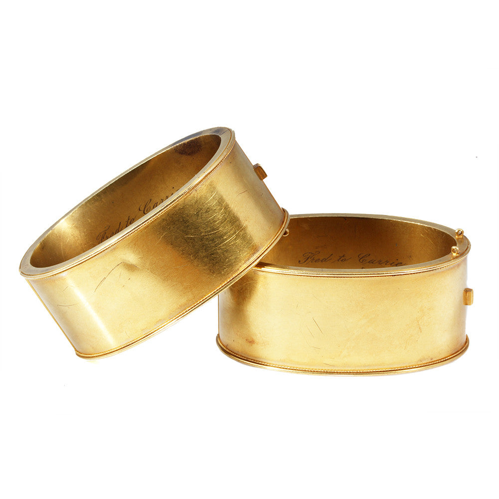 Pair of matched Victorian bangles with plain fronts and hand engraved interiors, in 14k gold. Hand engraced with " Fred to Carrie Nov 20th 1877". Circa 1870, American in origin.