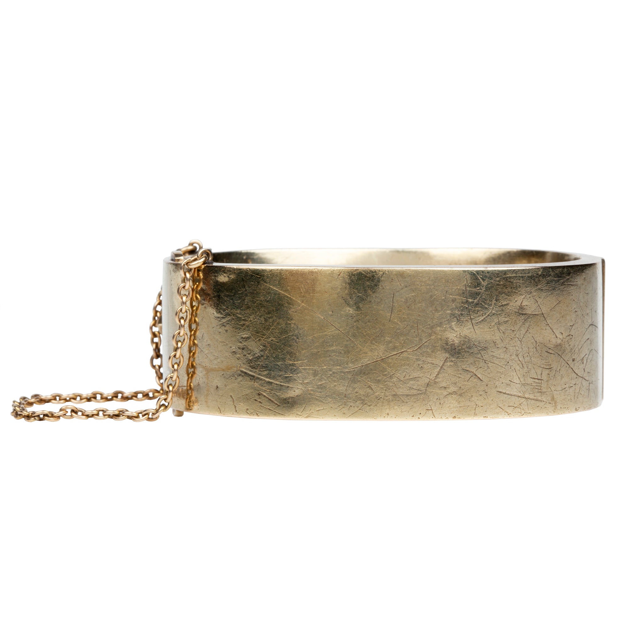 the back of the bangle shows some age with surface scratches and very very slight dents. The photos cast shadows that make the wear look more severe than in person.