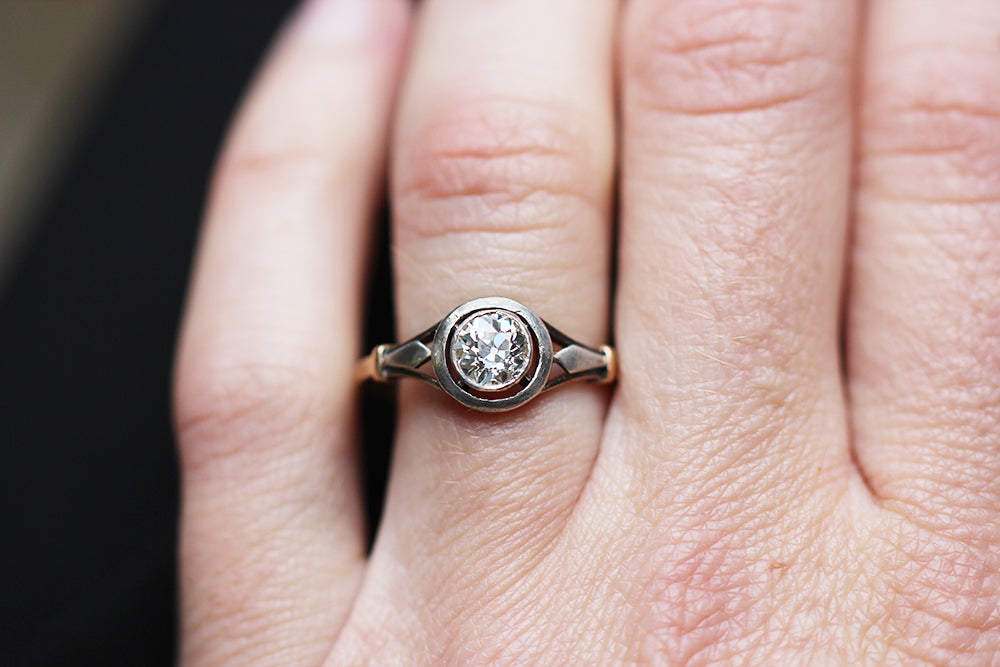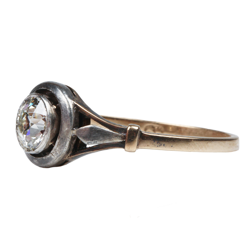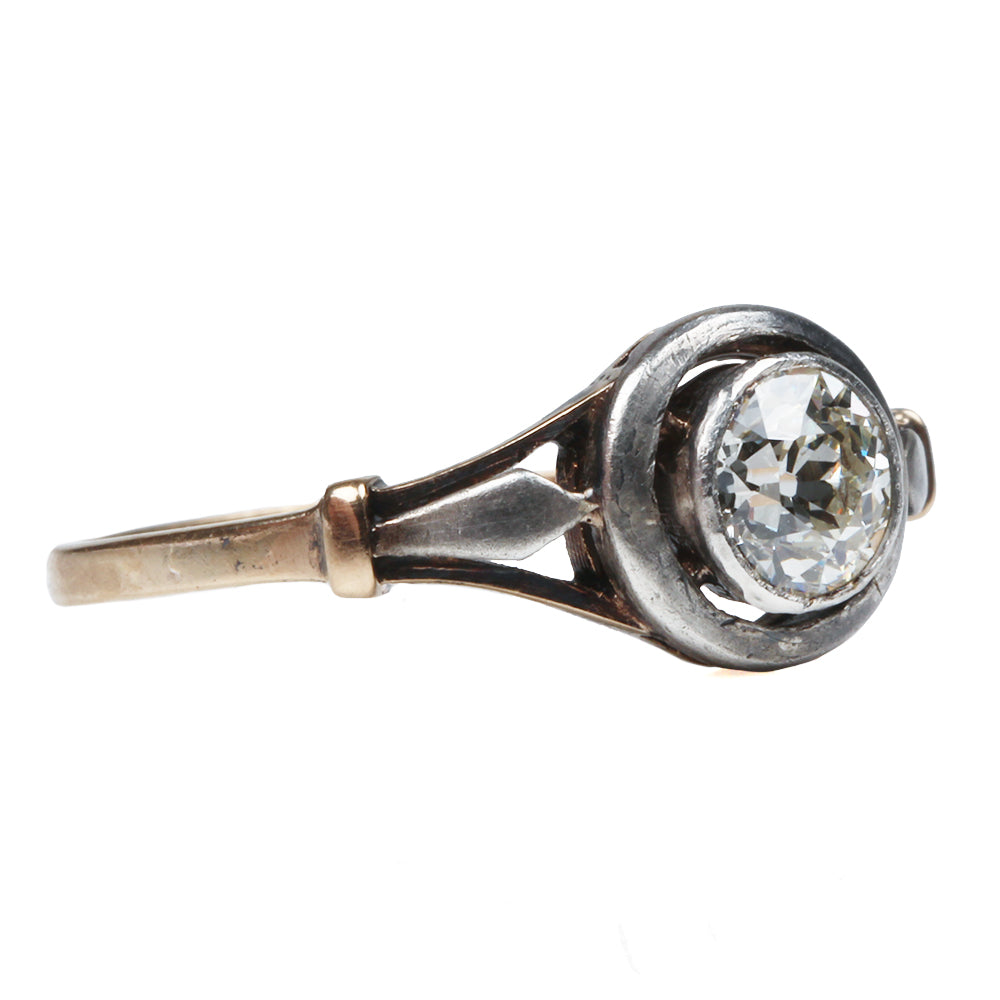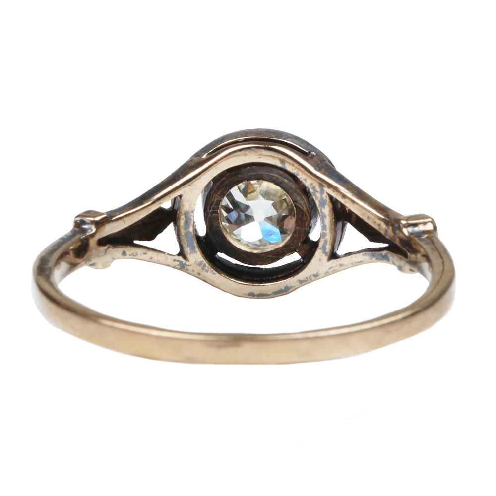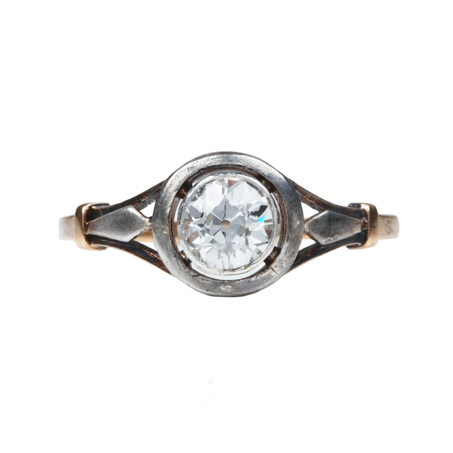 Early 20th Century old European cut diamond ring. Approximately 0.56 carat Old European cut diamond set in silver on gold. English in Origin. Circa 1900.