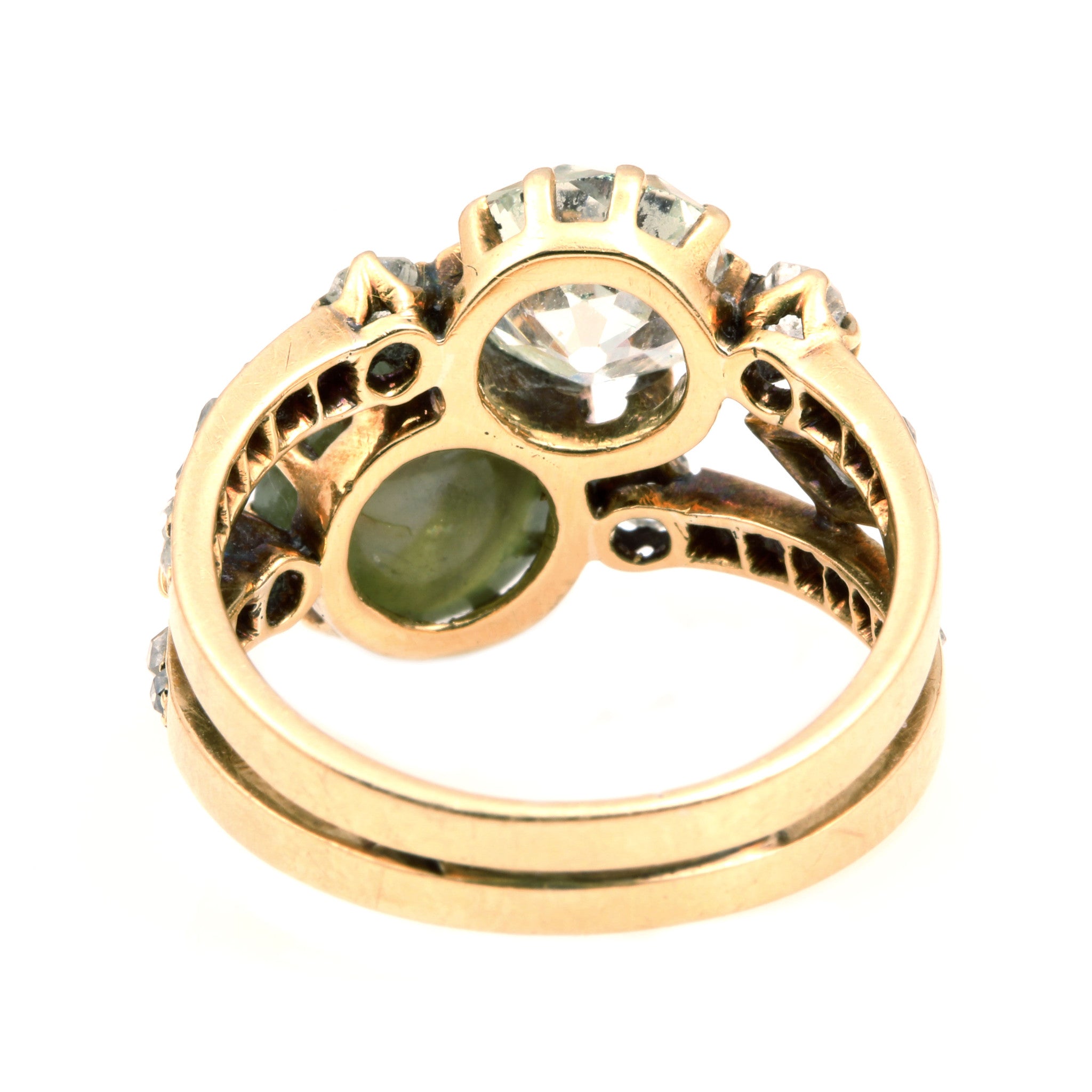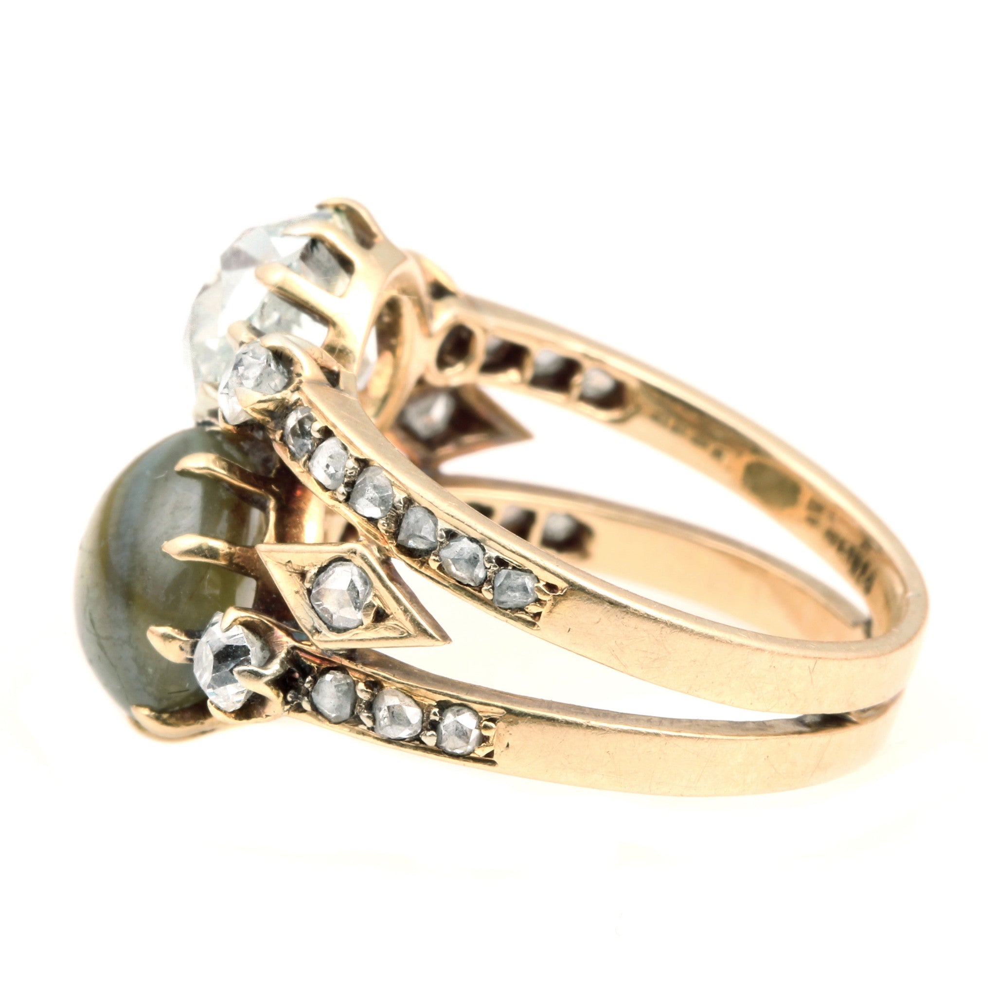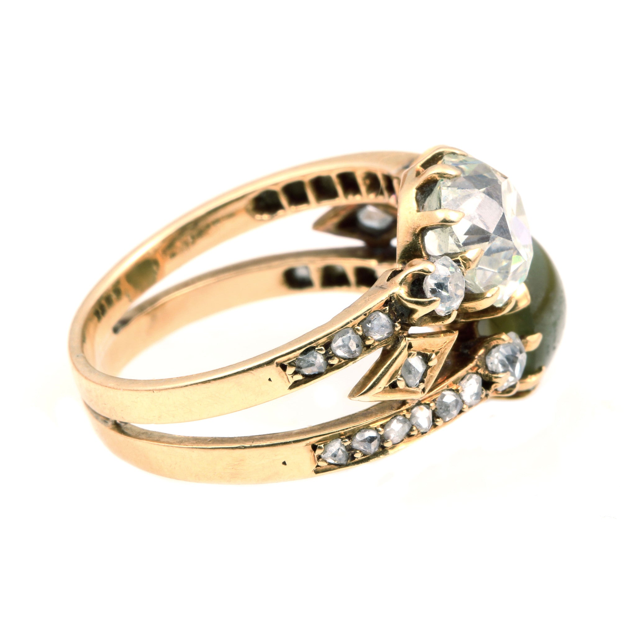 Old mine cut diamond set on an unusual two band ring with a natural cats eye chrysoberyl stone. The main diamond weighs approximately 1.35 carats with an additional 4 old mine cuts and 20 rose cut stones. While the chrysoberyl weighs approximately 3.63 carats. 18k rose gold, circa 1880.