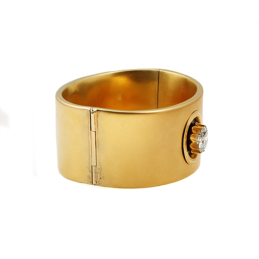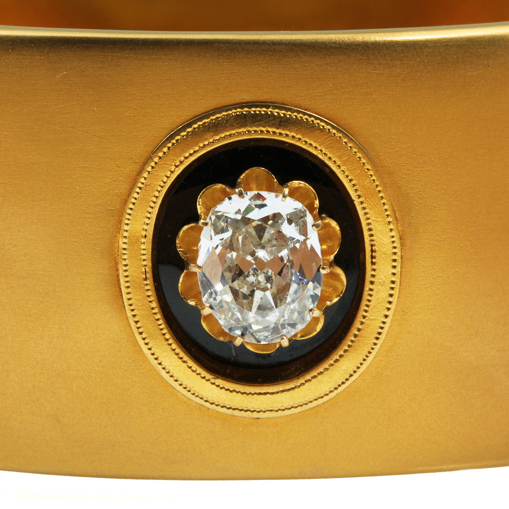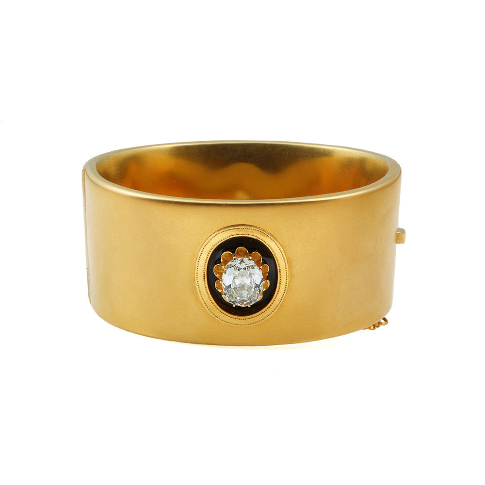 Bold victorian era gold bangle with 2 carat old mine cut diamond and hidden locket compartment. The diamond is prong set on a black enamel ground. The bracelet has a slightly flared design that follows the natural contour of the arm. Beautiful original bloomed finish in 18k gold. A button releases a spring loaded door revealing a hidden locket compartment. Circa 1860. Exceptional condition.