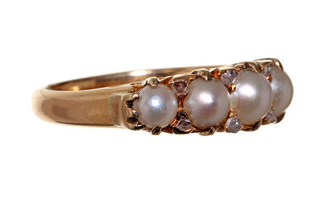 Natural pearl and rose cut diamond ring set in 18k gold. Circa 1880-1900.