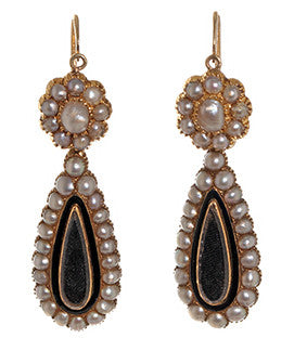 Victorian era mourning earrings. Circa 1840/60. Beautiful tear drop form in 18k gold natural pearls and black enamel. There is a central locket compartment that would have contained finely woven hair. It now contains a bit of fabric.
