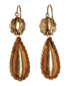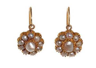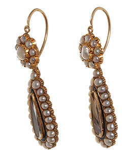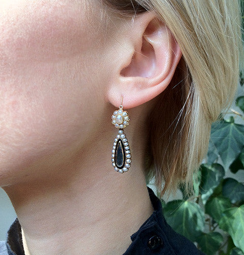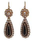 A very sentimental pair of earrings as the Victorians used seed pearls to signify tears. Day and night in design so the drop is easily removed to wear the tops alone. 18k gold. Original Back-to-front ear closure. Full earring drop measures approximately 1.75".