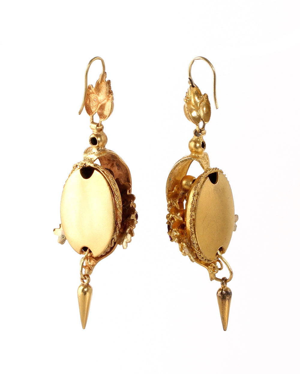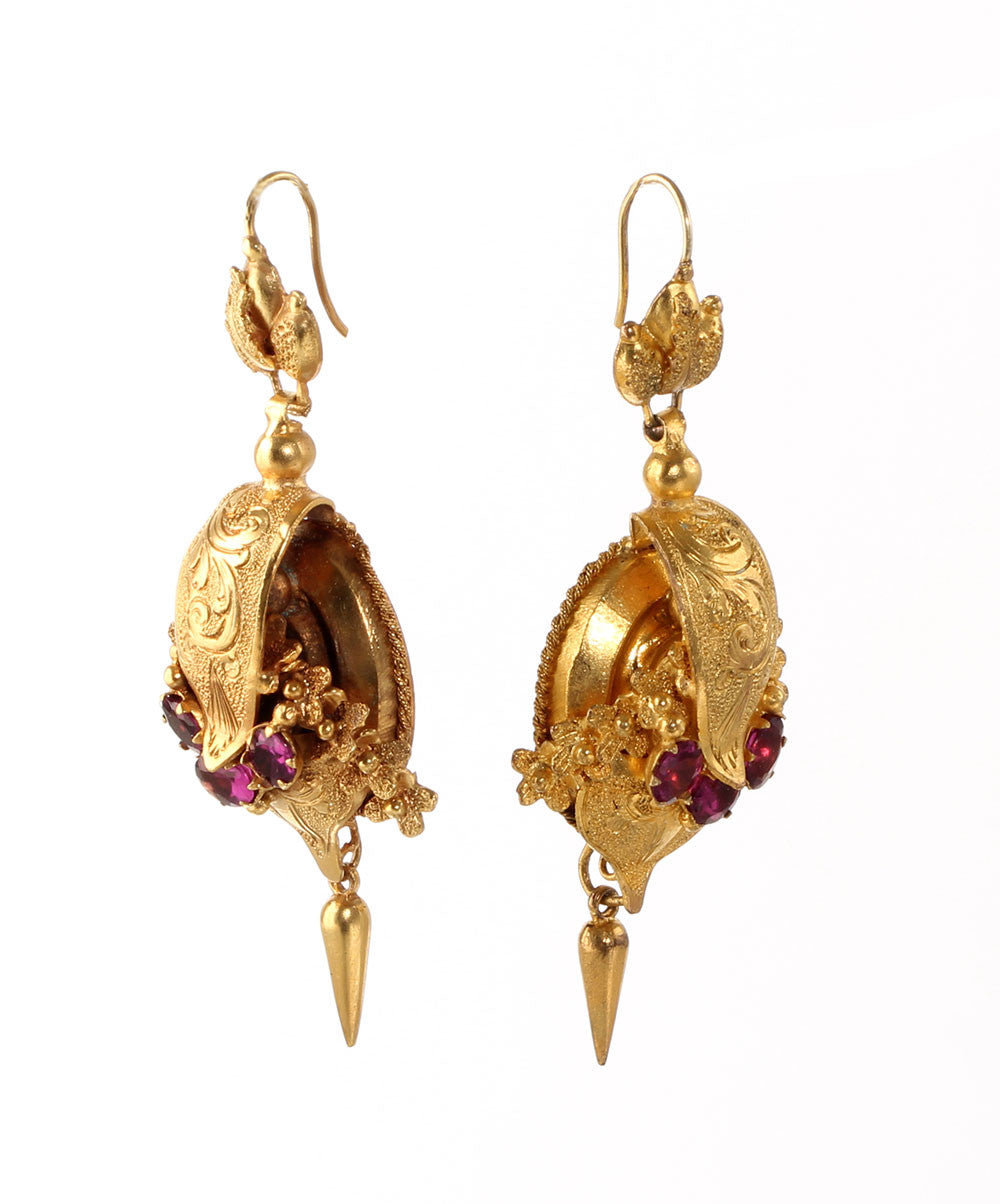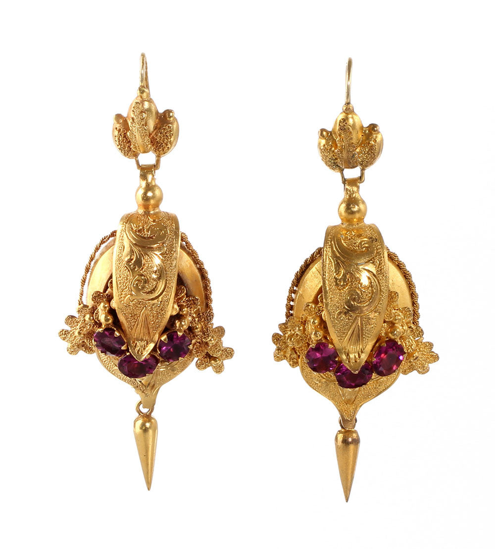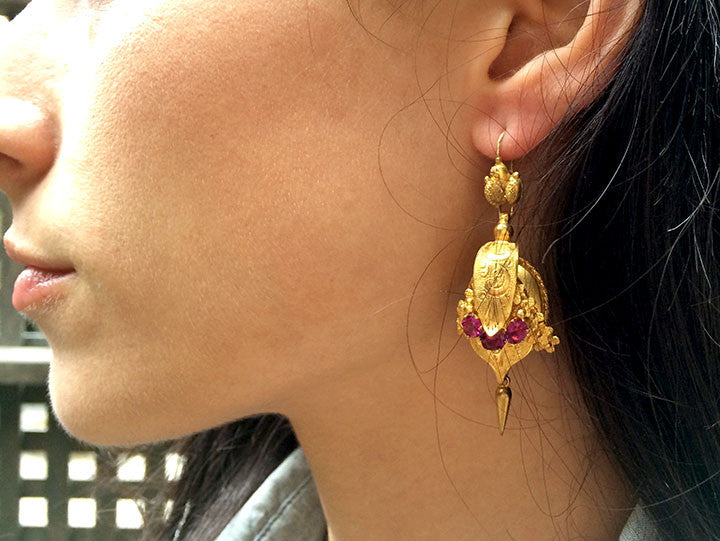Mid 19th Century victorian era gold earrings. They are machine made to mimic hand repousse work in gilded metal. They are a beautiful product of the industrial revolution of the mid 1800's. Glass ruby stones and hand engraved details. English in origin.