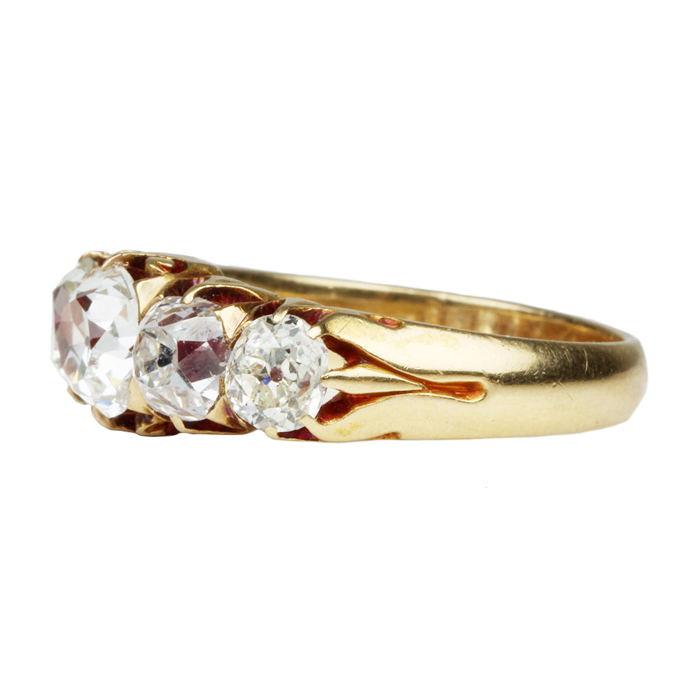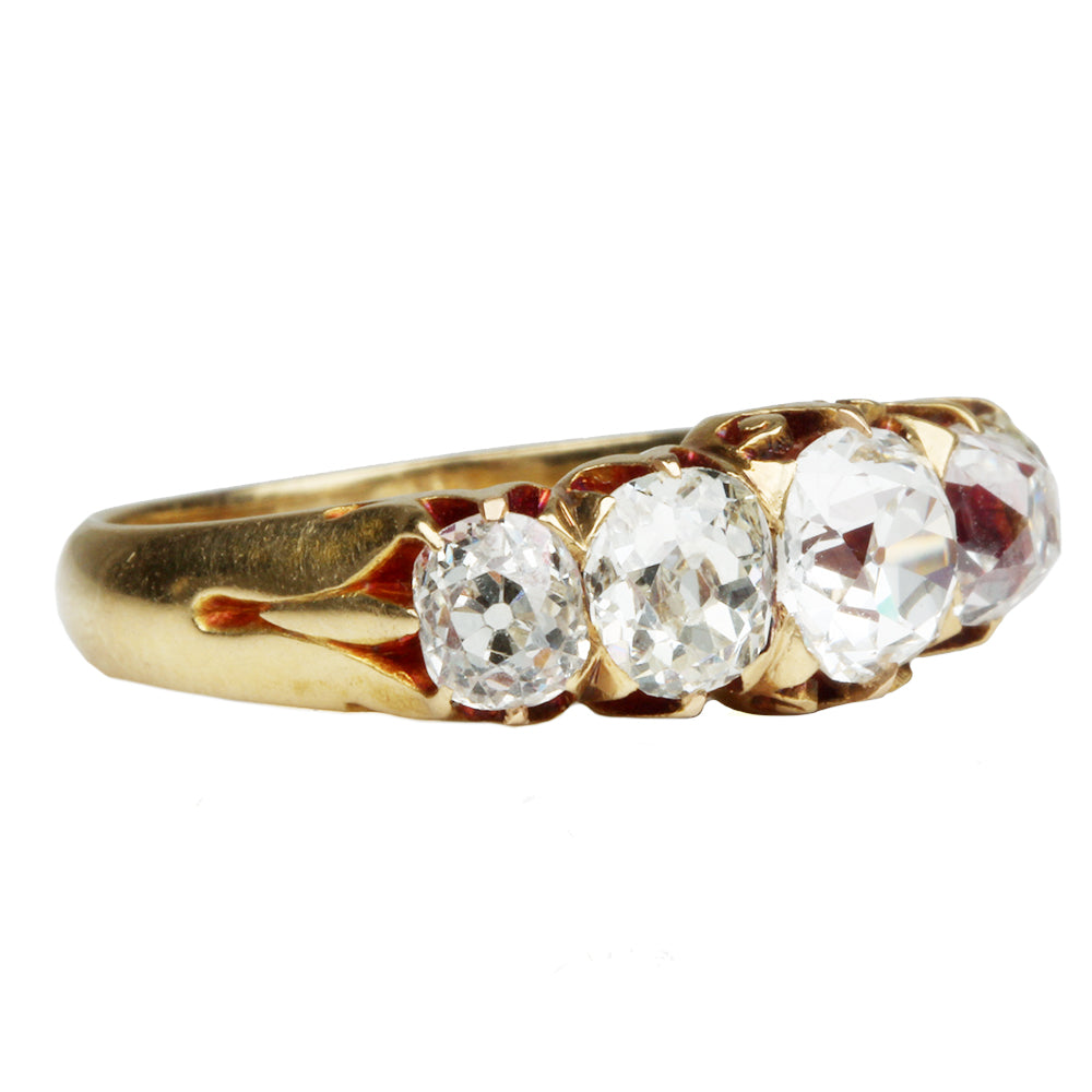 Victorian old mine cut diamond 5-stone ring in 18k yellow gold. Approximately 2.15 carats in total diamond weight. Center stone 0.67 carats. English in origin, Circa 1880.