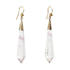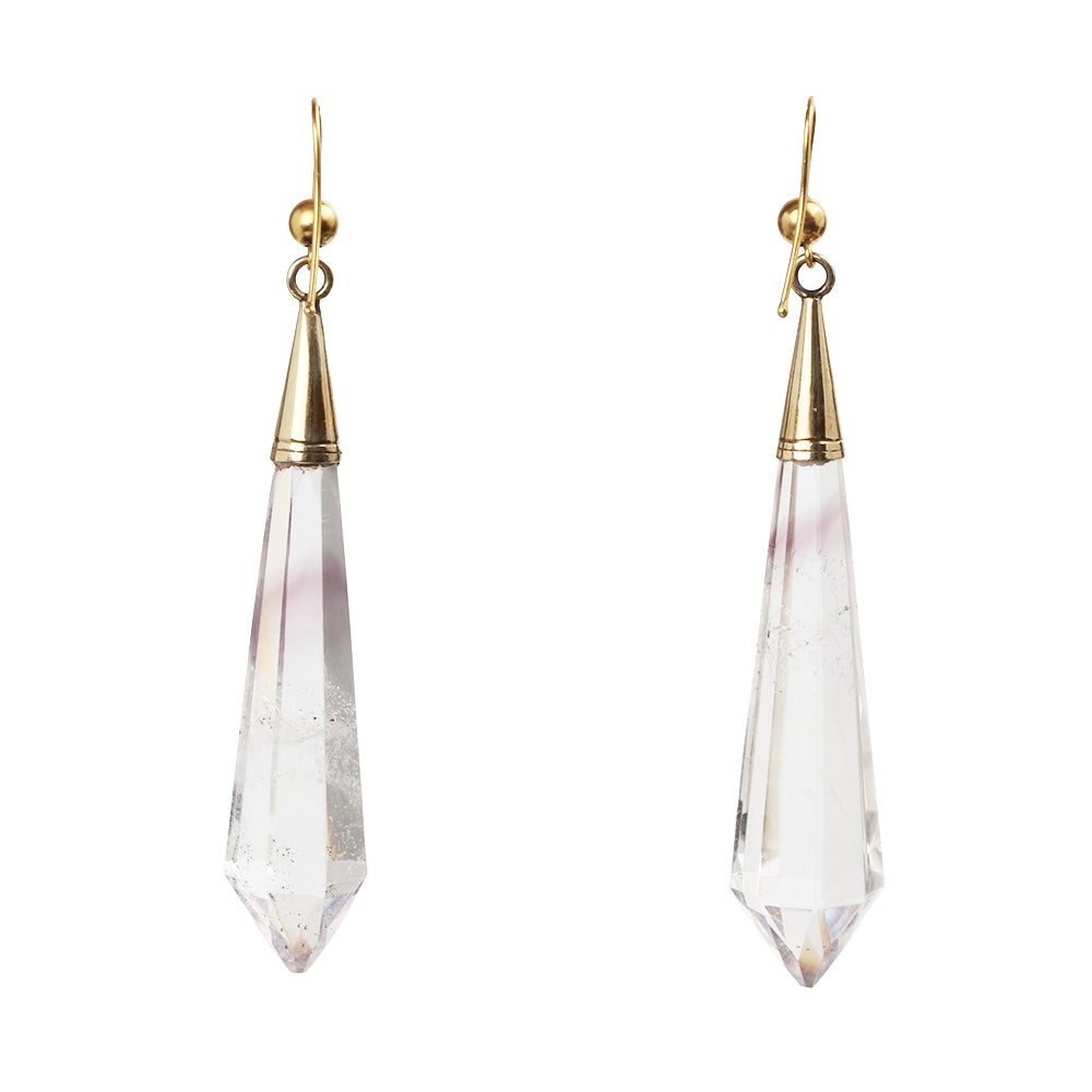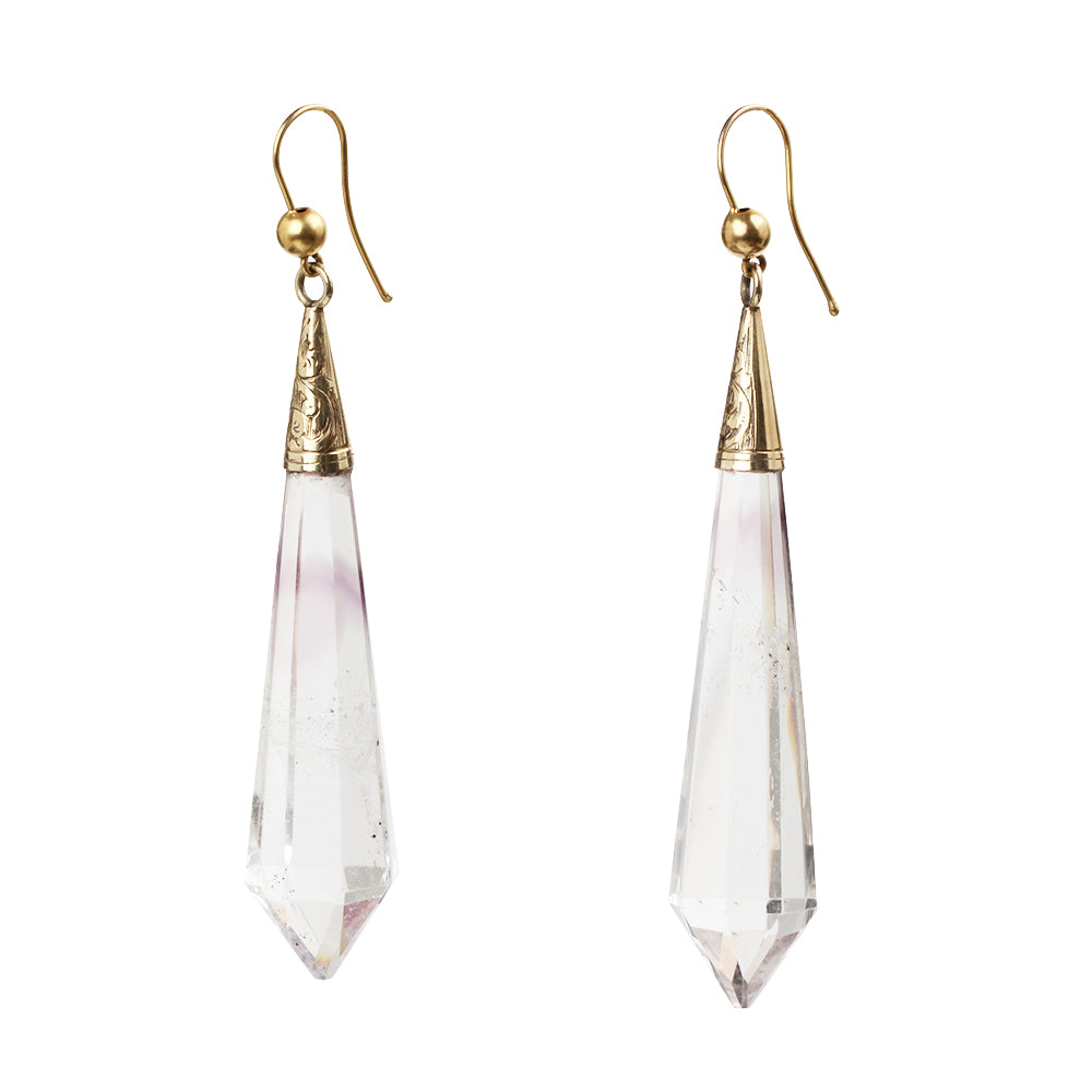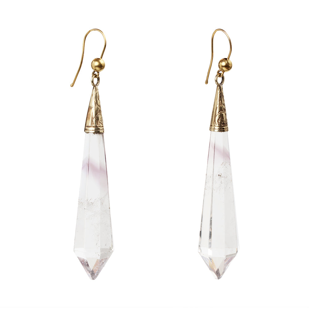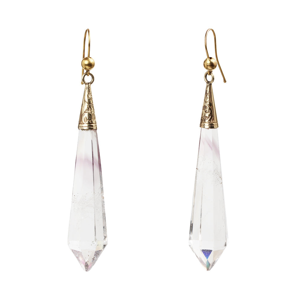 Victorian rock crystal earrings, in 15ct gold tops. Naturally formed composites of amethyst within the crystal drops. English in origin. Circa 1870.