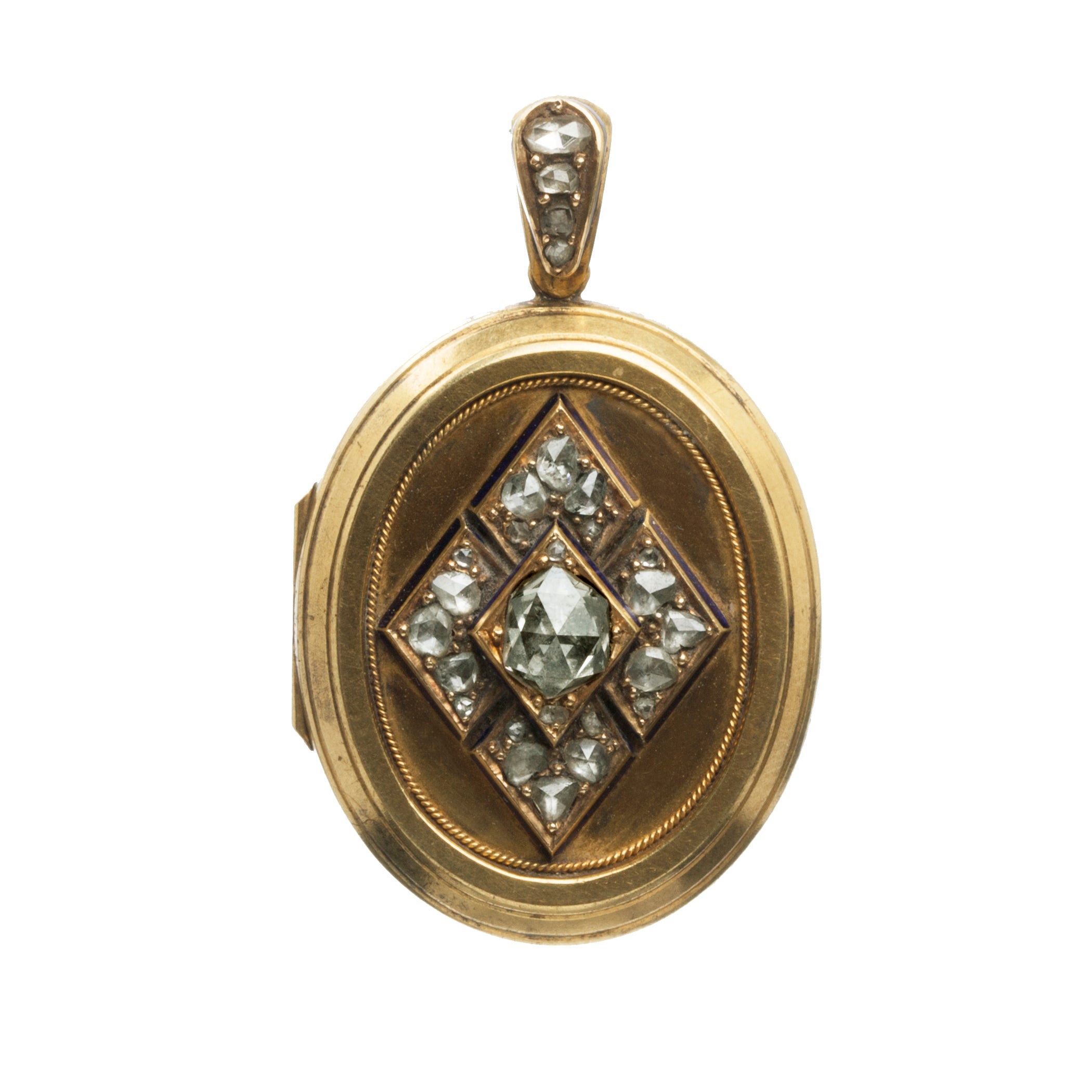 Victorian era locket with rose cut diamonds and blue enamel details, in 18k gold. Original glass still intact. The locket opens from a side hinge. English in Origin.