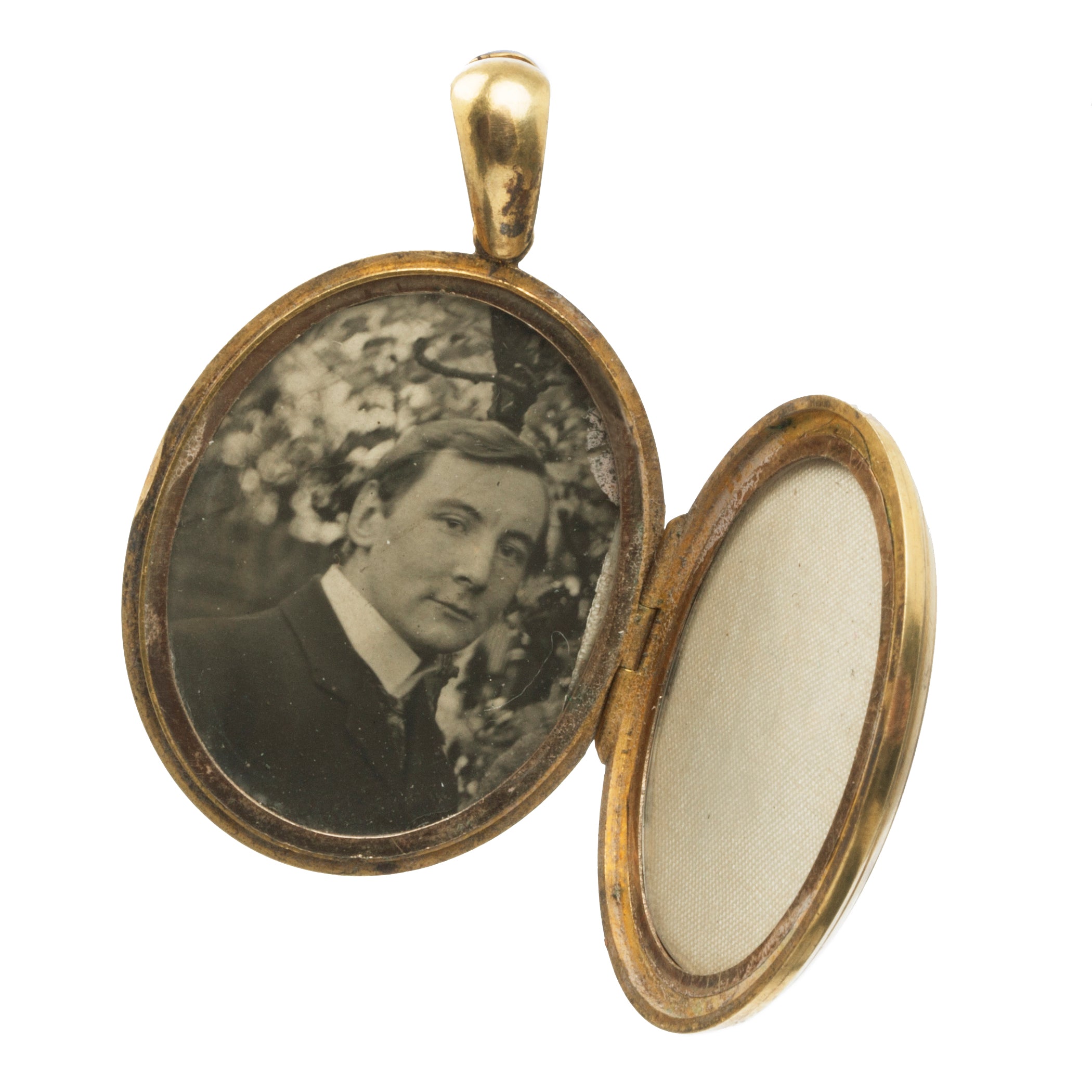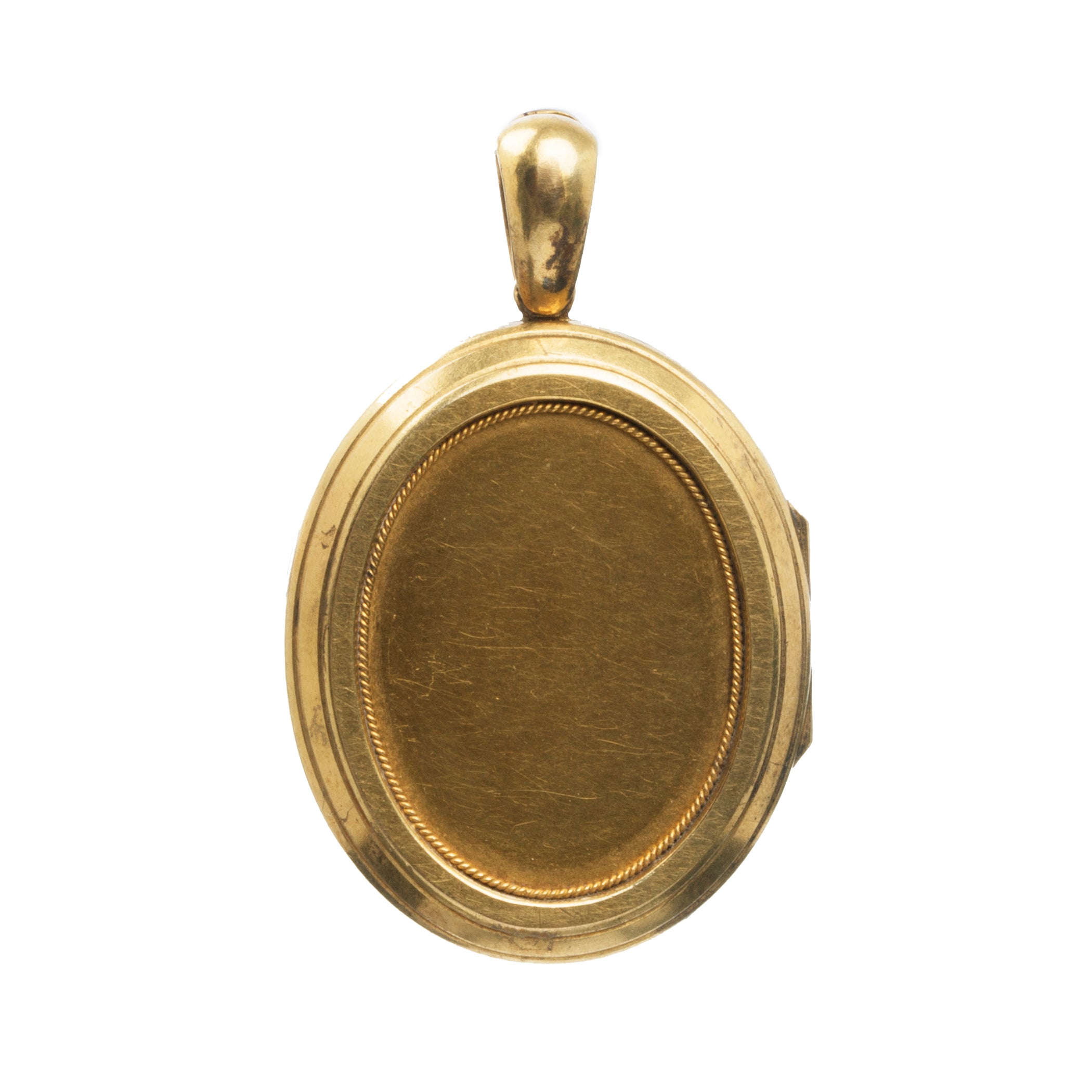 1.75" in length and 1.25" in width. The locket hangs on a Victorian woven 18k gold chain, which is sold separately. Antique chains are available in-store. Please call the shop to inquire.