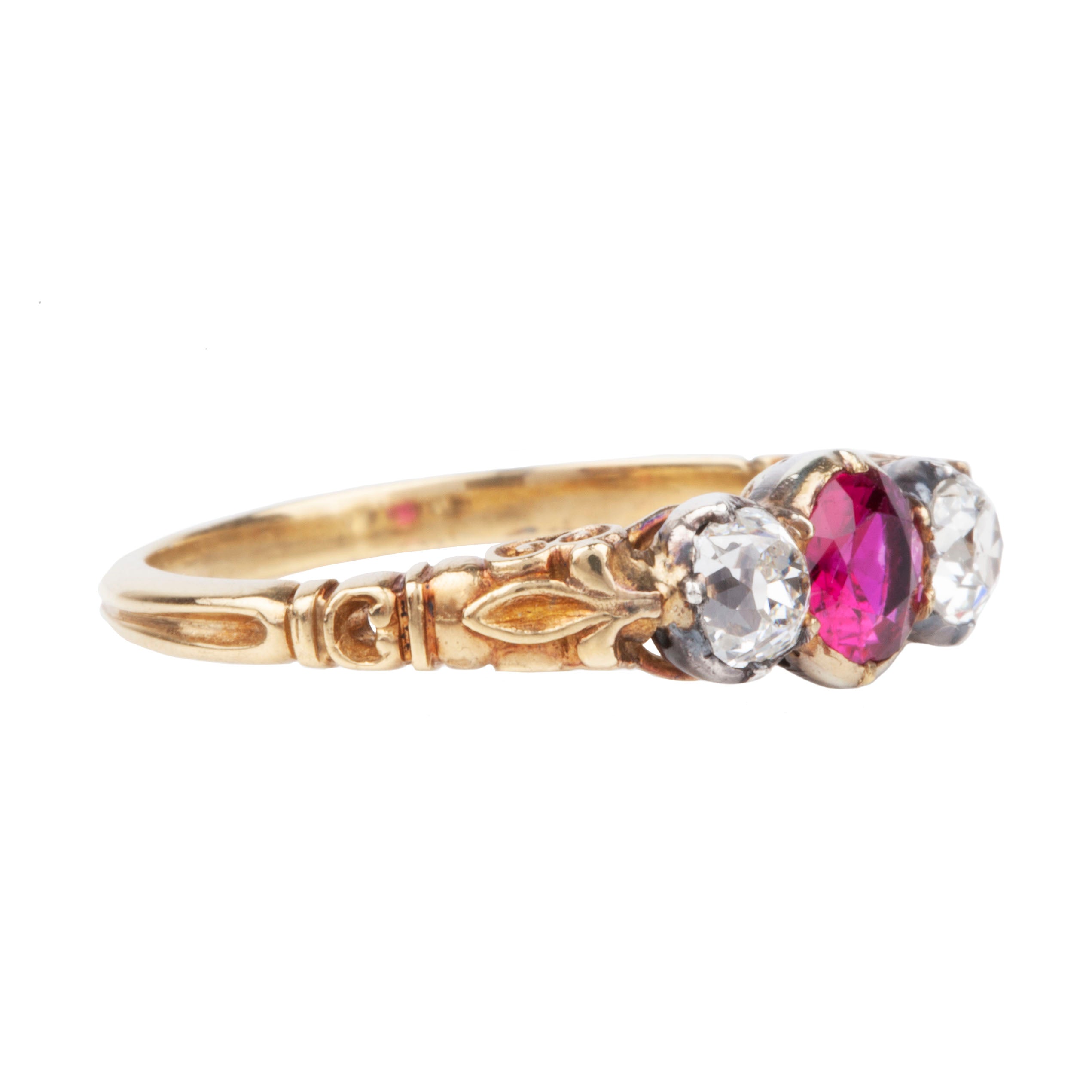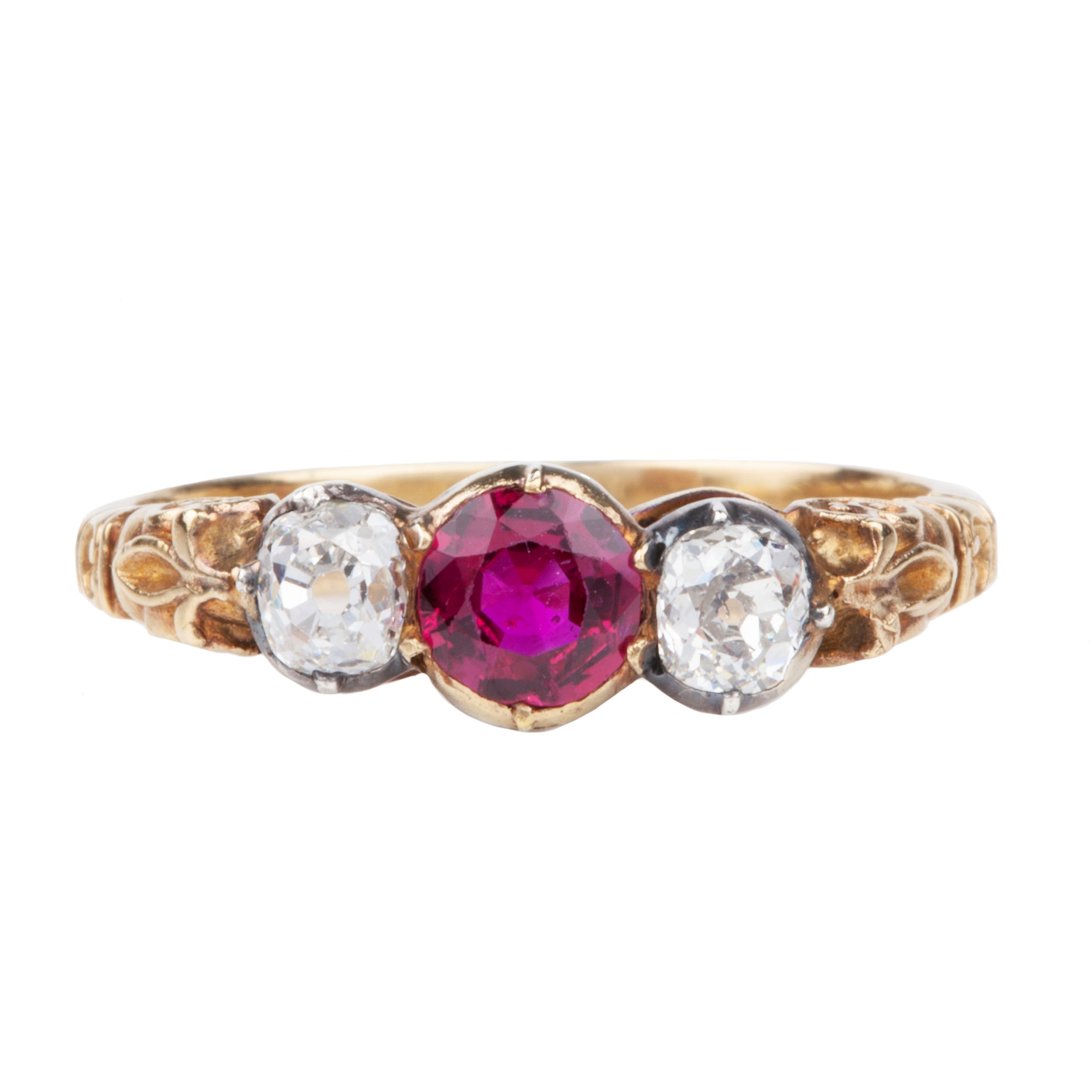Victorian era ruby and diamond ring. Two old mine cut diamonds flank a single old cut ruby set in silver topped 18k gold with open backed settings. Lovely detailed shoulders and shank with fleur-de-lis details. Approximately 0.60 carat unheated ruby and 0.40 carats in total diamond weight, I/J color and SI1/SI2 clarity. English in origin. Circa 1860.