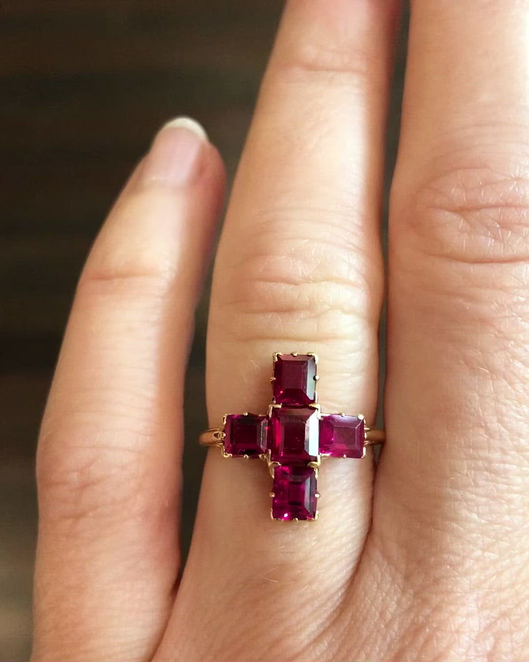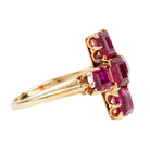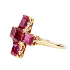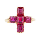Late Victorian Era Ruby Ring. A rare example of 5 finely color-matched rubies in a cruciform design. Set with delicate scalloped prong settings in 18k Gold. Approximately 2.40 carats of unheated rubies. Circa 1900. English in Origin.