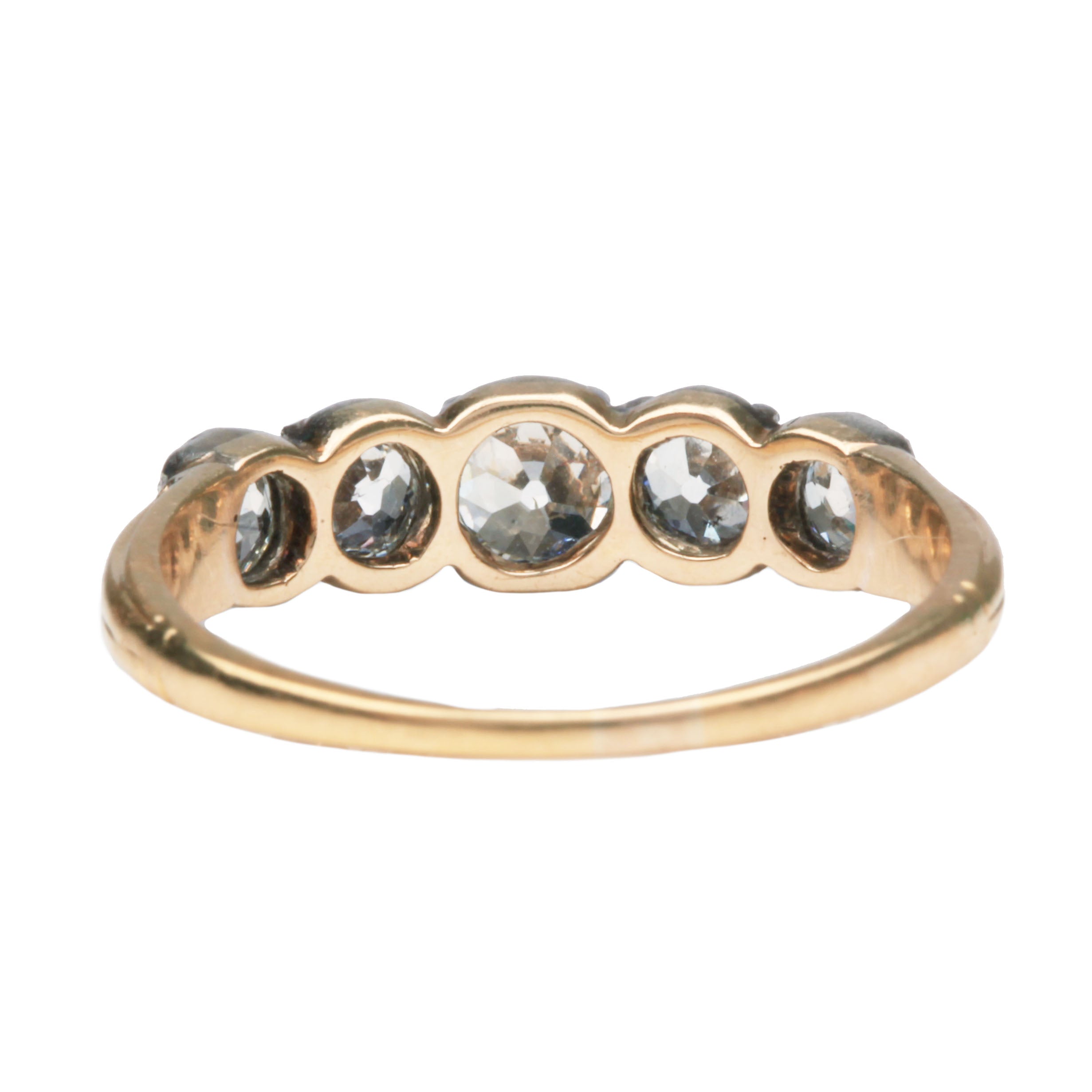 Victorian five stone diamond half hoop band. Old mine cut diamonds are set in silver on gold and open backed settings. English in origin. Circa 1860.
