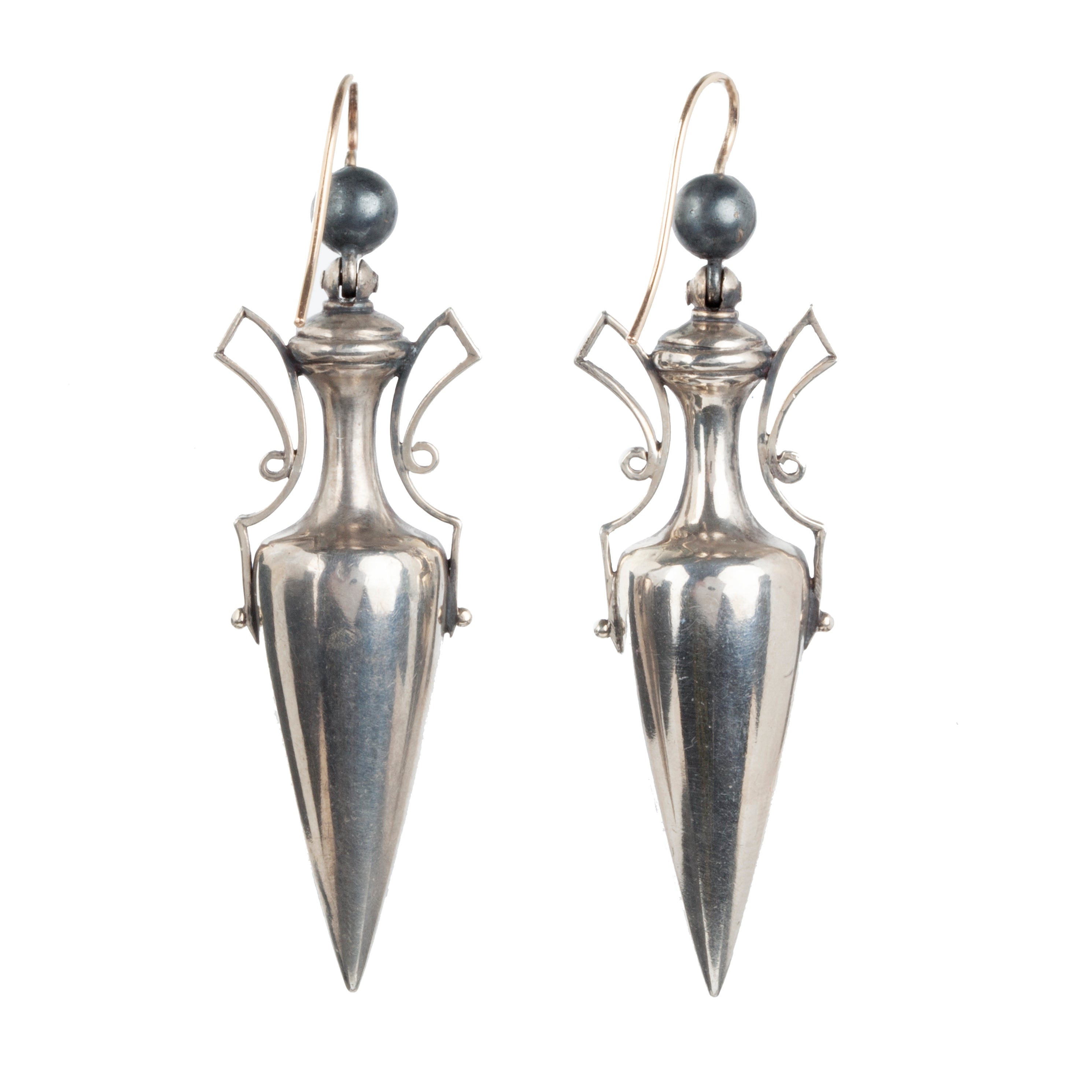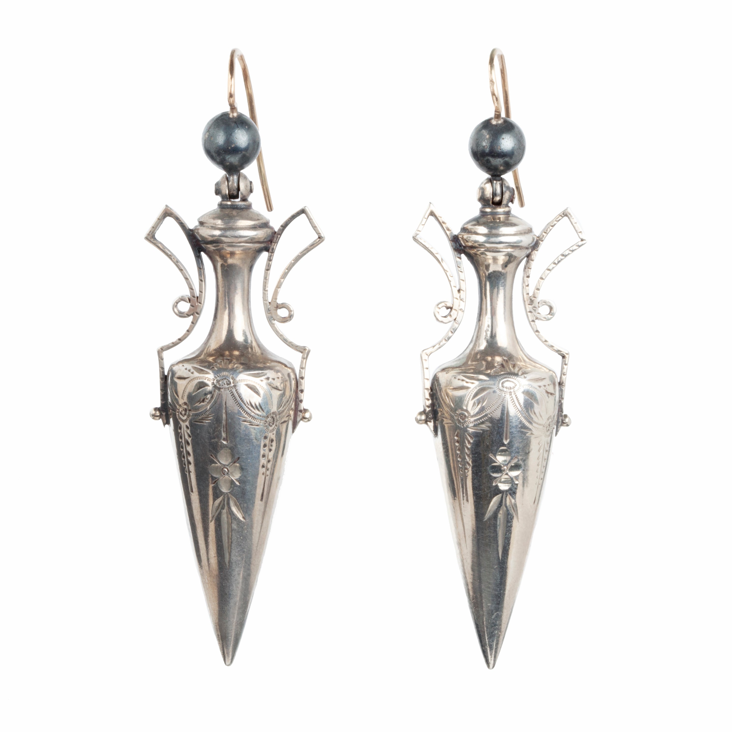 Victorian era sterling silver amphora earrings. It is rare to find finely crafted earrings in silver from this time period. Hand carved details and hanging from gold ear wires. Light in weight and very wearable. English in origin. Circa 1870.