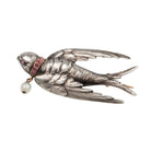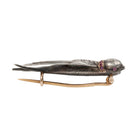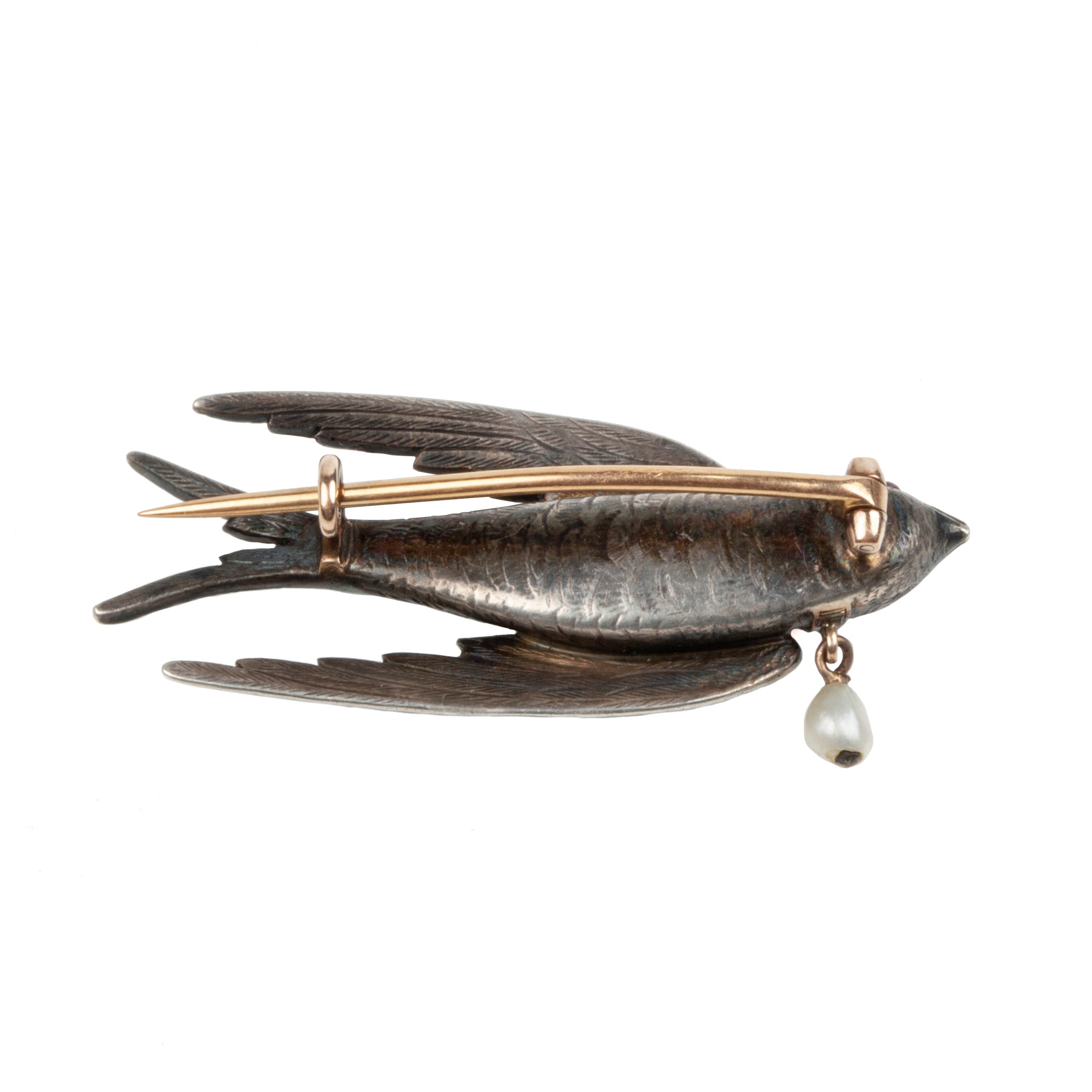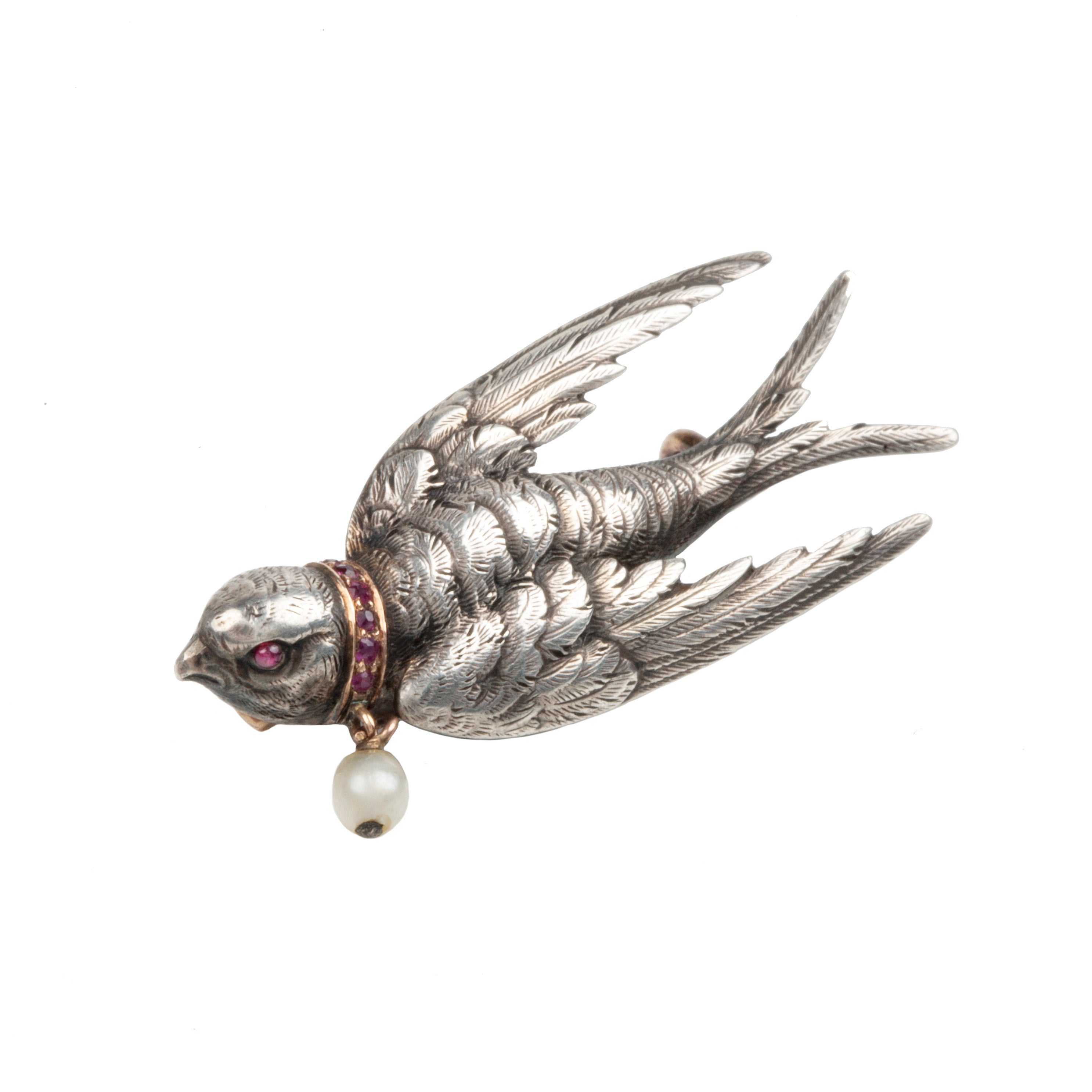 Victorian silver and gold sallow brooch. In silver and gold, with a ruby collar and a pearl tassel. The original brooch fixture. Beautiful engraved feather details. English in origin. Circa 1880.
