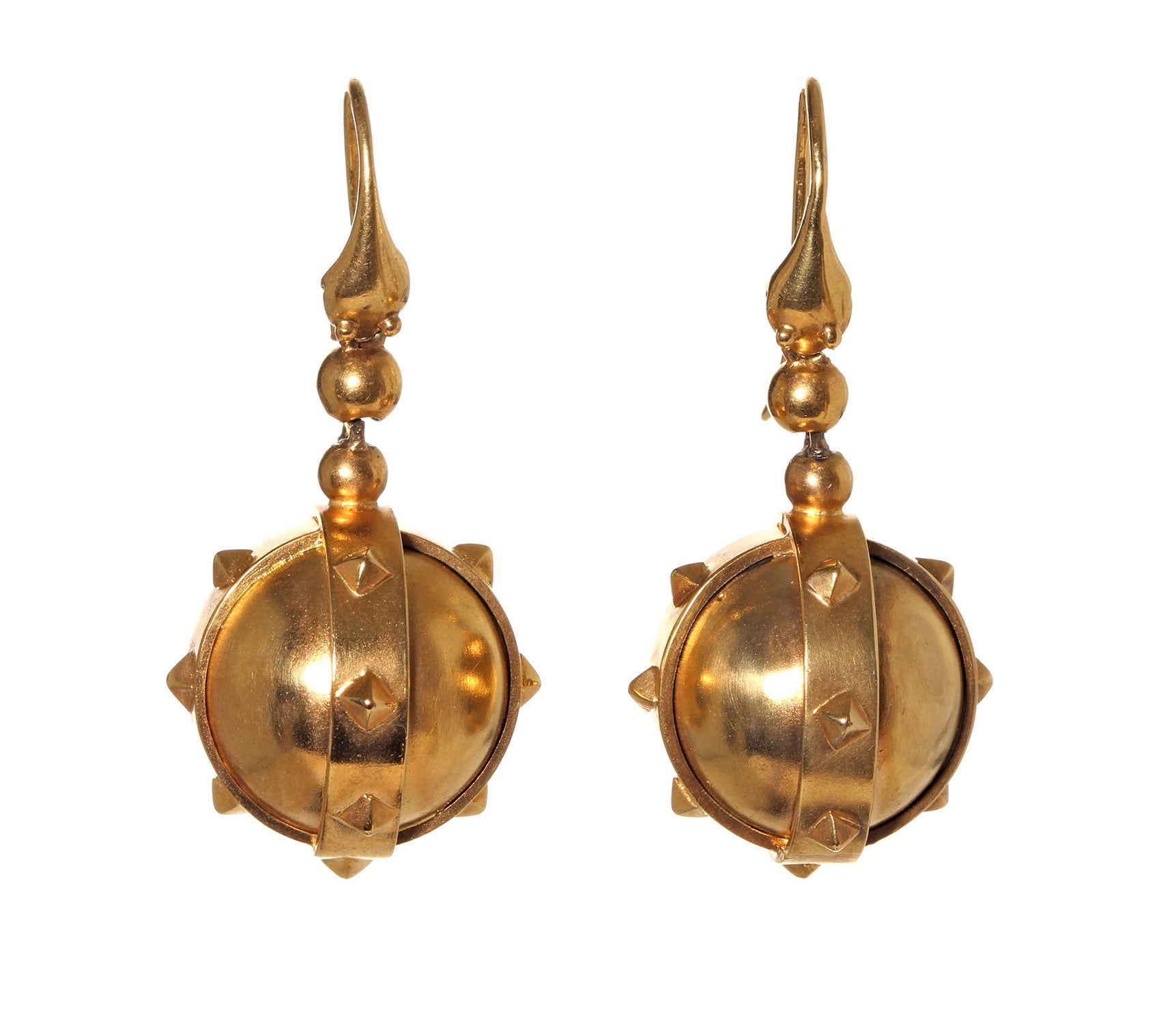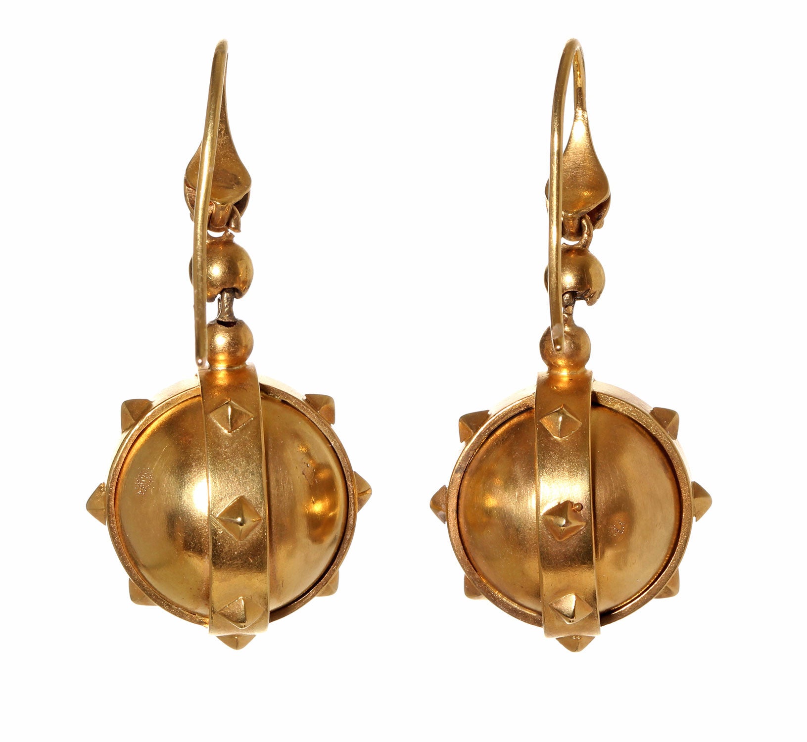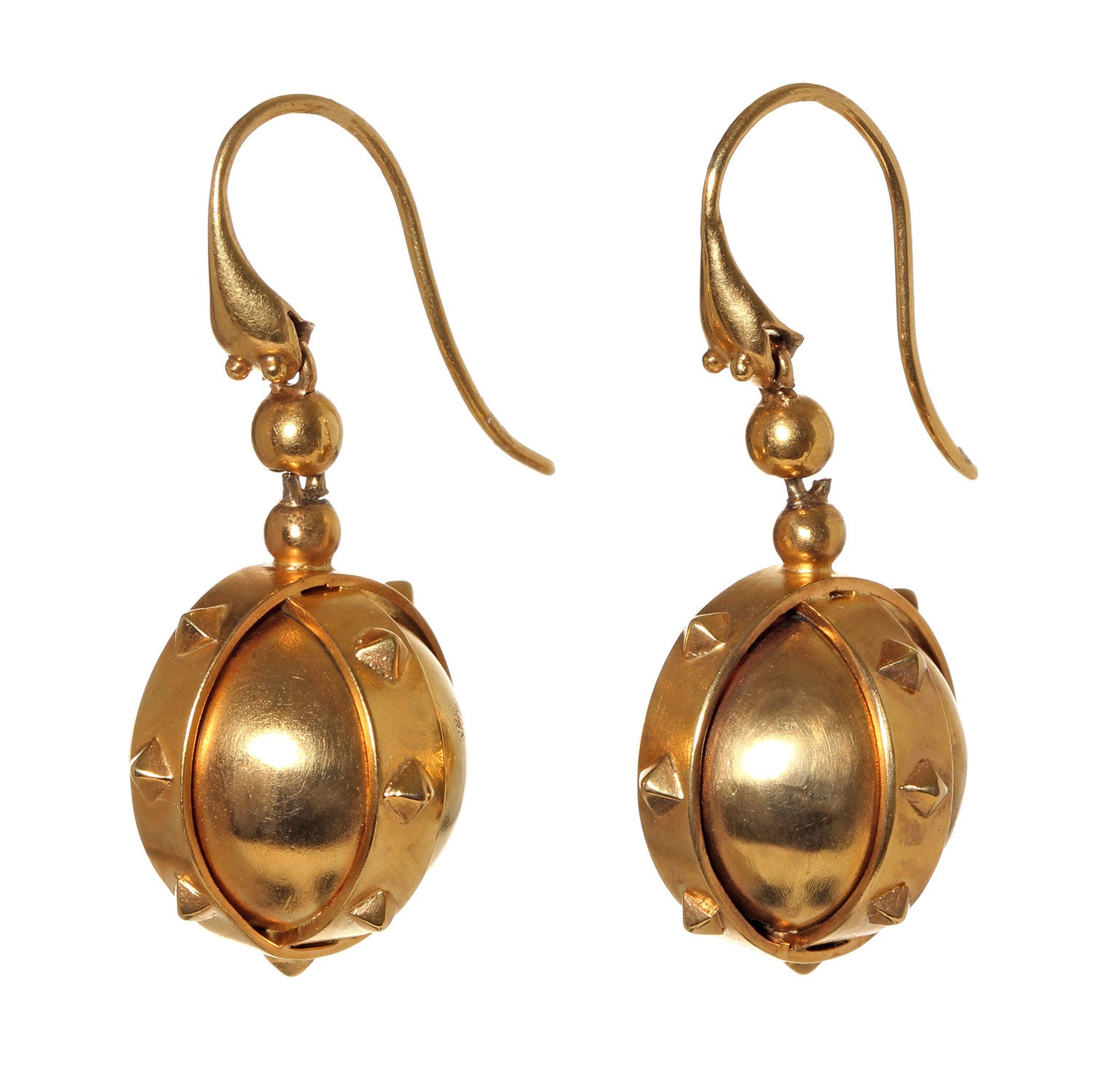 Victorian snake and mace gold earrings. High victorian snake heads suspending a mace like balls in yellow gold. Excellent condition with original bloomed gold finish. Light surface scratches commensurate with age. Endless love and Protection? Great everyday weight. English circa 1870. 1.4" drop.
