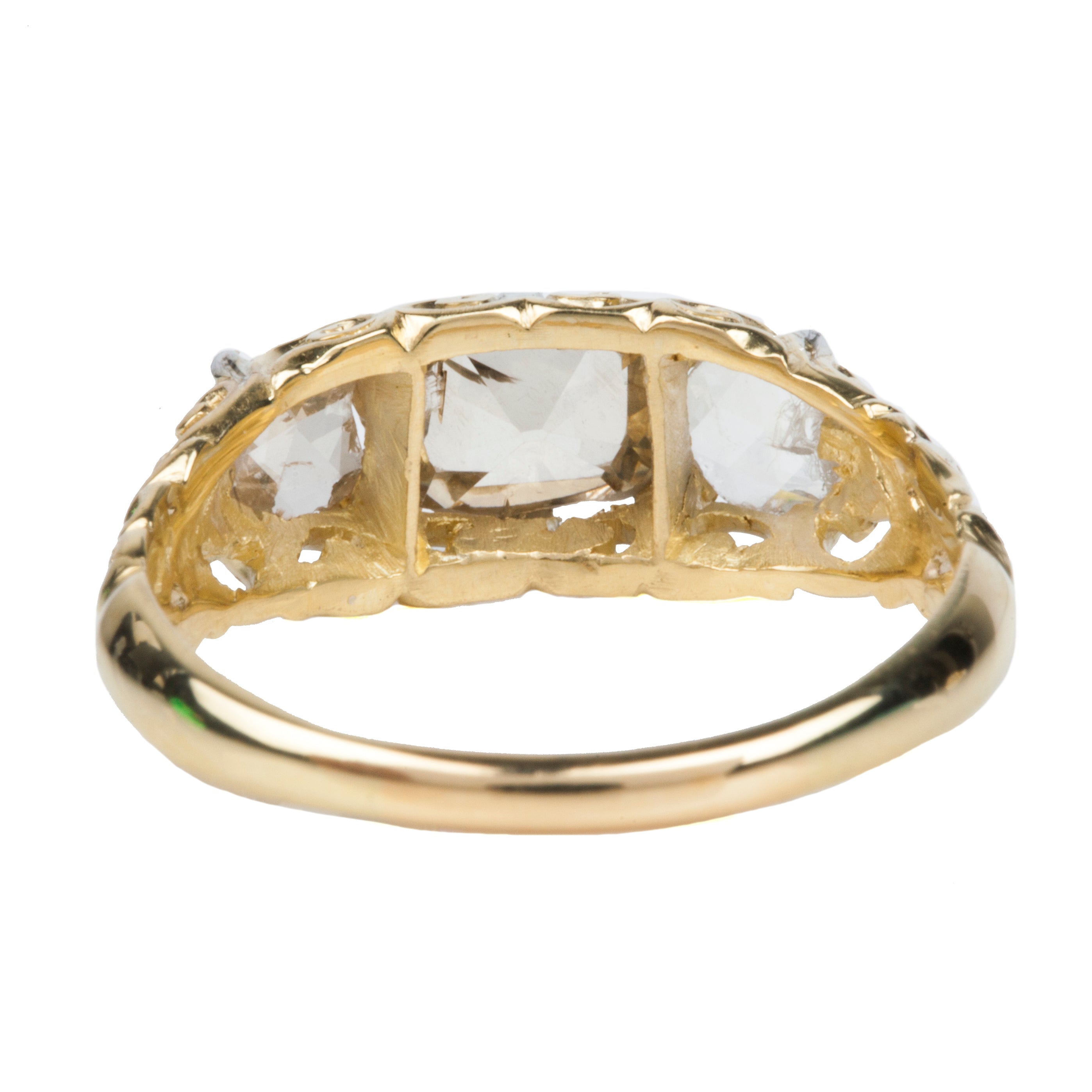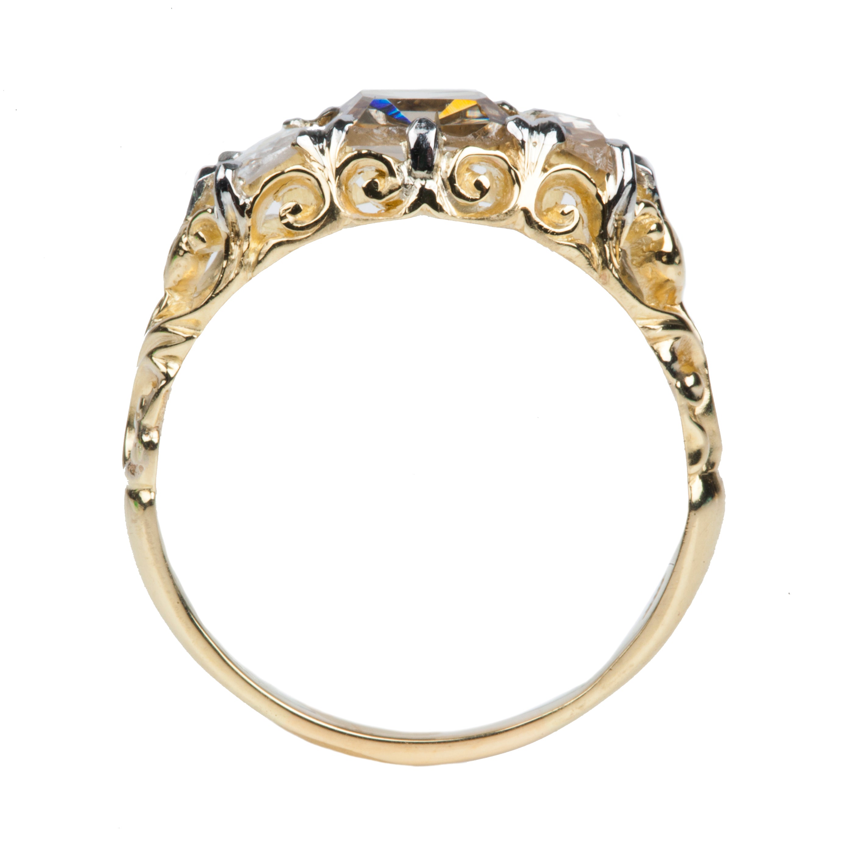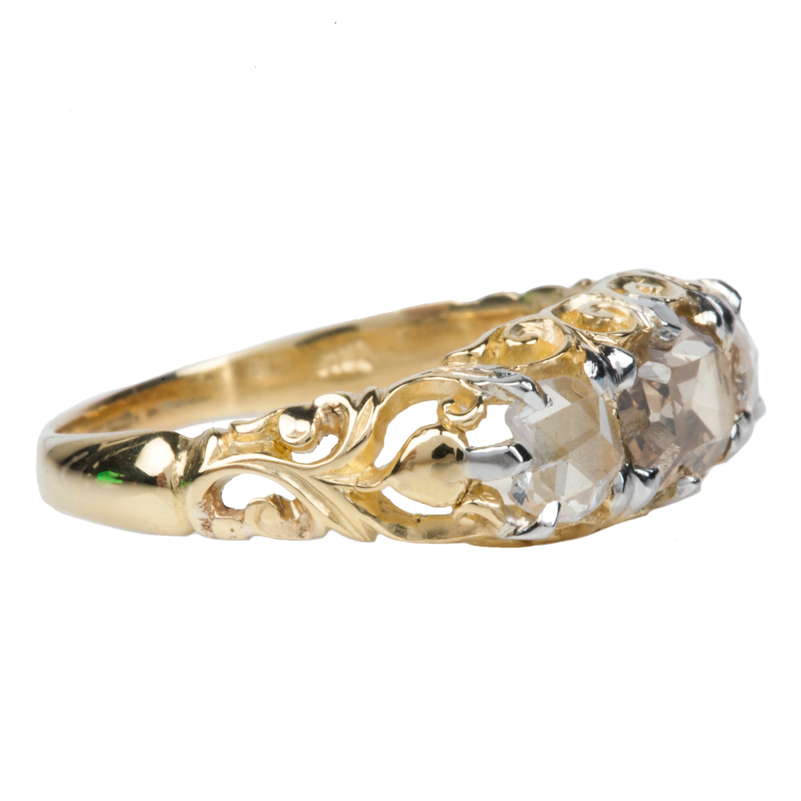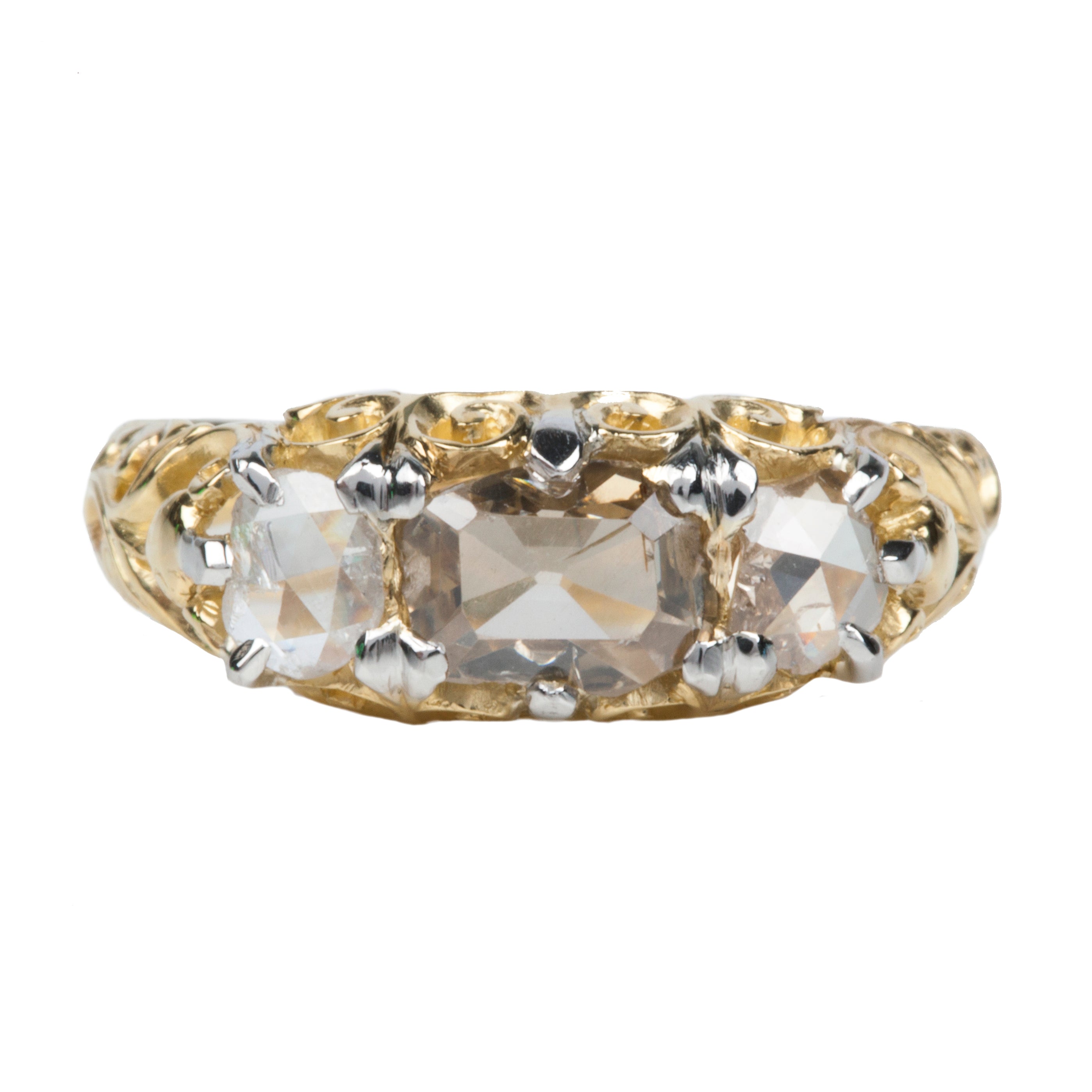 Victorian Era 3- stone diamond ring. The center stone is an early table cut diamond with golden brown undertones. The side stones are whiter rose cut diamonds. Although the stones would have been cut in the 18th and 19th centuries the setting is in an Art Nouveau style, Circa 1900. The prongs have had some restoration done in platinum.