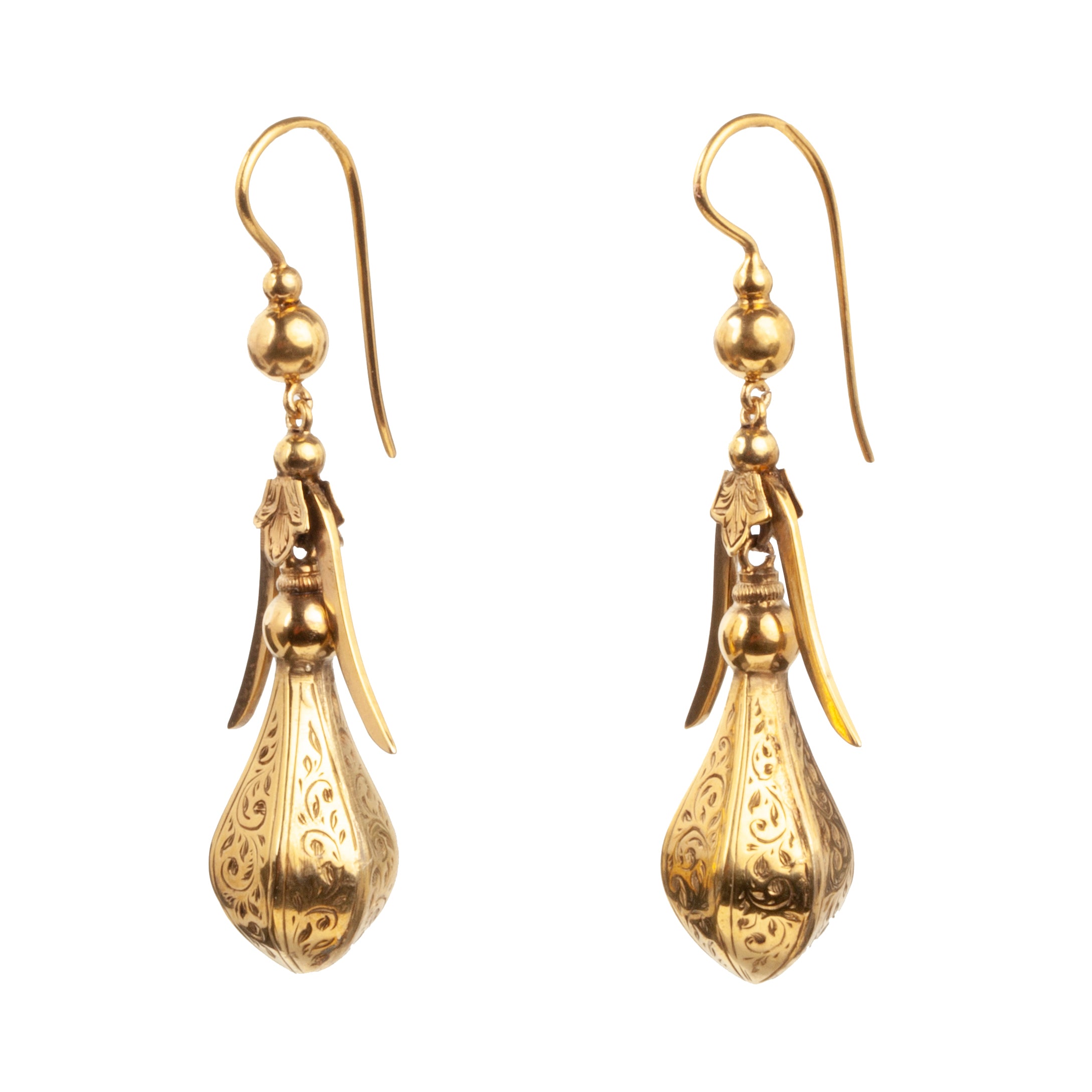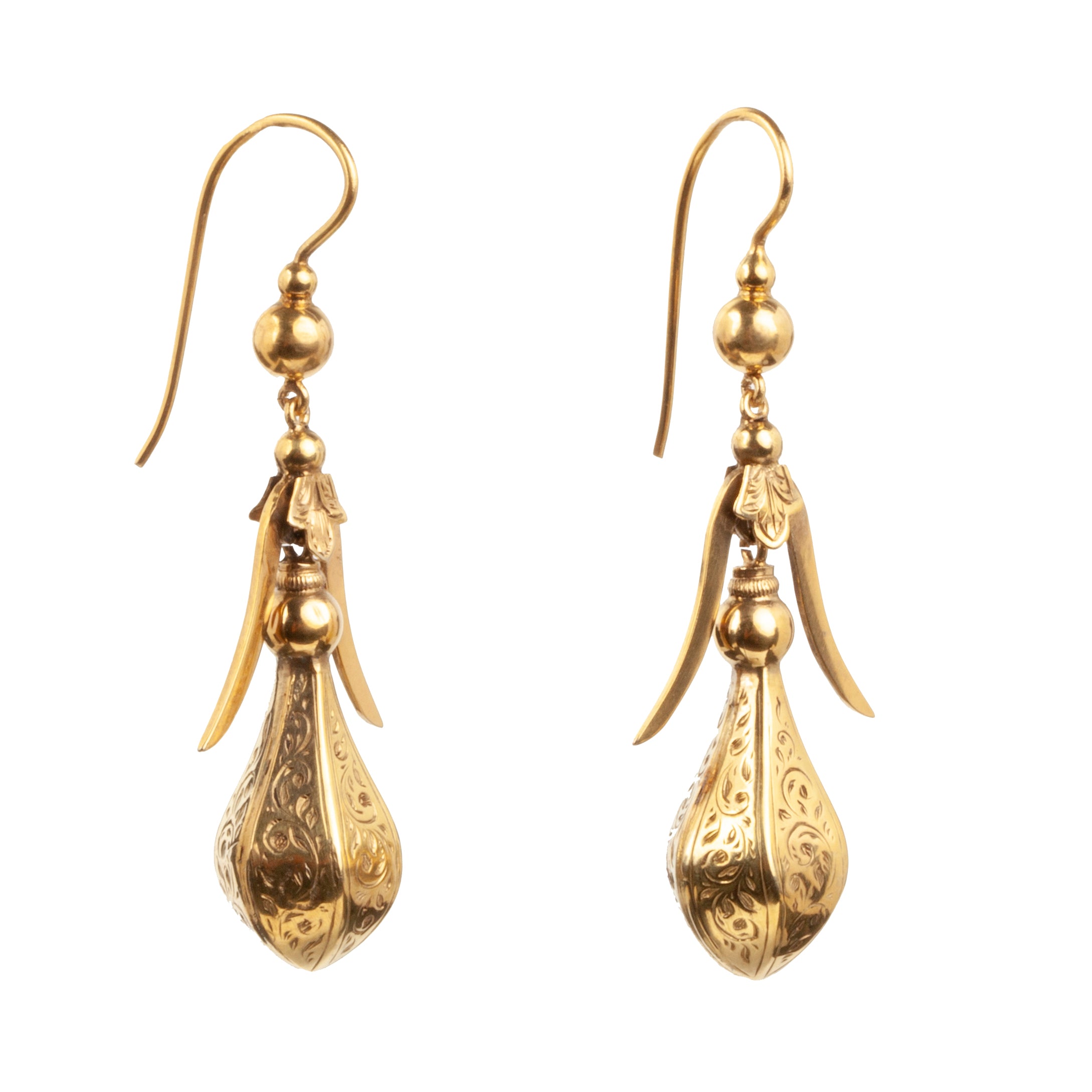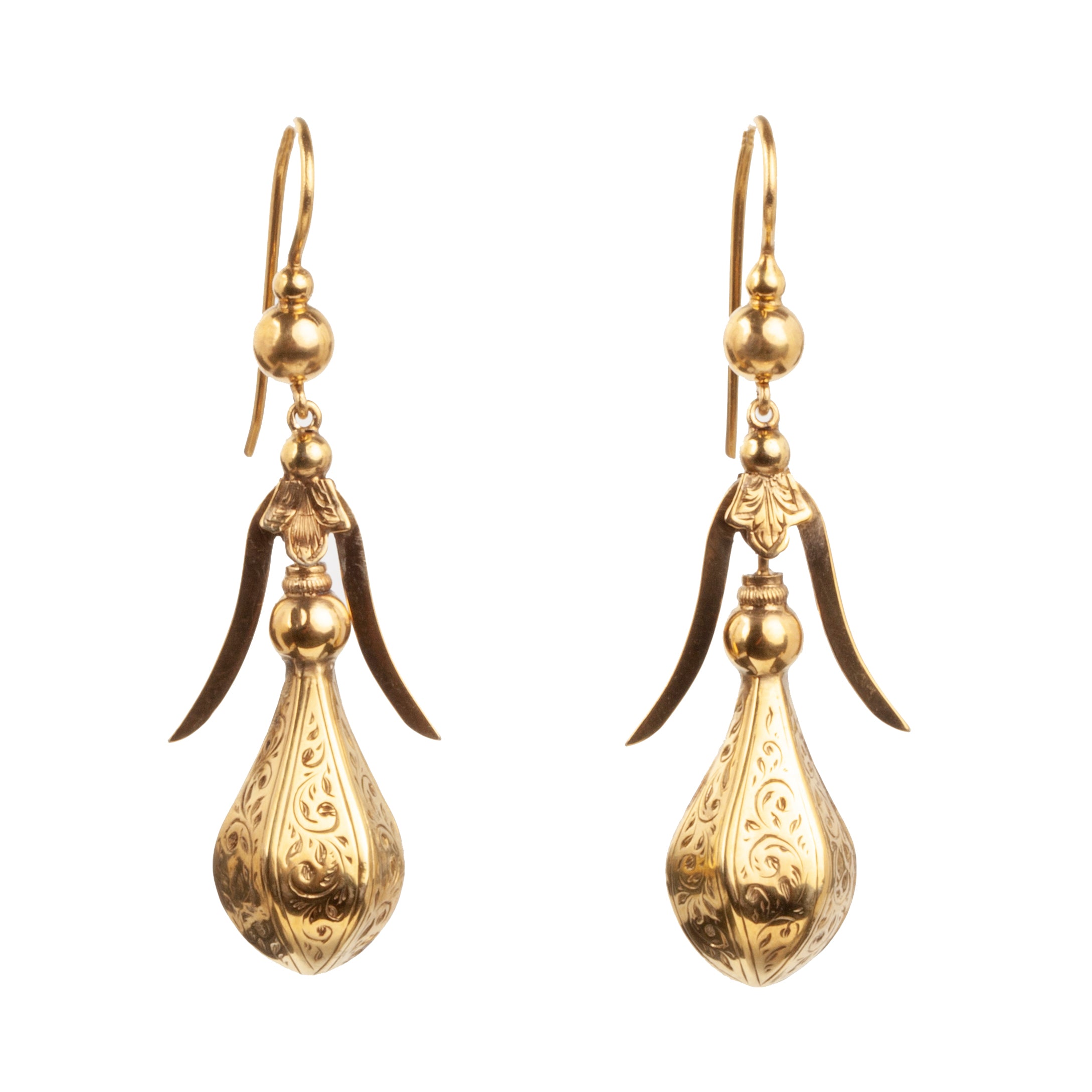 Victorian Era gold earrings with great movement and sculptural shape. Hand engraved details in 18k gold. English in origin. Circa 1870.