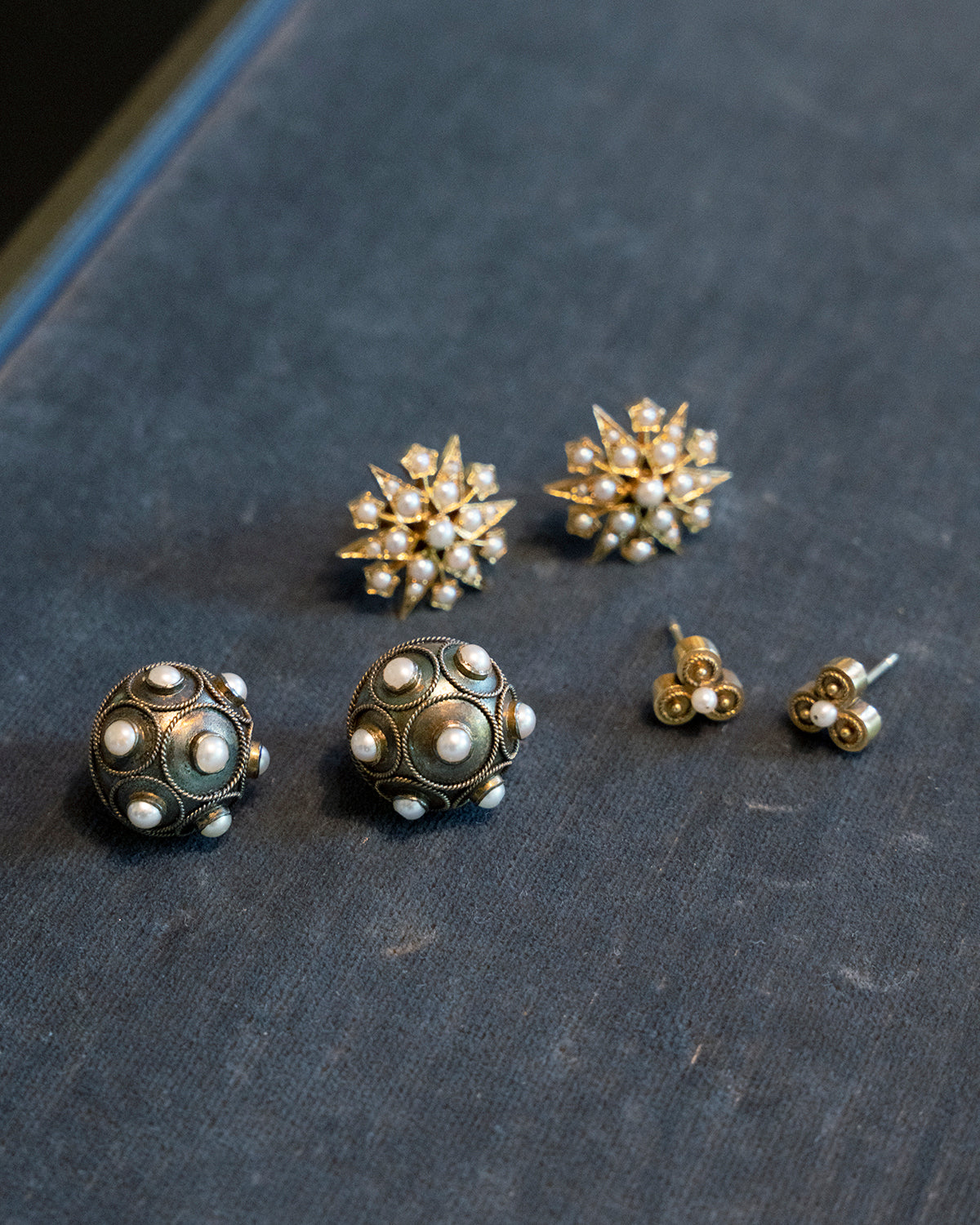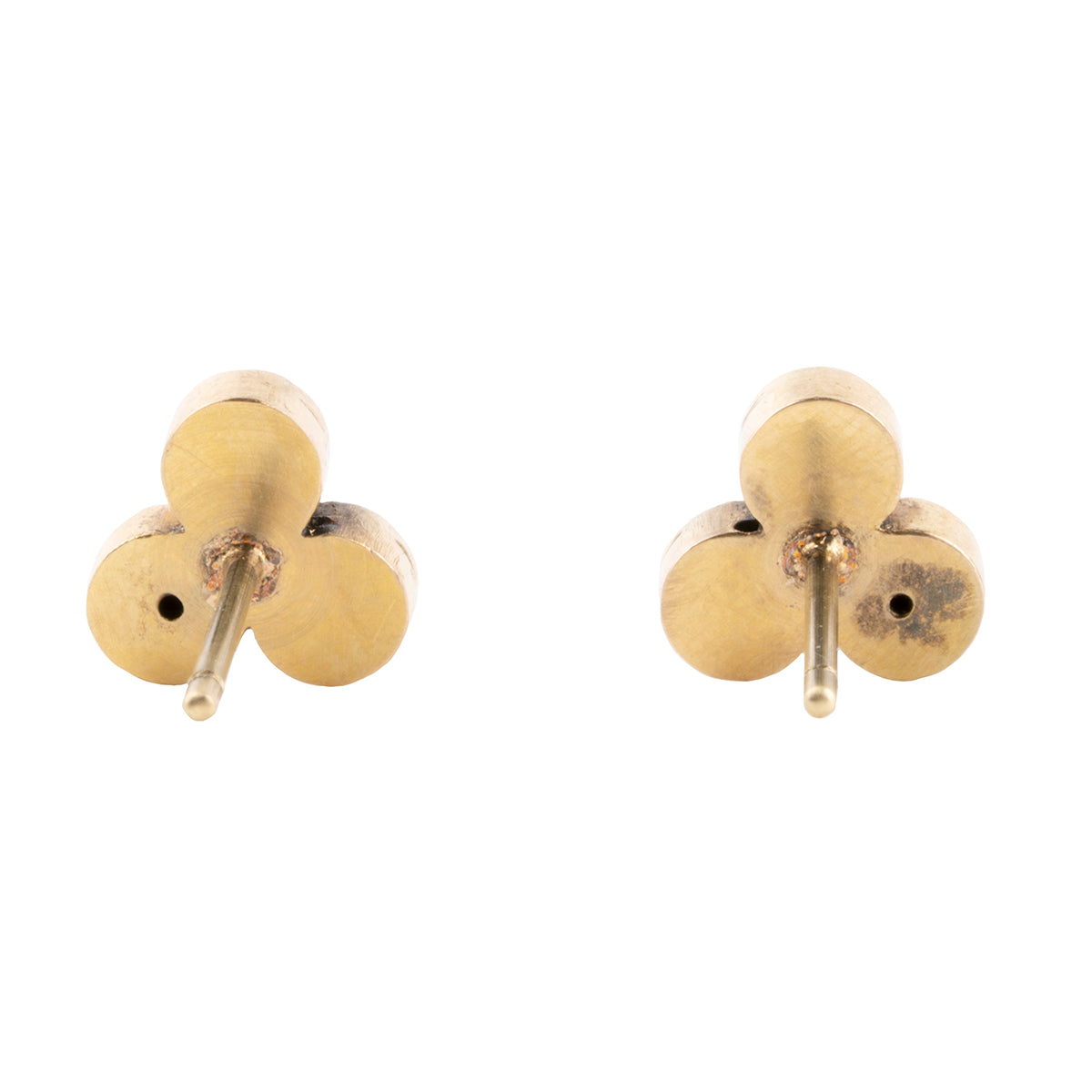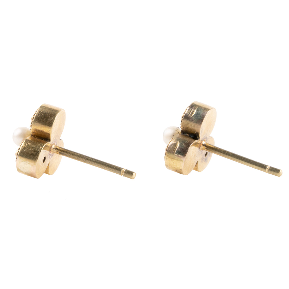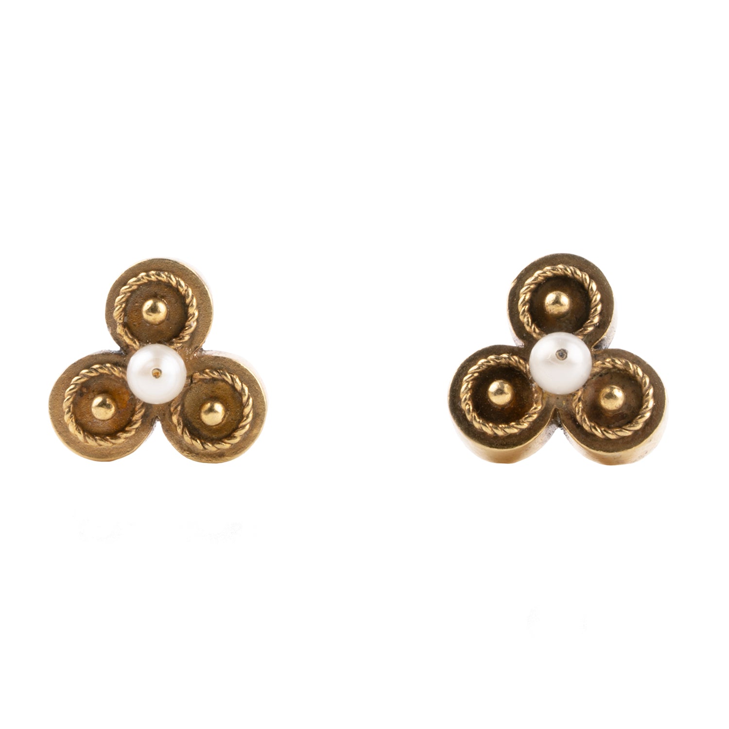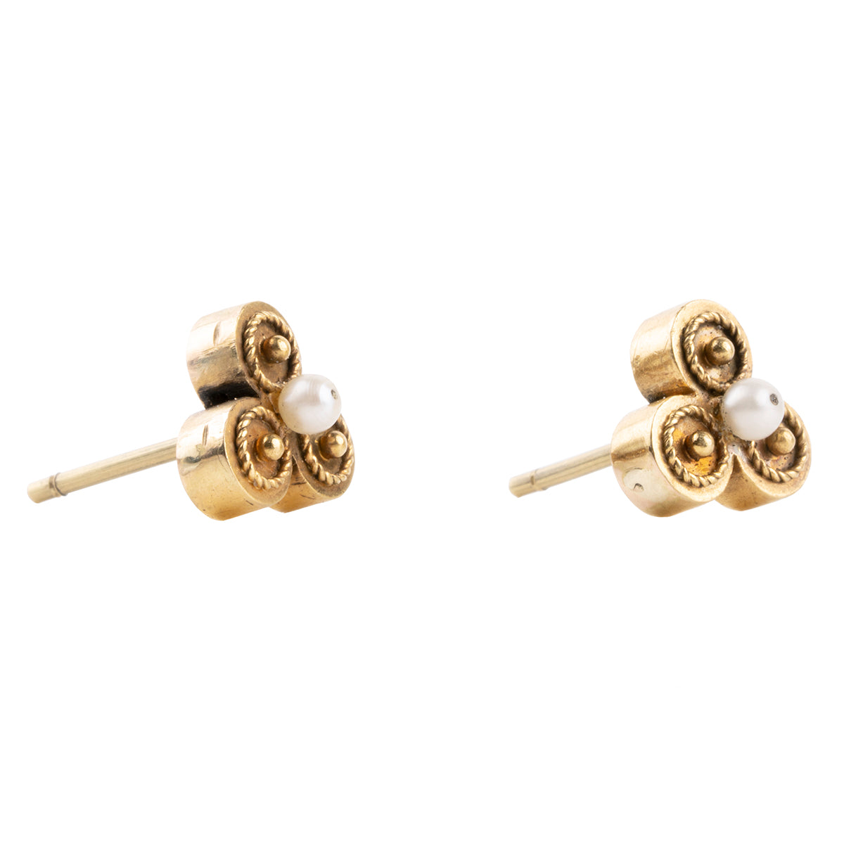Victorian era Etruscan revival pearl trefoil stud earrings, in gold. English in origin. Circa 1870.