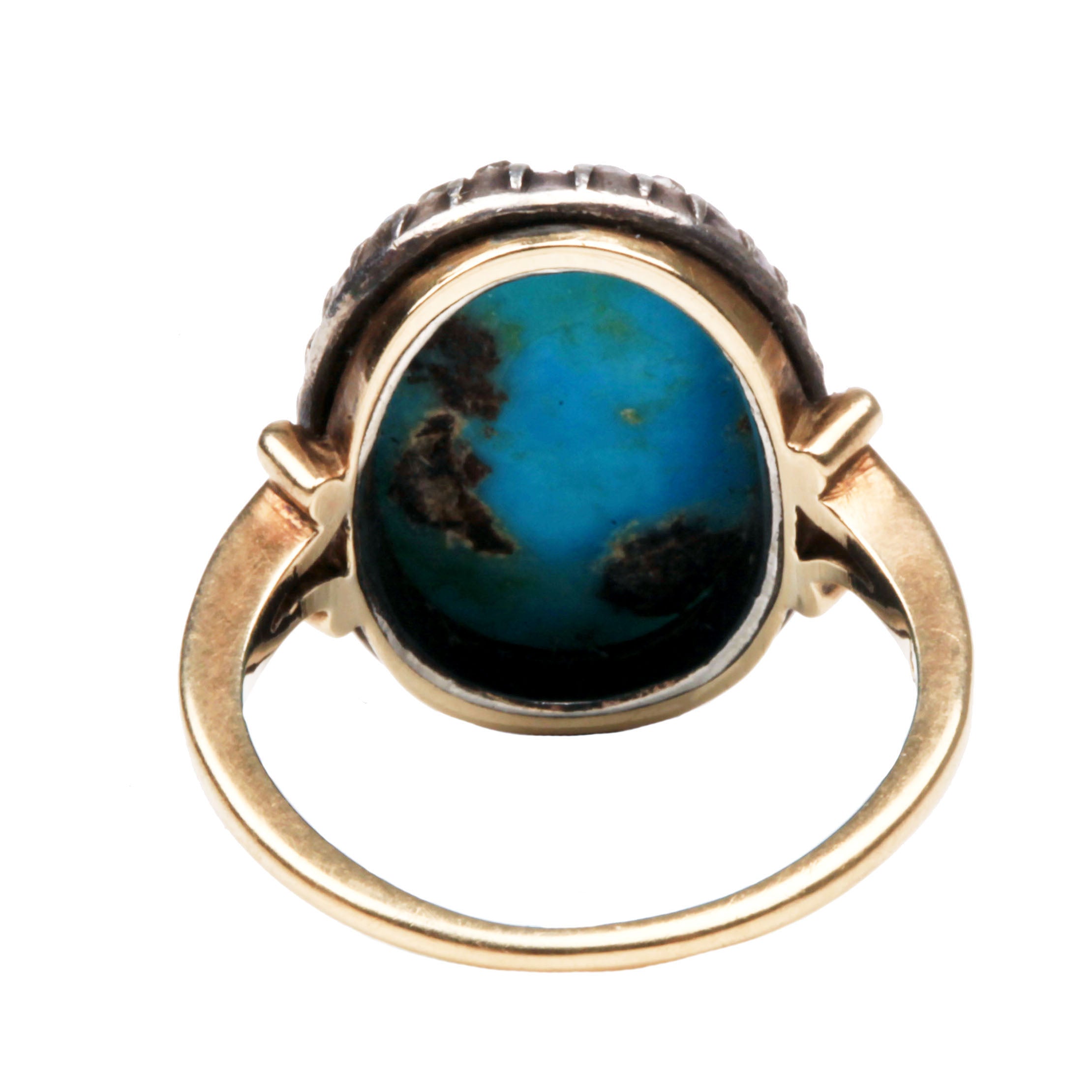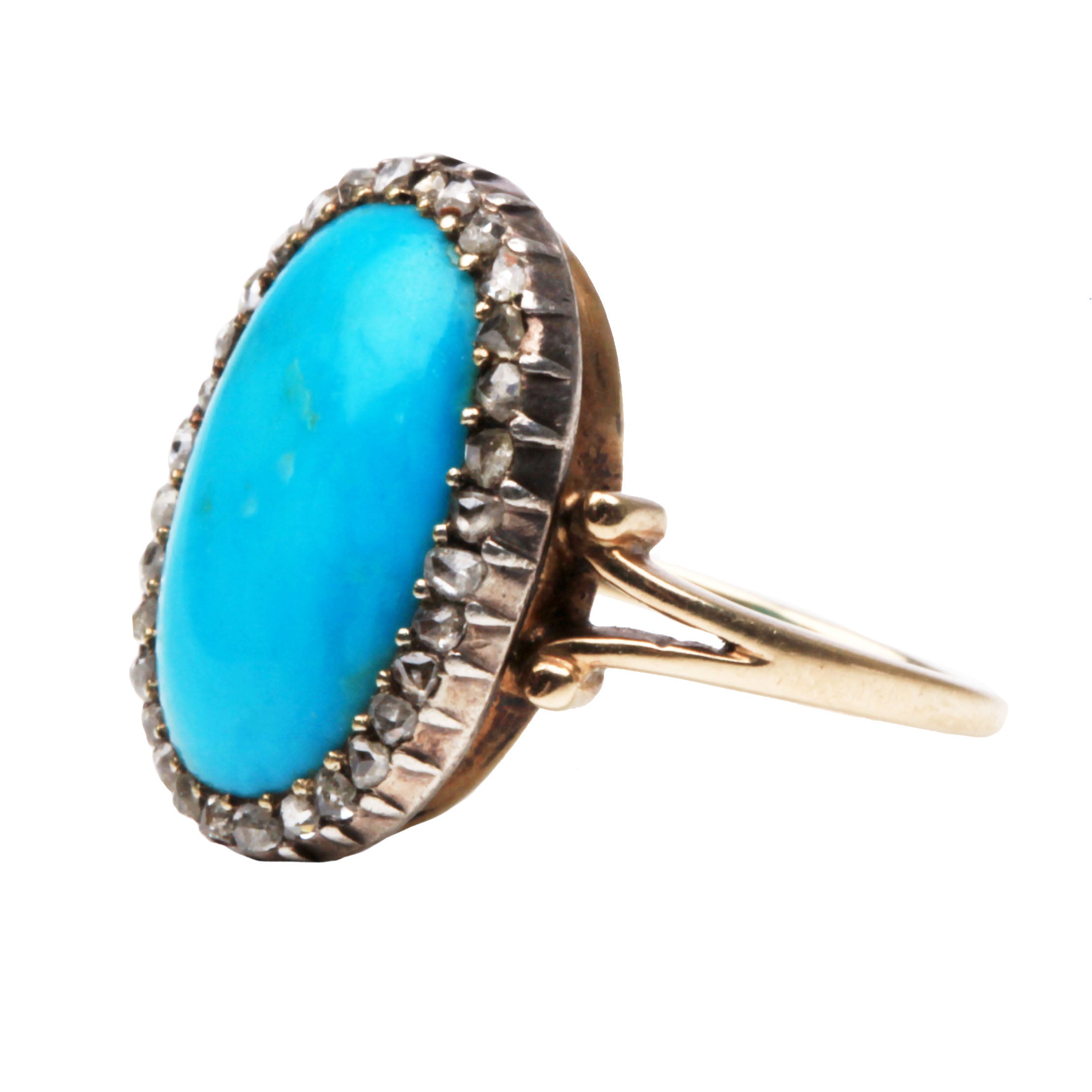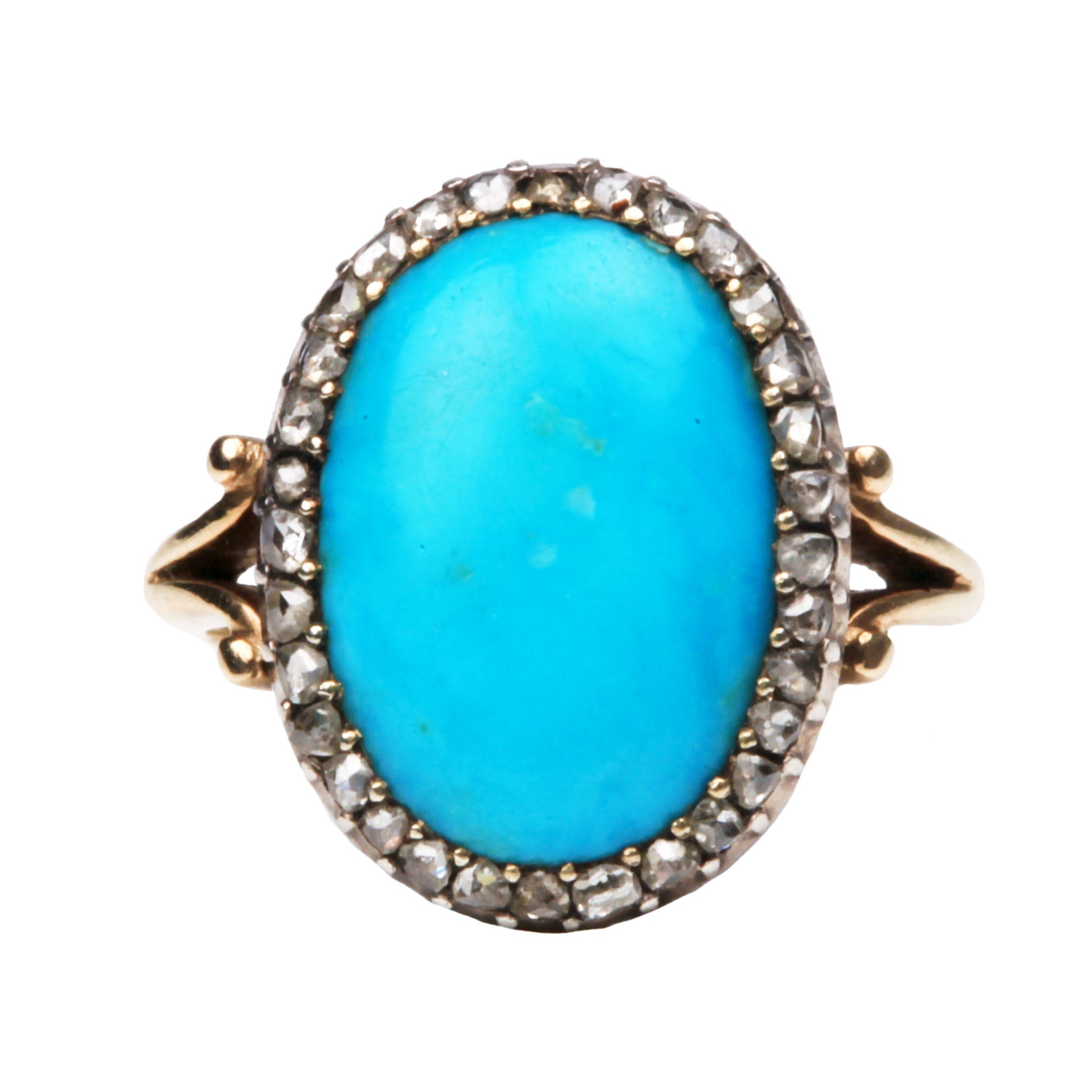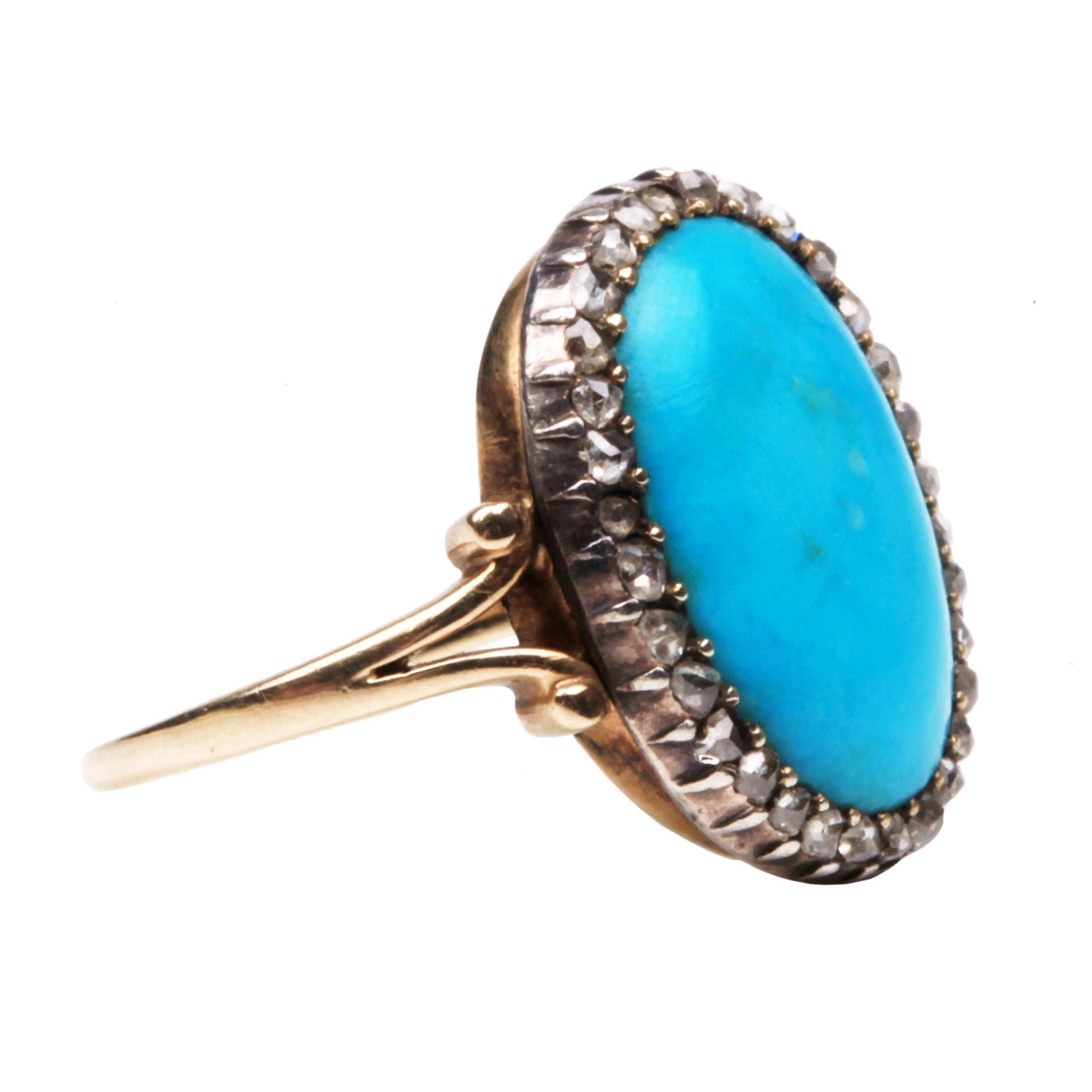 Victorian oval shaped Persian turquoise and rose cut diamond cluster ring. Diamond set in sliver pinch collet setting on gold band. English in origin. Circa 1860.