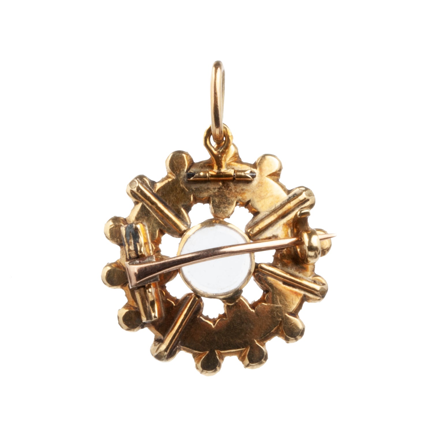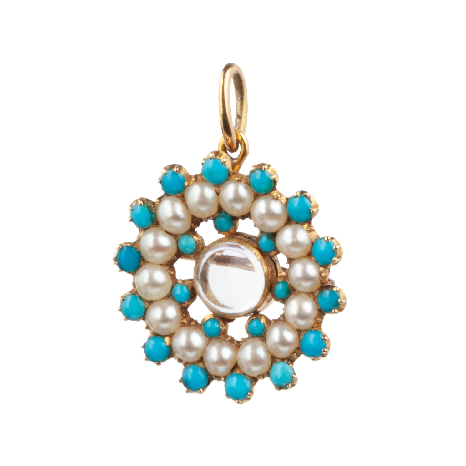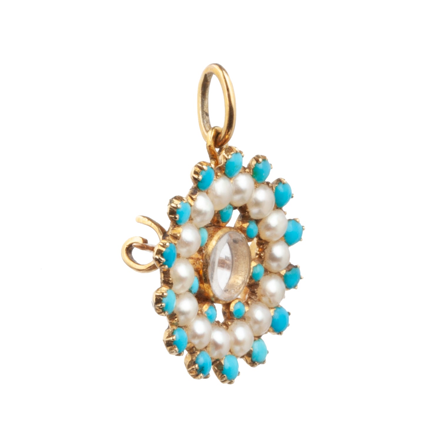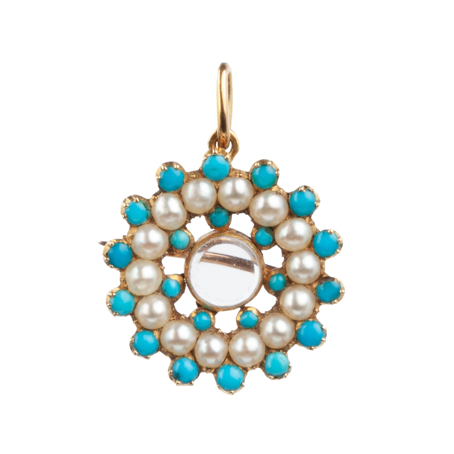 Diminutive, early 19th-century gold locket with Persian turquoise and pearls. Original glass intact. Can be worn as a brooch or pendant. Lockets like these pre-date photography and would have contained a tiny knot of hair of a loved one. Reach out for details about getting your own sentimental hair placed inside.