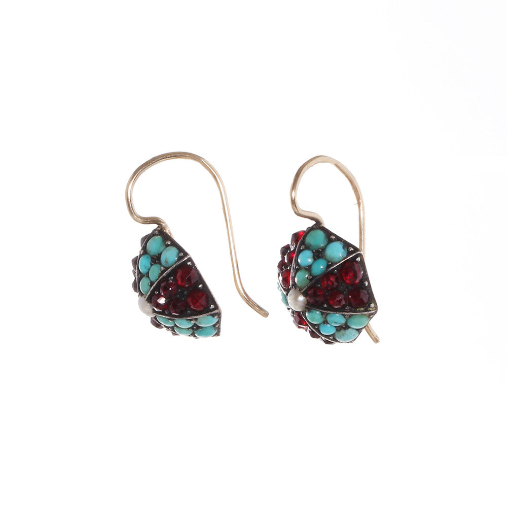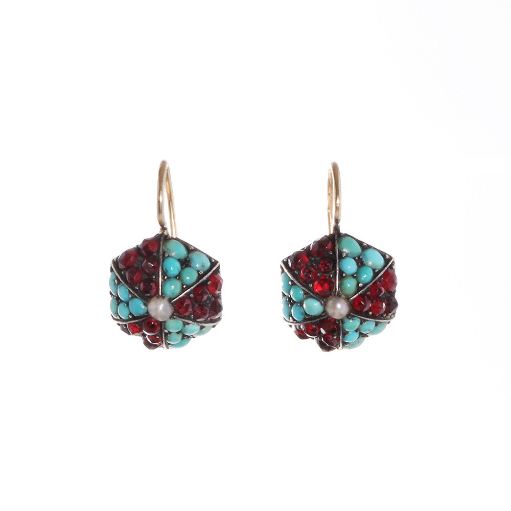 Victorian era turquoise, garnet, and pearl earrings in gold. Circa 1880, English in Origin. Gold French hook earring wires.