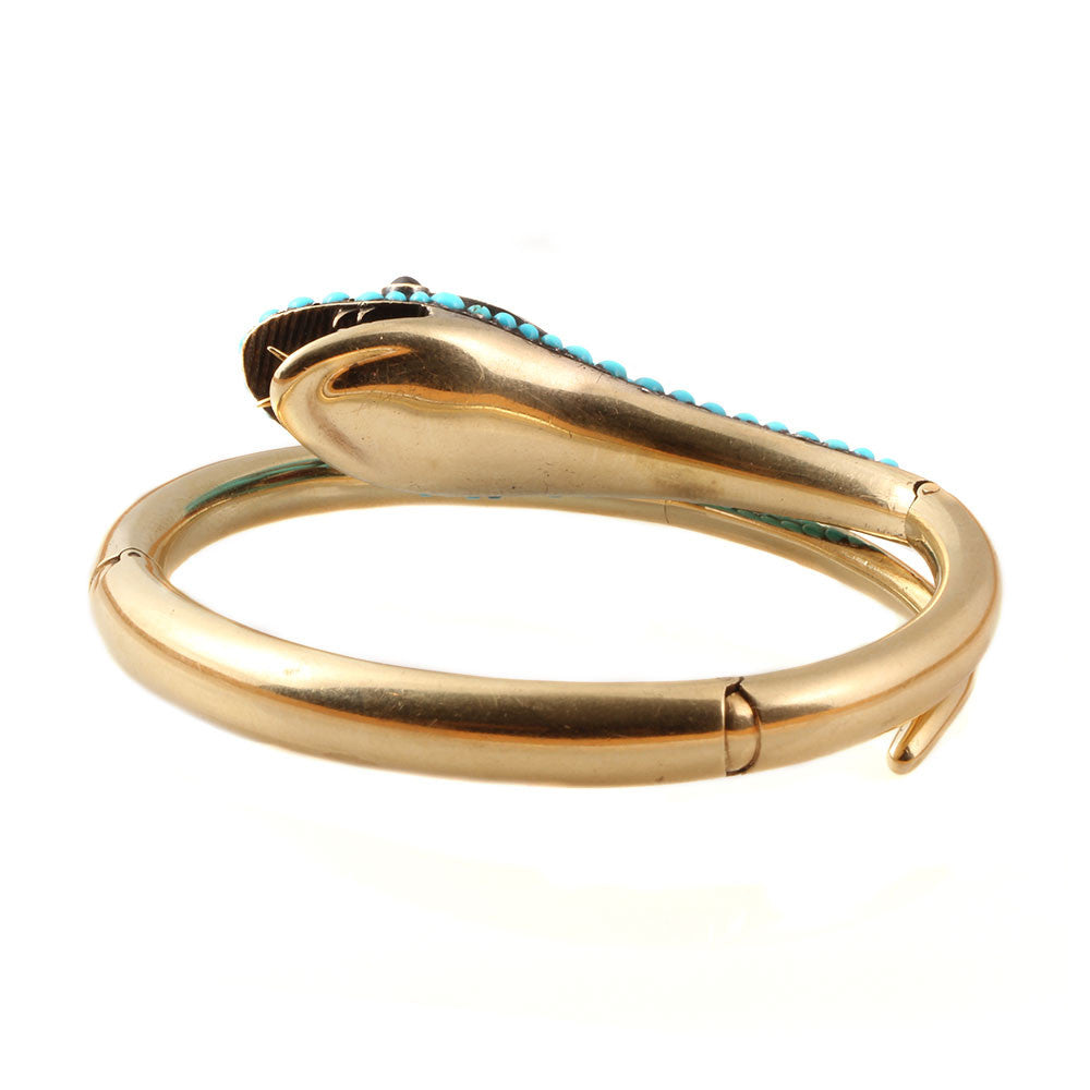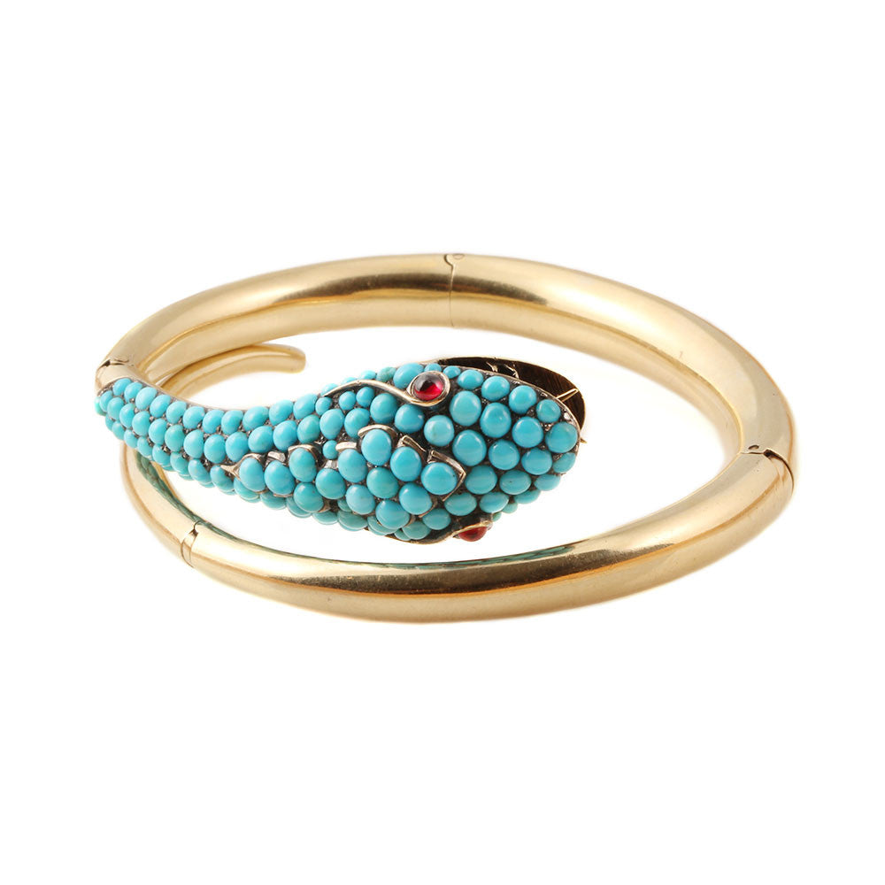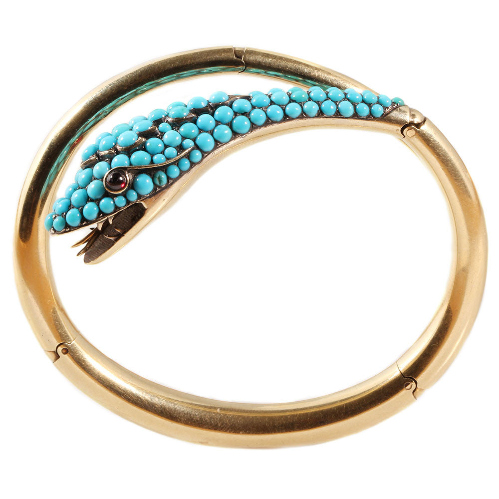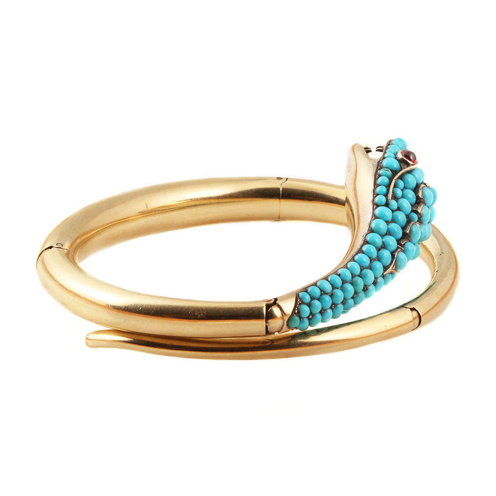 Mid 19th century 15k gold snake bangle. Beautifully set persian turquoise stones with garnet eyes. The serpent is masterfully hinged at 4 separate points allowing it to fit multiple wrist sizes. Beautifully preserved. English in origin, Circa 1860.