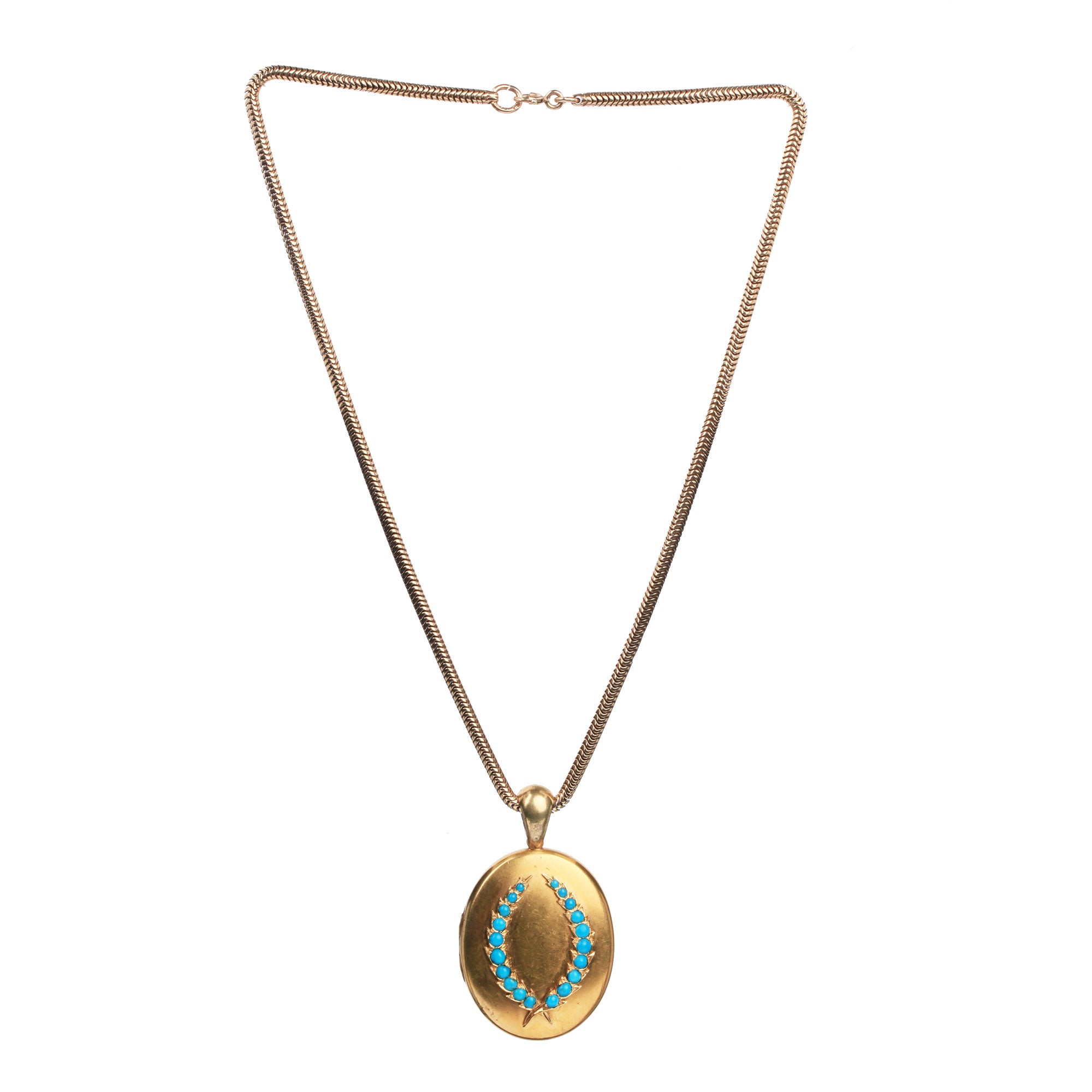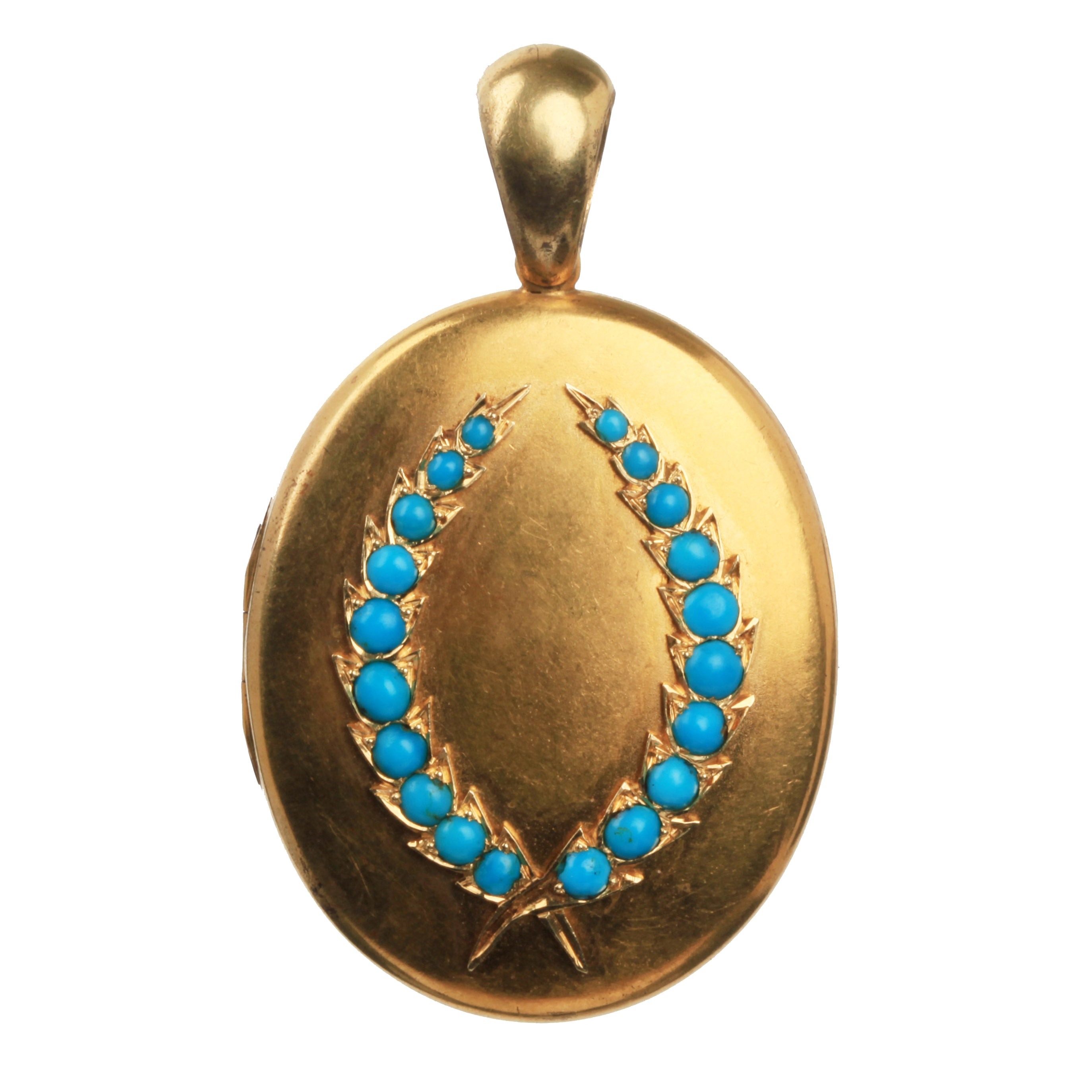 Victorian Persian Turquoise gold locket. 18k gold with graduating turquoise cabochons in the form of an olive branch wreath. In Victorian times turquoise was often given as an declaration of love. Circa 1860. English in origin.