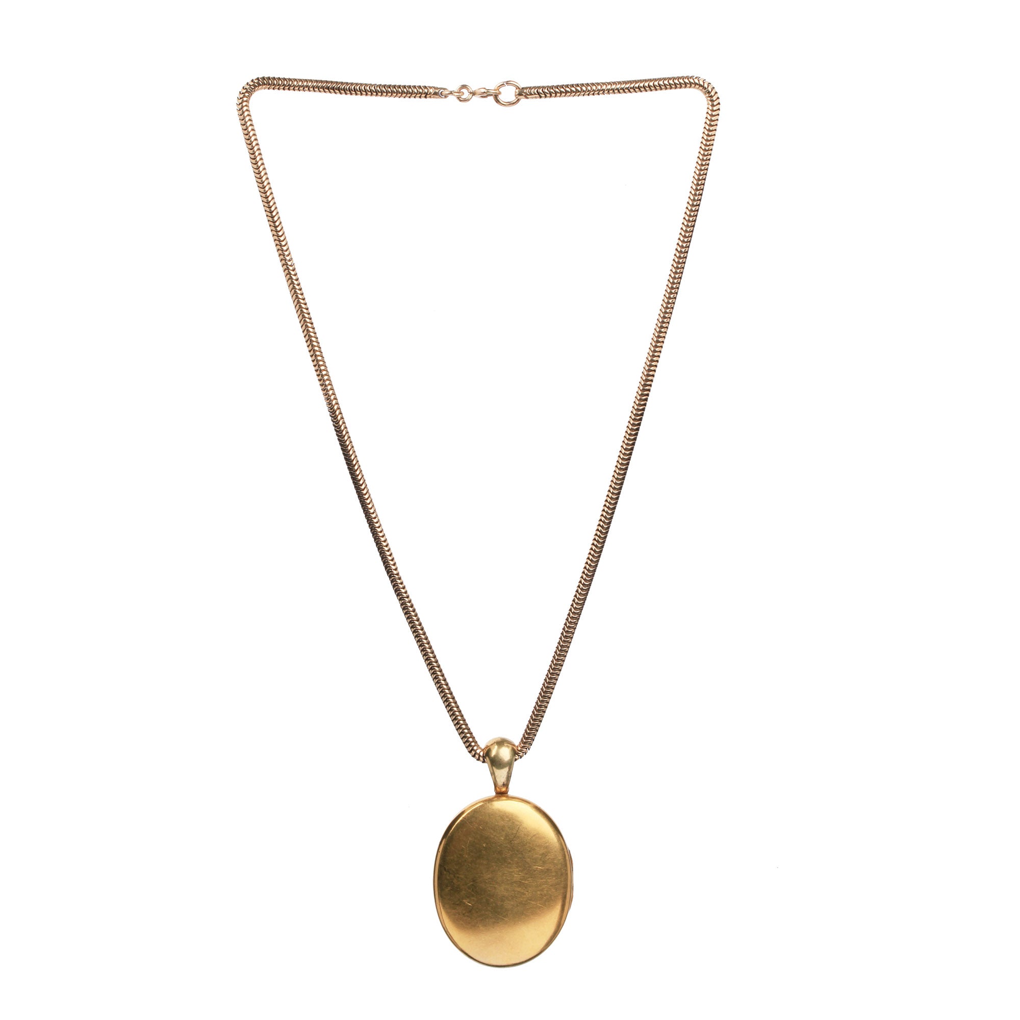 2.25" in length and 1.25" in width. The locket hangs on a Victorian 17.25" snake chain 9k gold chain, which is sold separately. Antique chains are available in-store. Please call the shop to inquire.