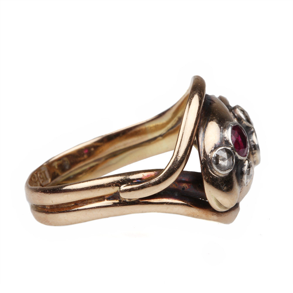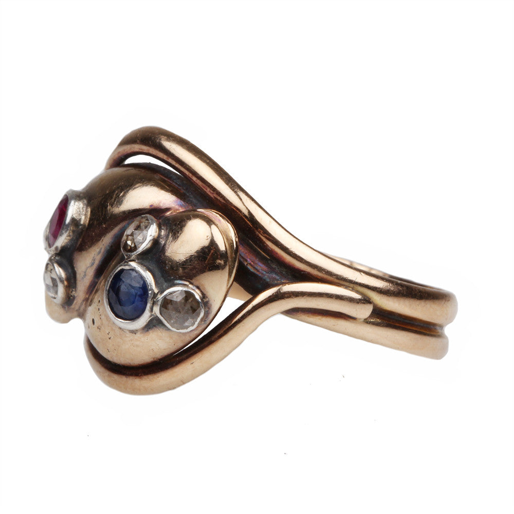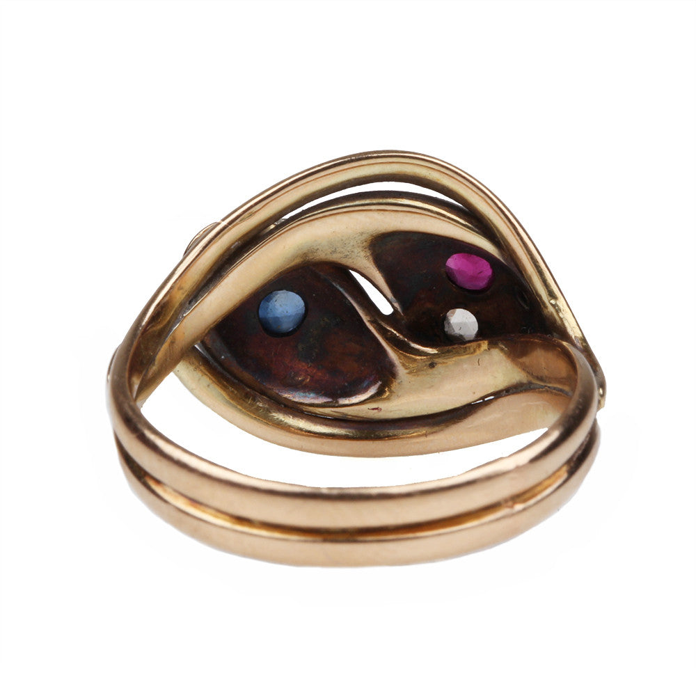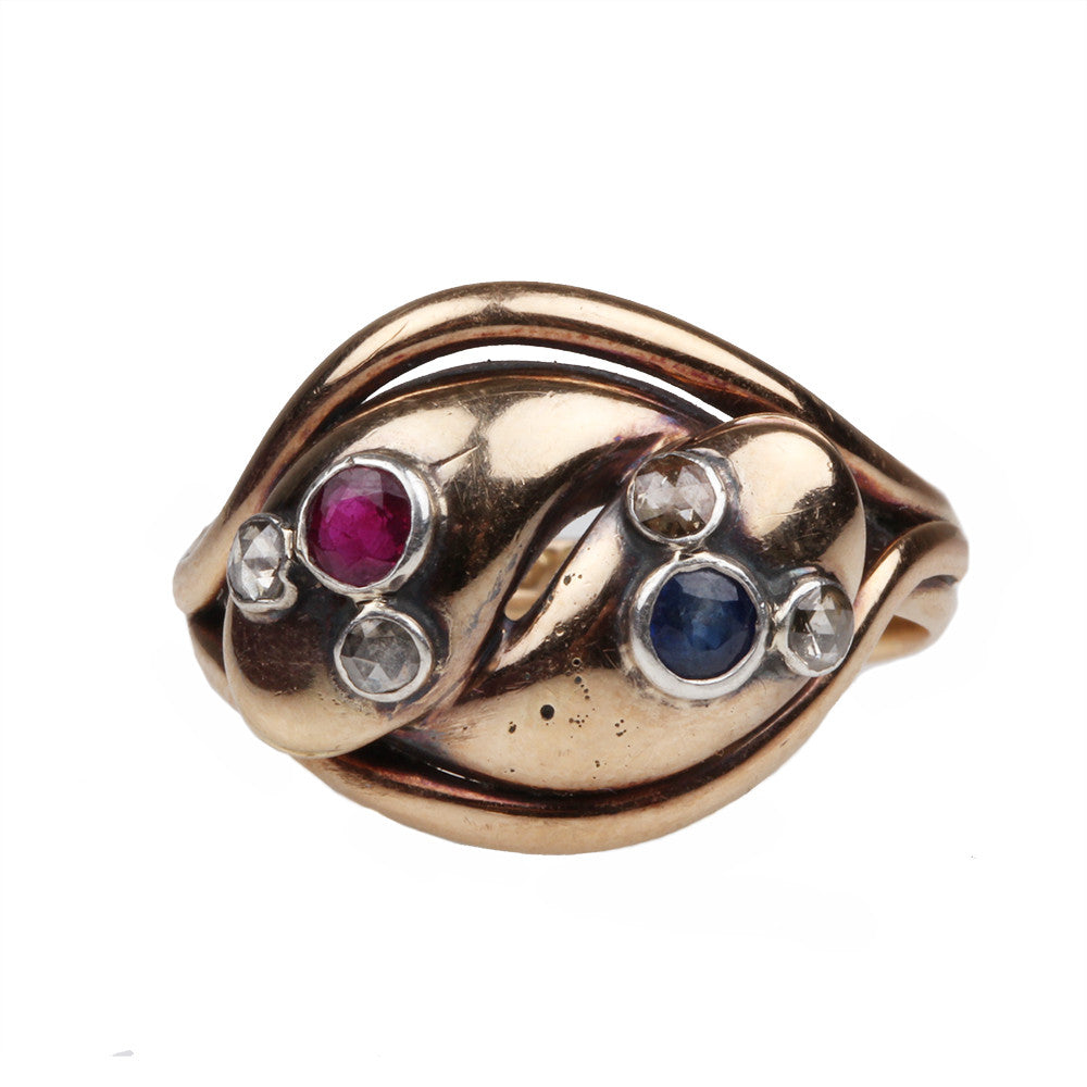 Victorian entwined snake ring, with sapphire, ruby and rose cut diamonds for eyes. Stones set in silver on 15ct gold. Circa 1860, Birmingham Hallmarks.