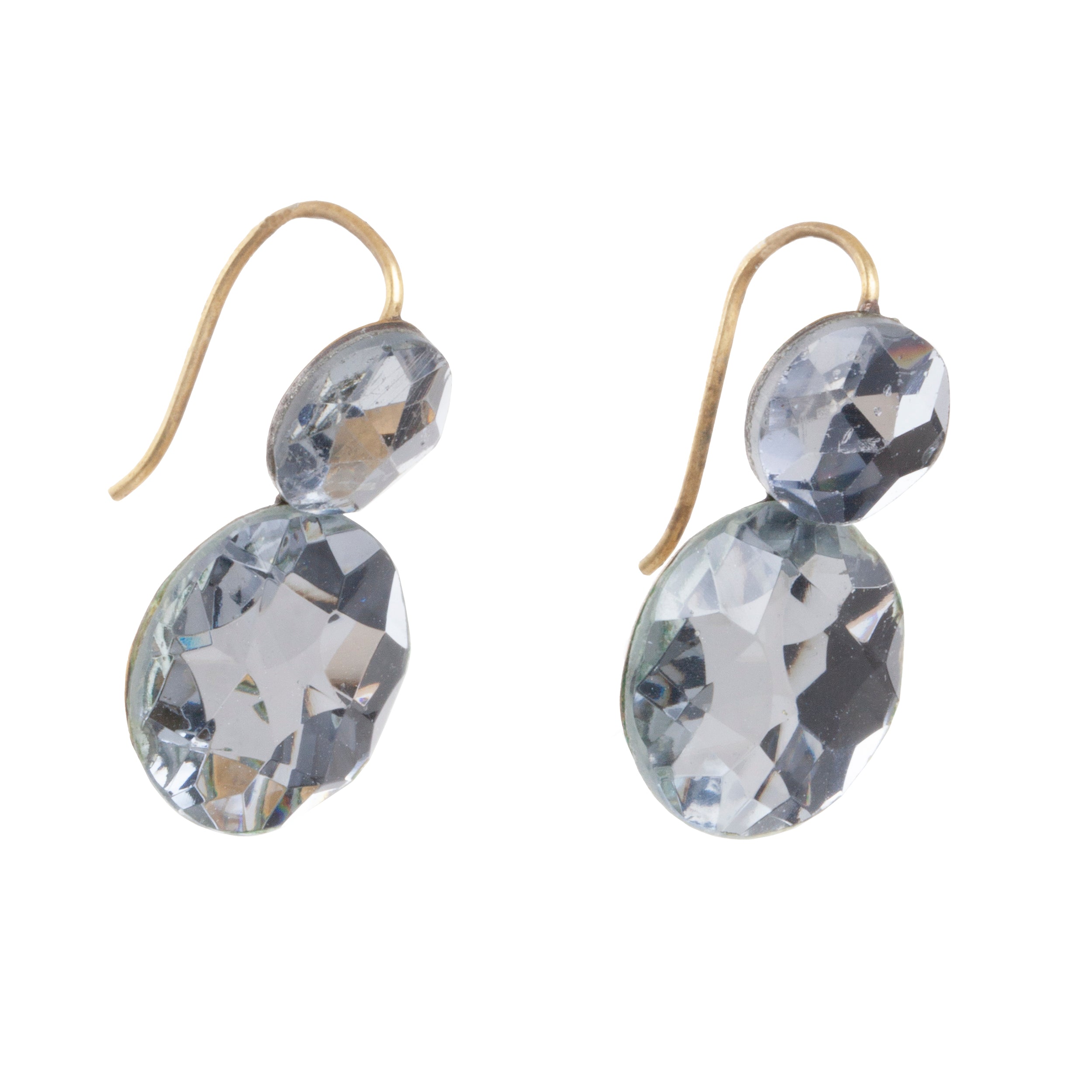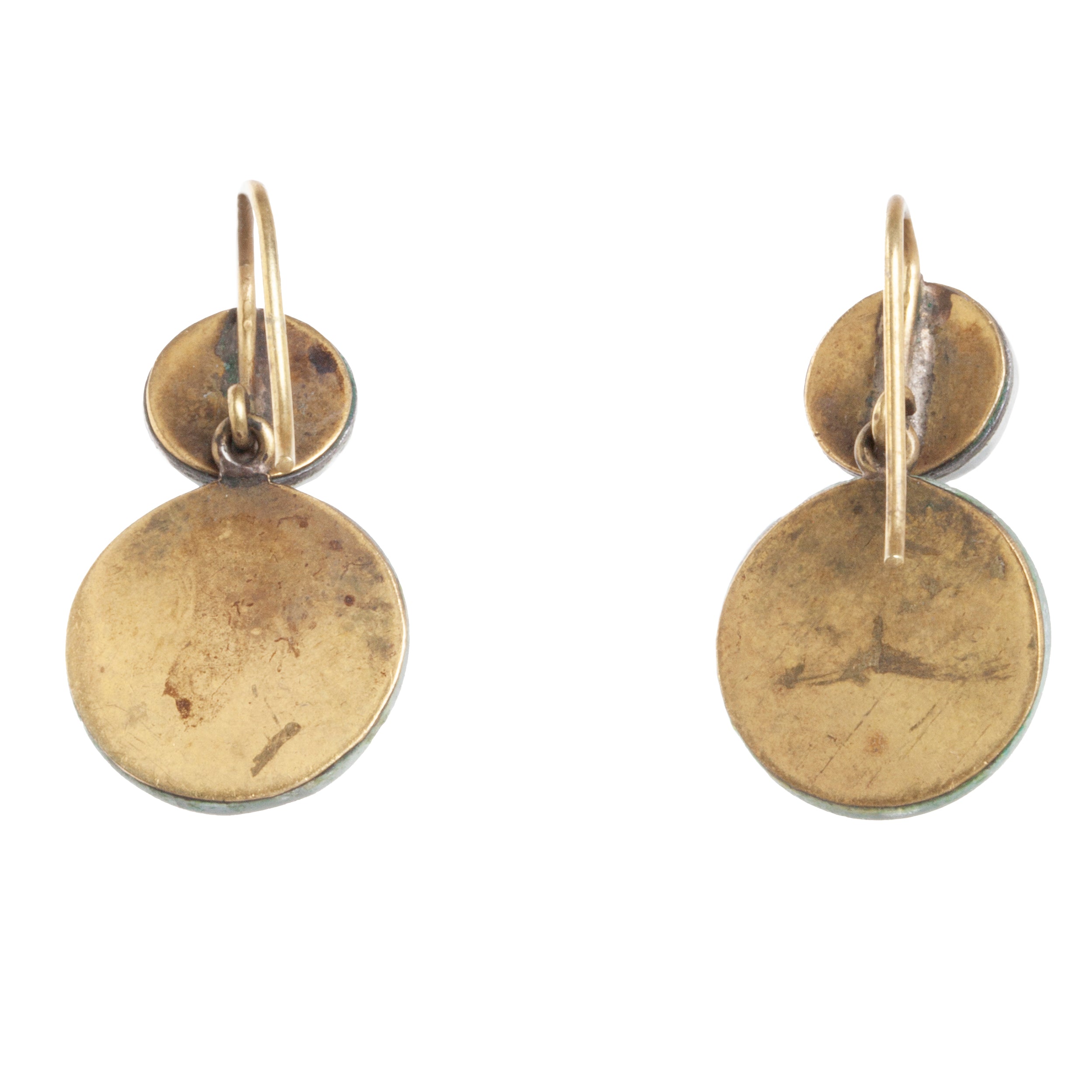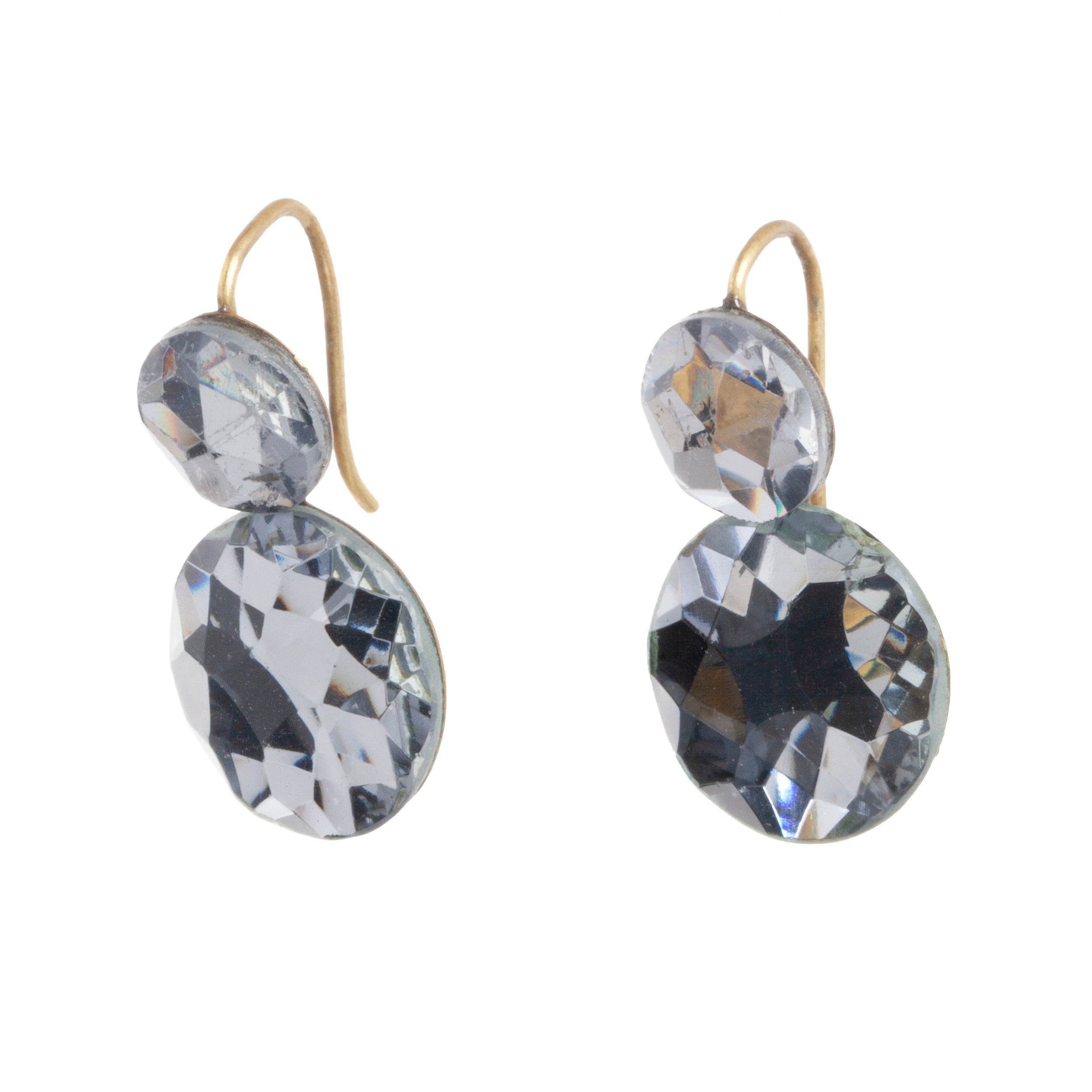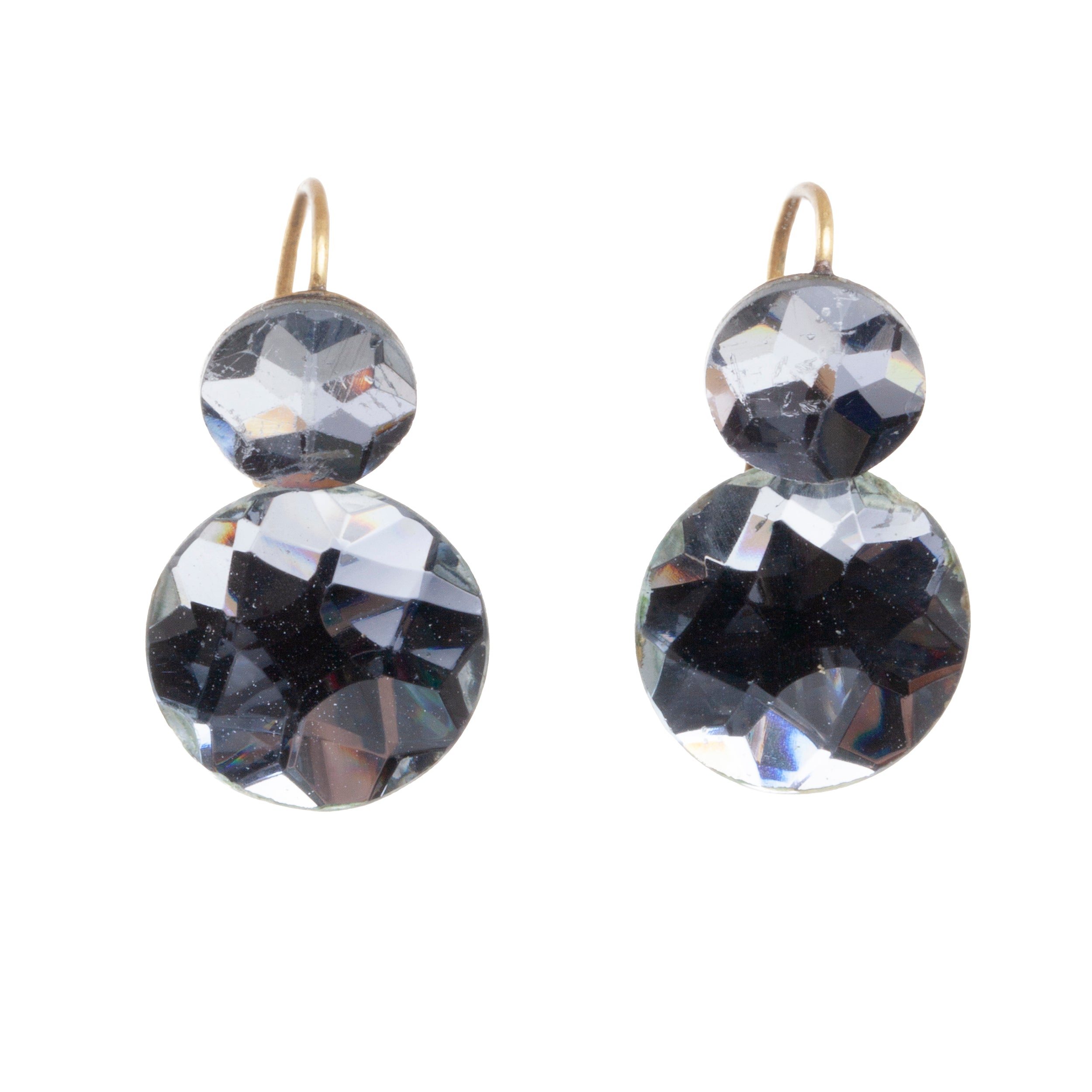 Rare Victorian Era Vauxhall glass earrings. Bright silver-colored mirrored glass on brass discs with original brass earring wires. Made at the Vauxhall Glassworks in London from the 18th century through the mid-19th. Circa 1860.