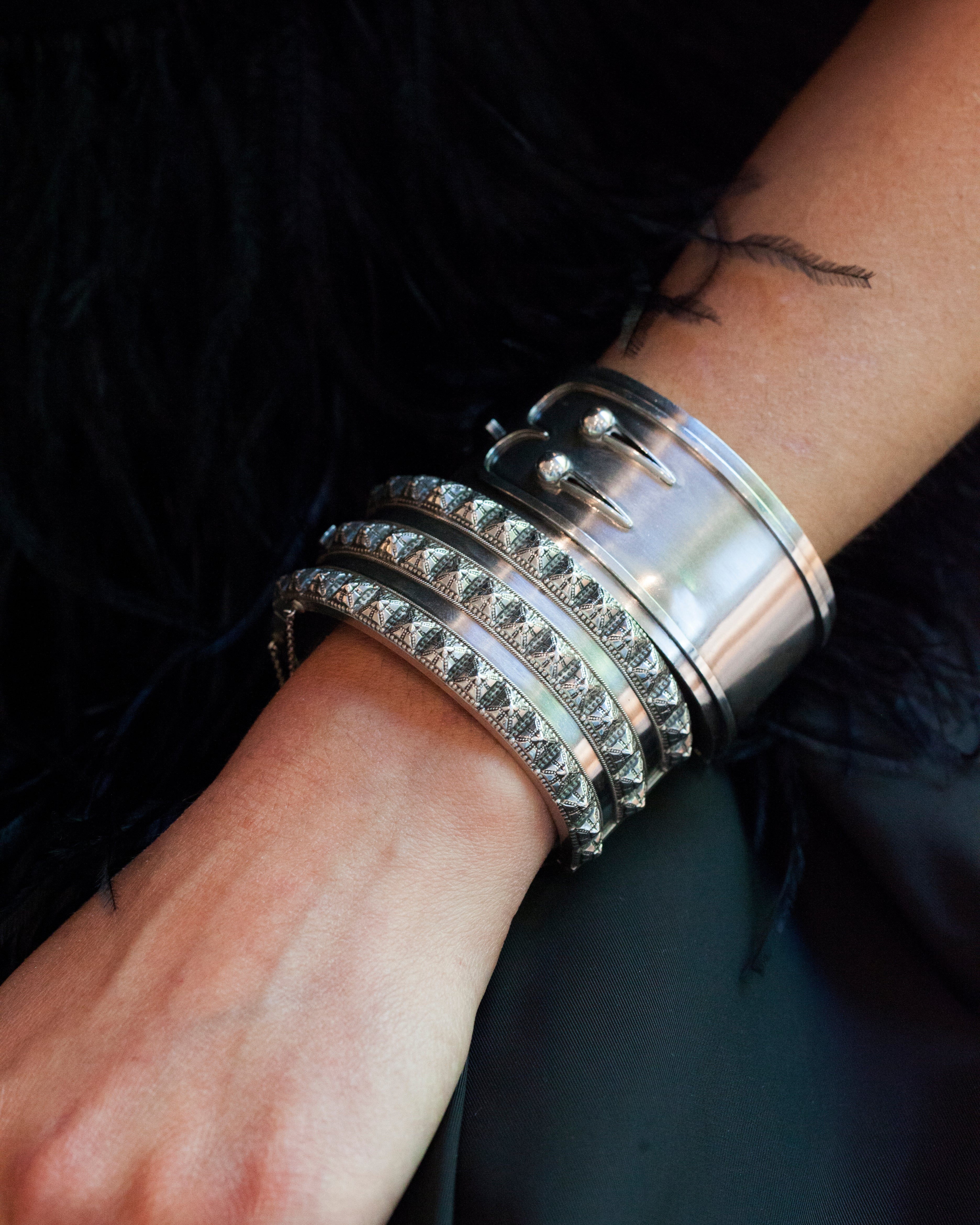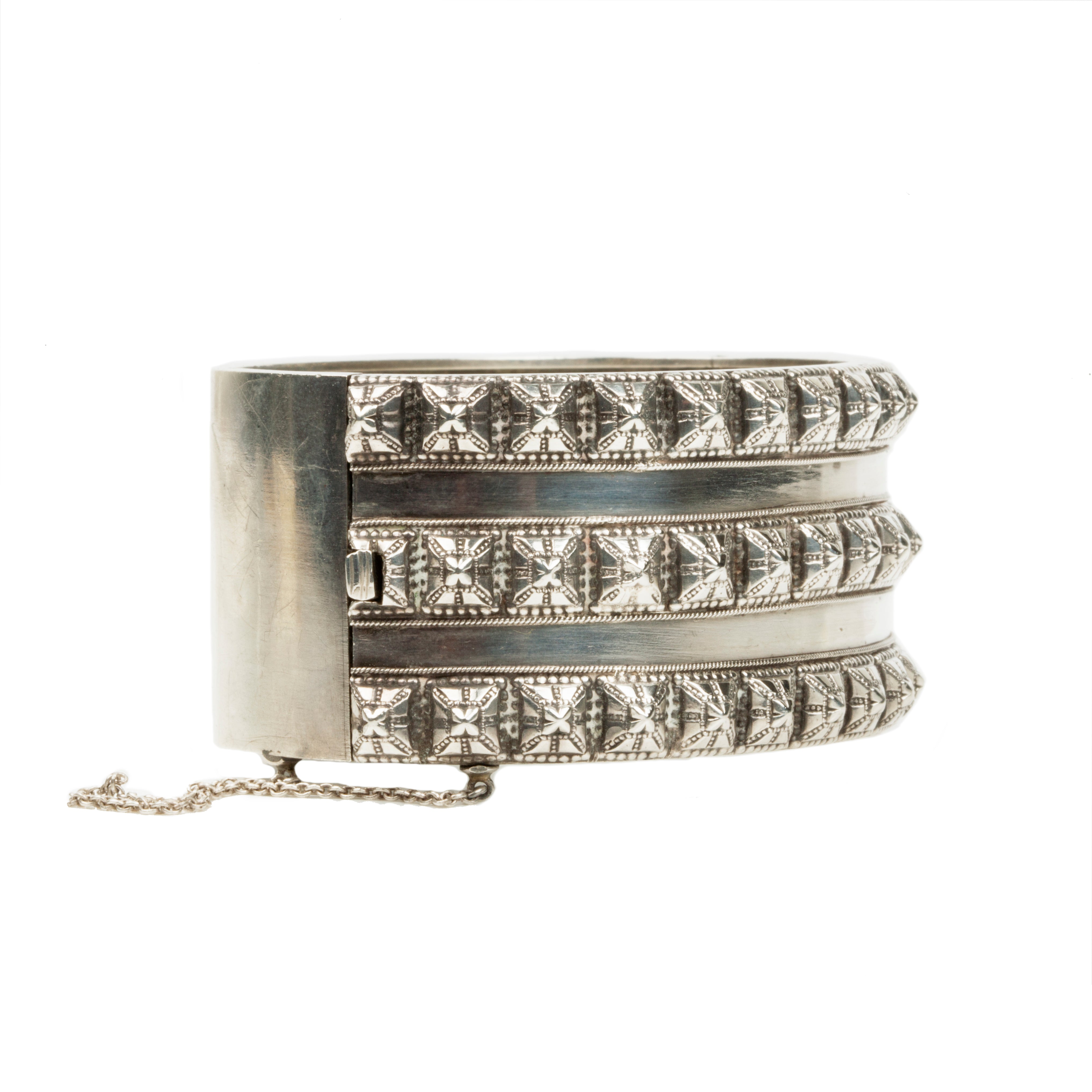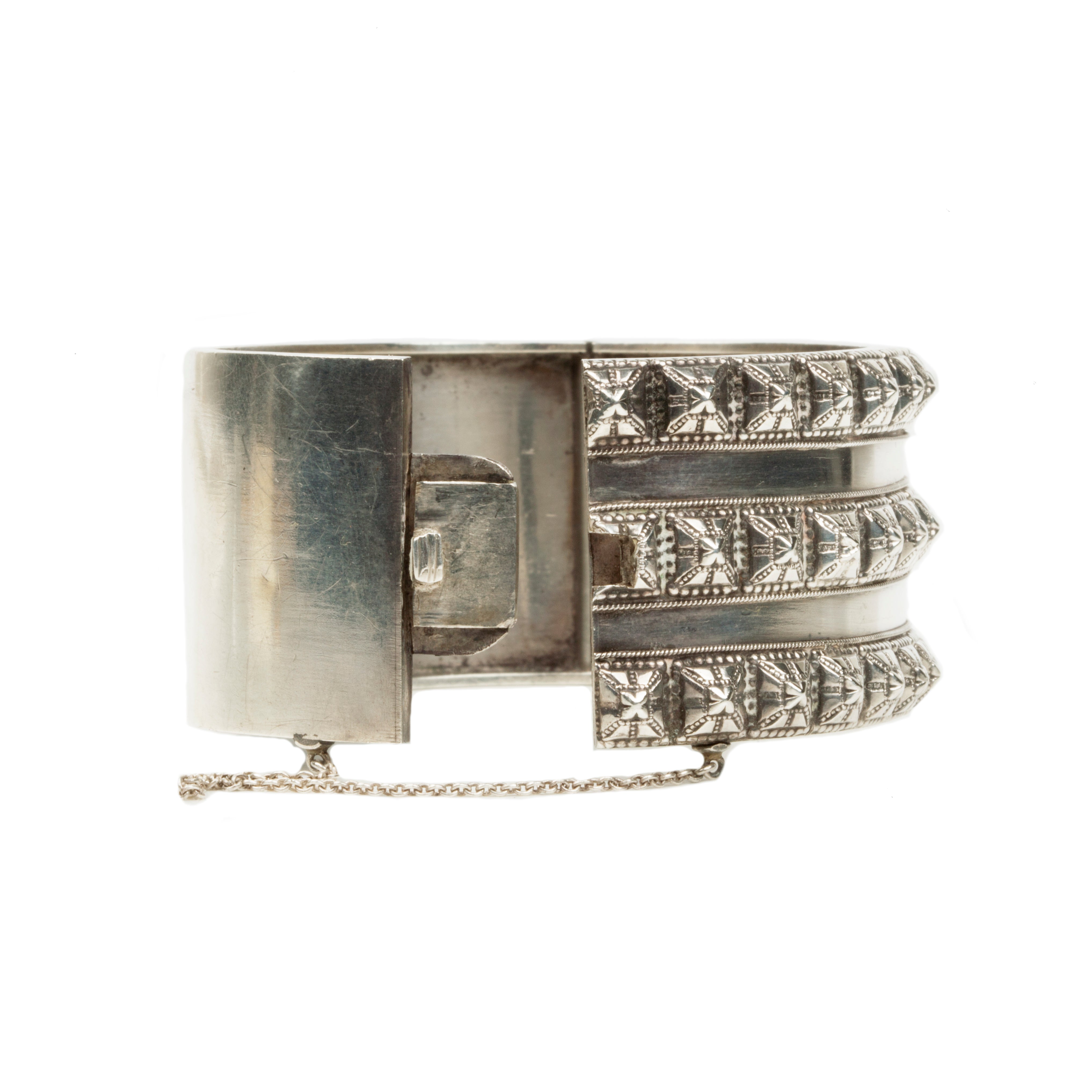 Great wide size for stacking or worn as an everyday bracelet. With safety chain and push clasp. Approximate 7" inner circumference and 1.25" in width.