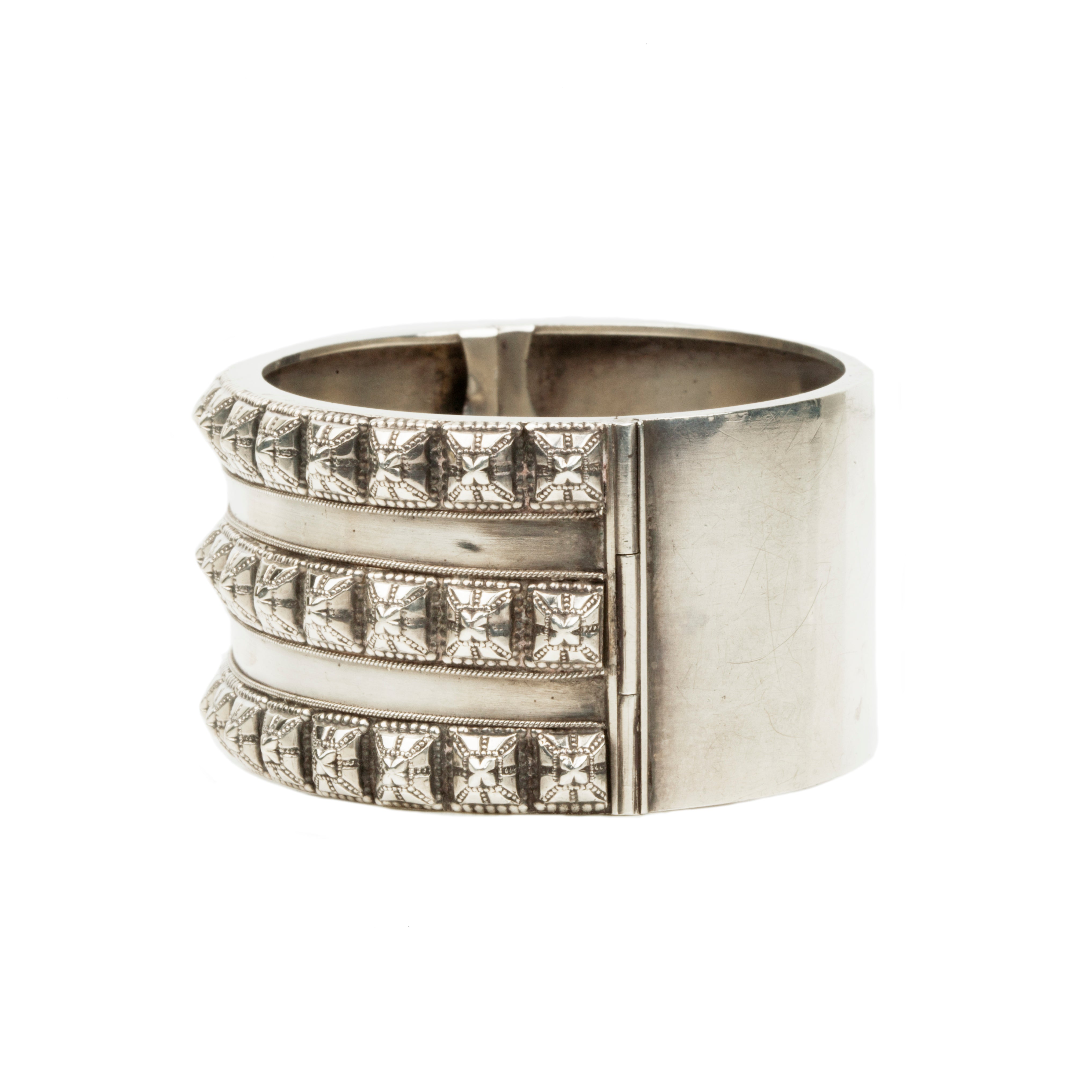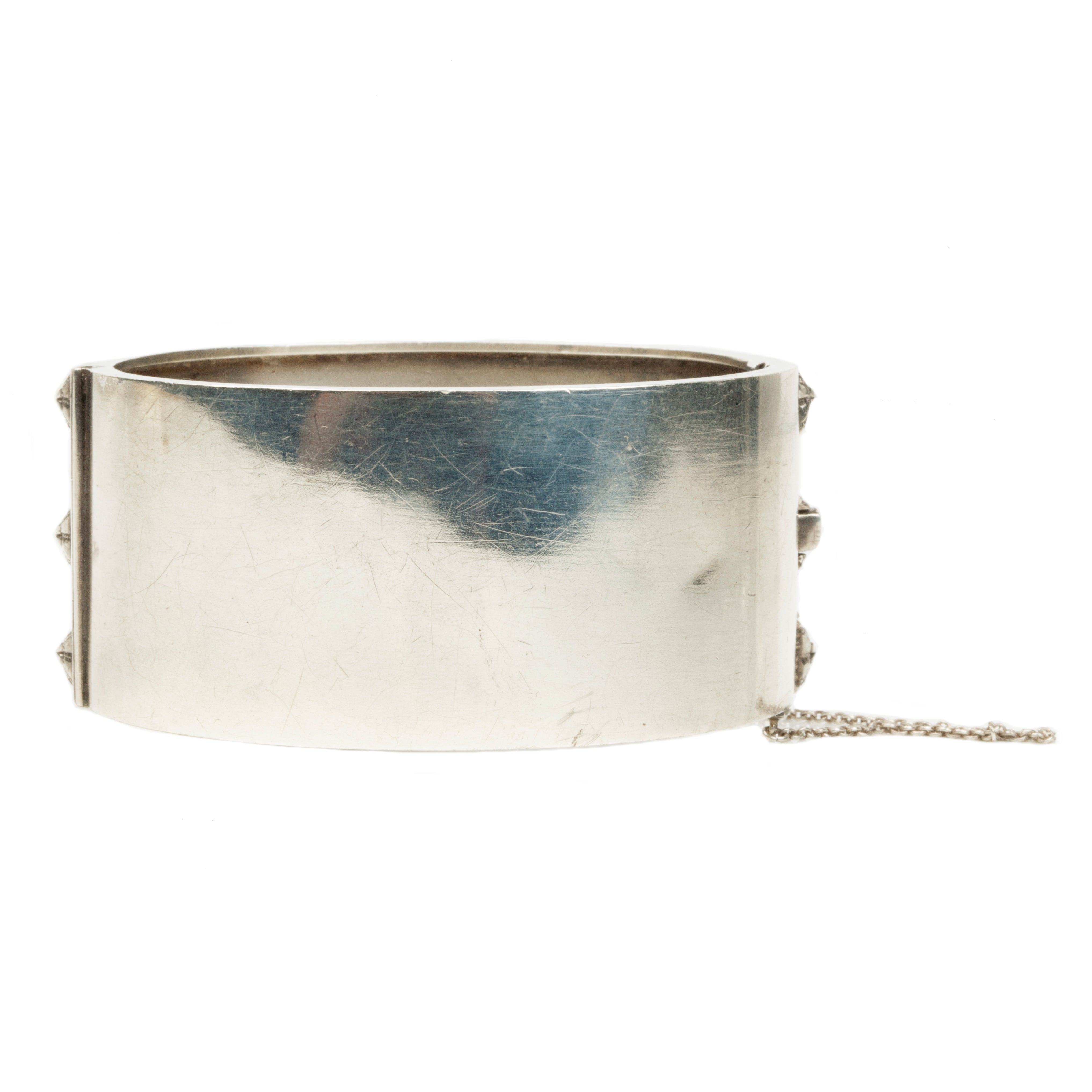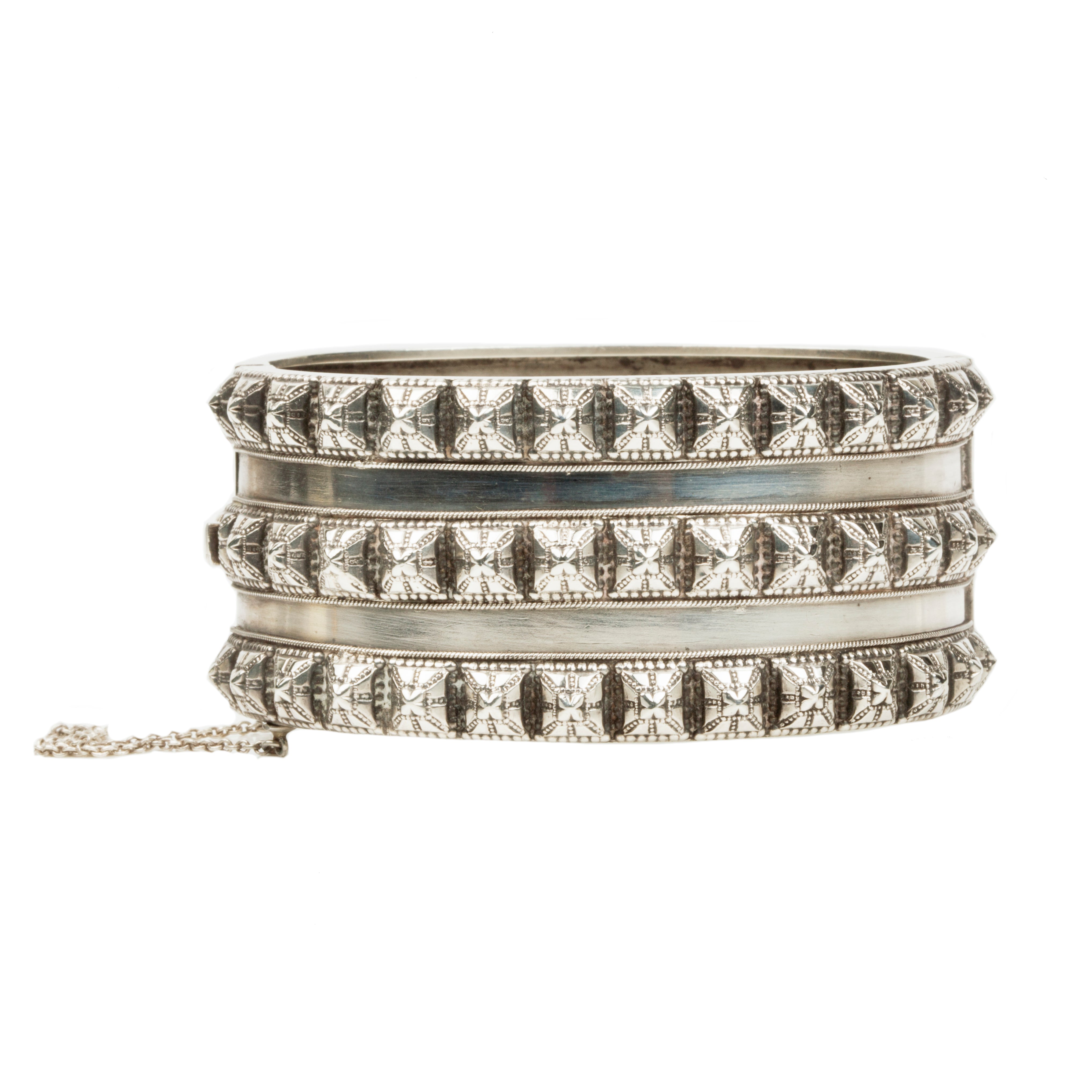 Victorian era sterling bangle with three rows of studded detail. Hallmarked, Birmingham 1878.